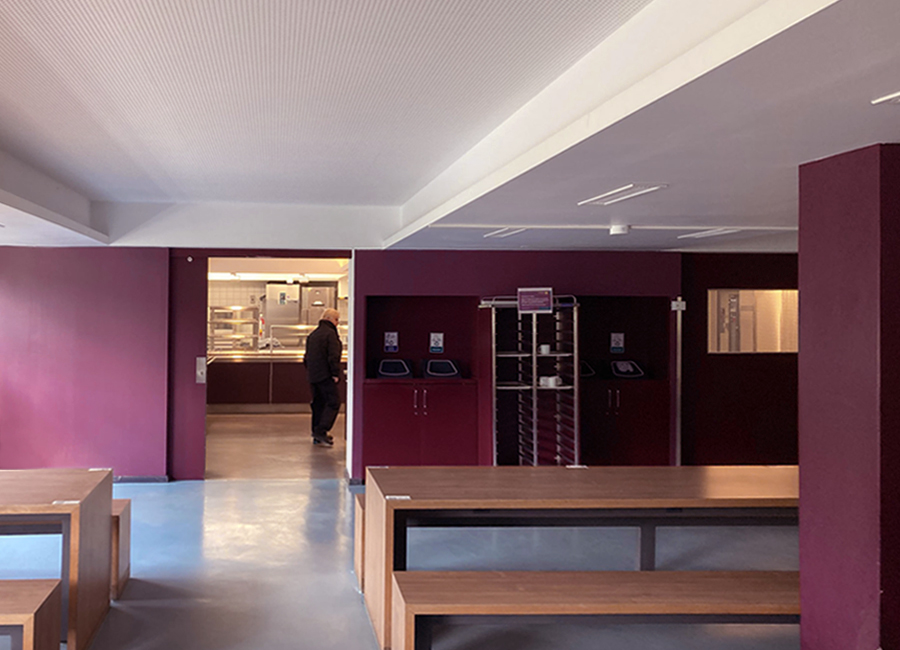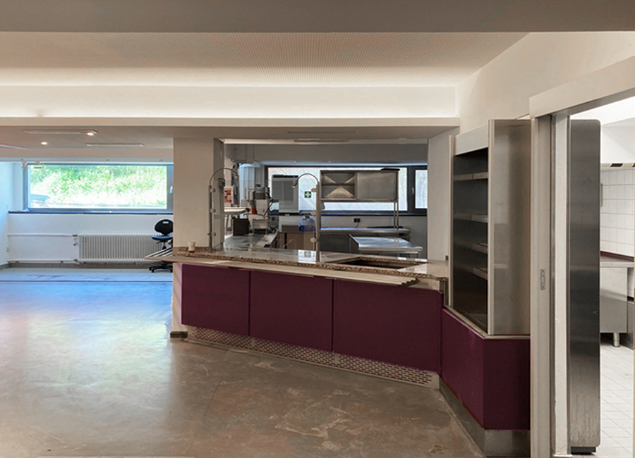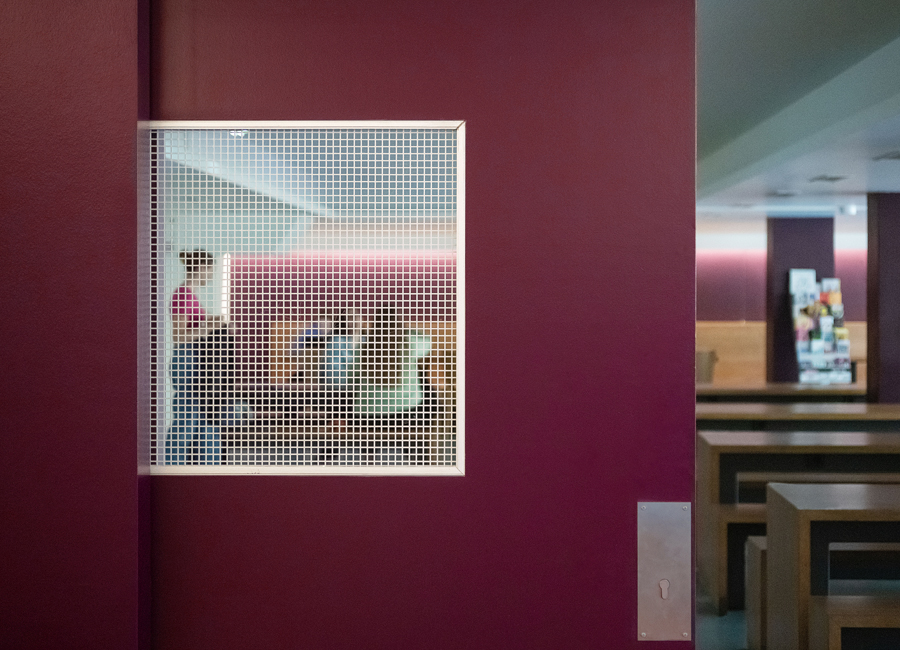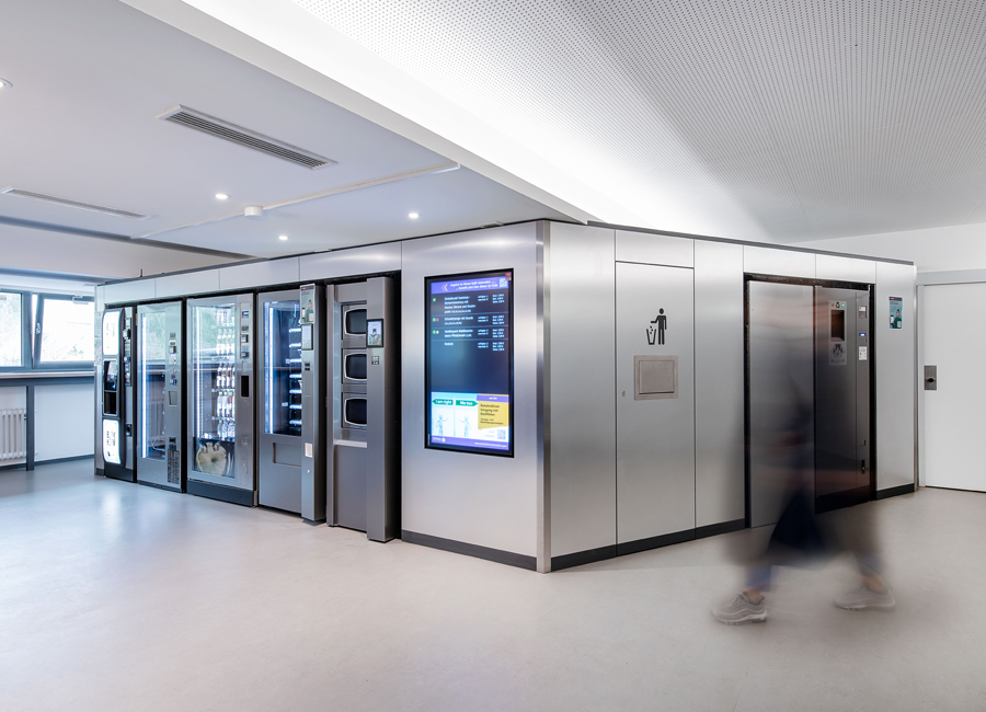 ...Vorhänge für entspannte Akustik und großzügige Bänke laden zum Verweilen ein. Die Gestaltung lehnt sich an den angrenzenden Aufenthaltsraum an, indem man sich trifft, lernt oder auch stärkt und ausruht. Die gekühlten warmen Speisen werden täglich frisch von der naheliegenden Mensa bestückt und können dann hier in der Mikrowelle aufgewärmt werden, alles natürlich auch über App als reservierte Vorbestellung möglich. Also natürlich ein bisschen mehr als beim Späti ums Eck ;-)