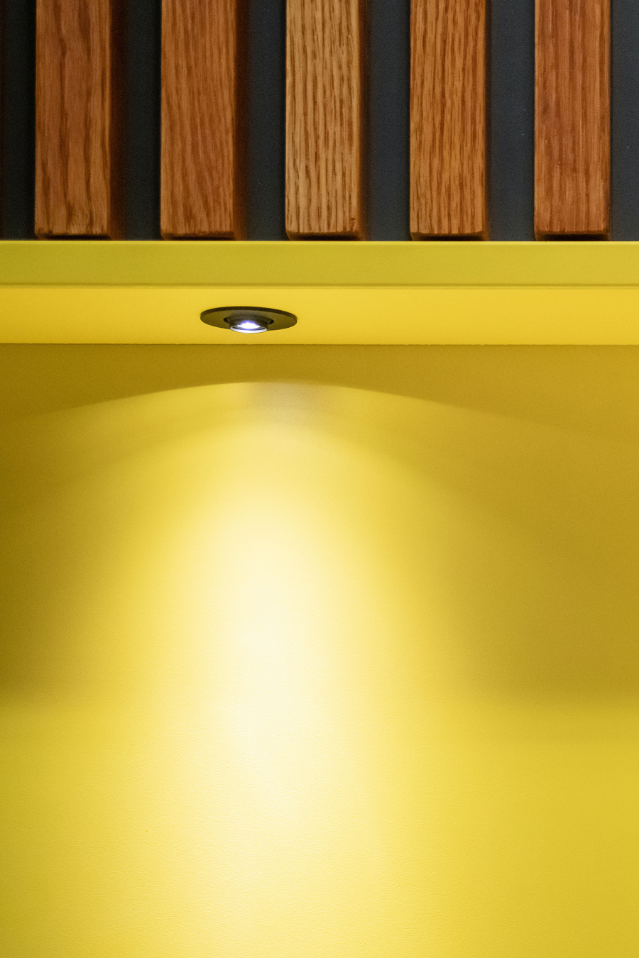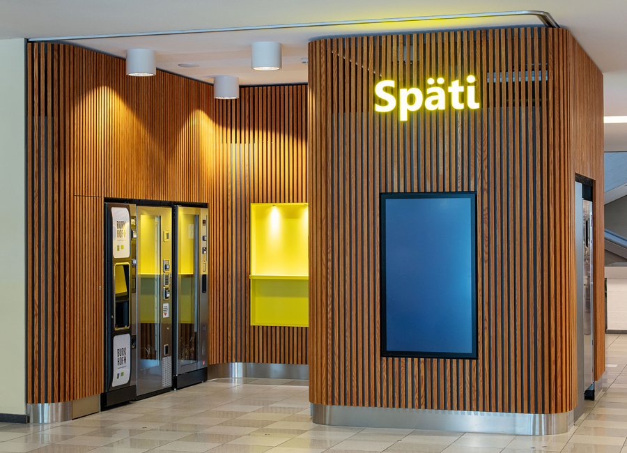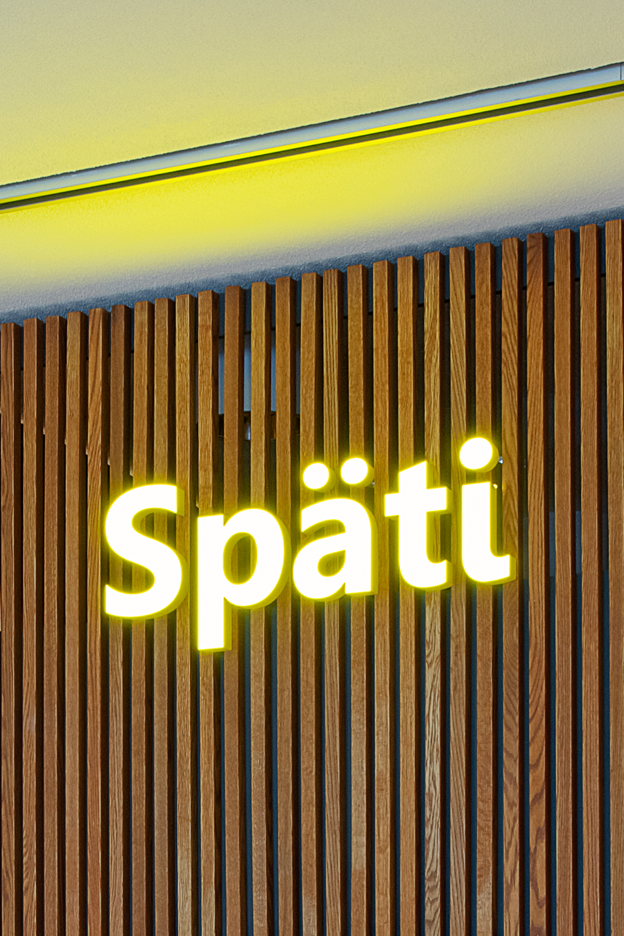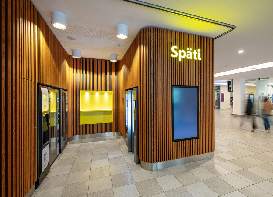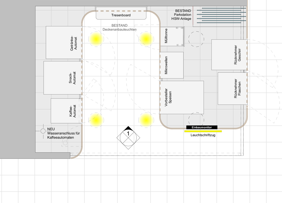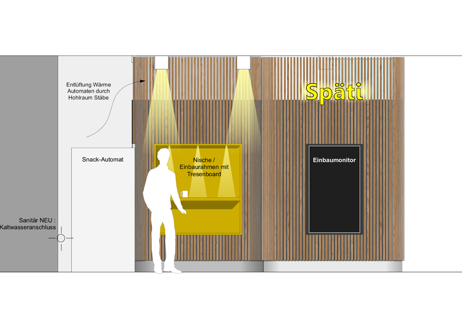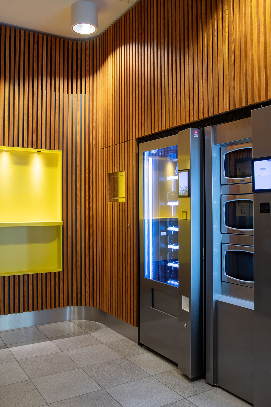...Cafeteria wieder auf. Das Holz der Lamellen wird hier speziell eingefärbt, um mit den bereits vorhandenen Fronten der anderen Angebote im Foyer zu korrespondieren. Unten hinterlegt, sind die Lamellen zu Gunsten der freien Belüftung der Automaten nach oben offen. Der Rückraum ist durch unsichtbare Tapetentüren in der Wand zu begehen. Die Geometrie der Lamellenwand wird der bestehenden Beleuchtung angepasst, um sie teilweise nachhaltig zu erhalten. Eine leuchtend gelbe Nische zum kurzen Verweilen setzt einen eigenen Akzent in diesem Foyer, in dem jeder Bereich mit einer eigenen Farbe kodiert ist. Der leuchtende Schriftzug ist eine warme Einladung auch nach Feierabend der Mensen.