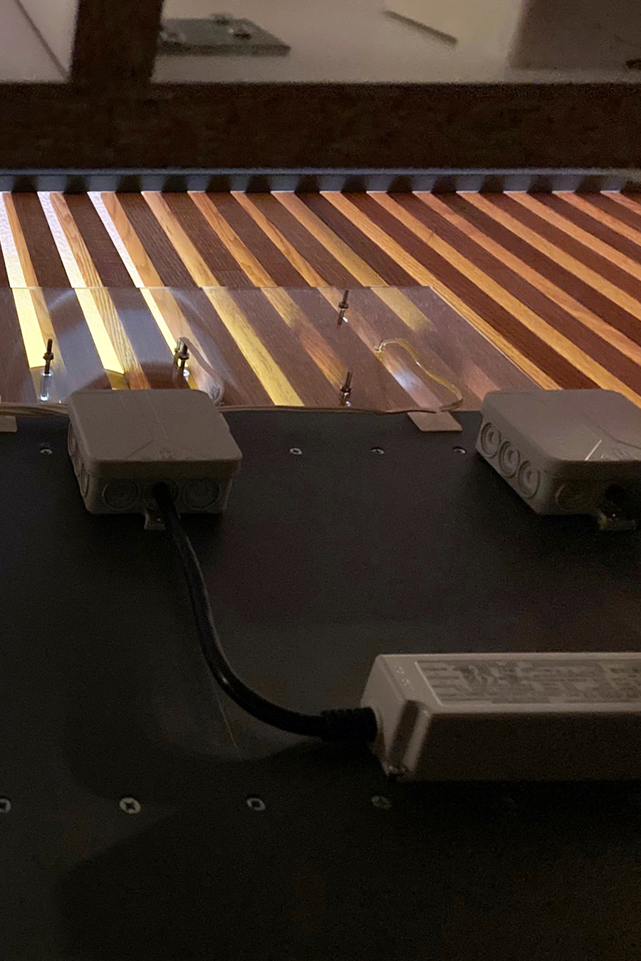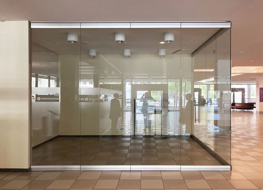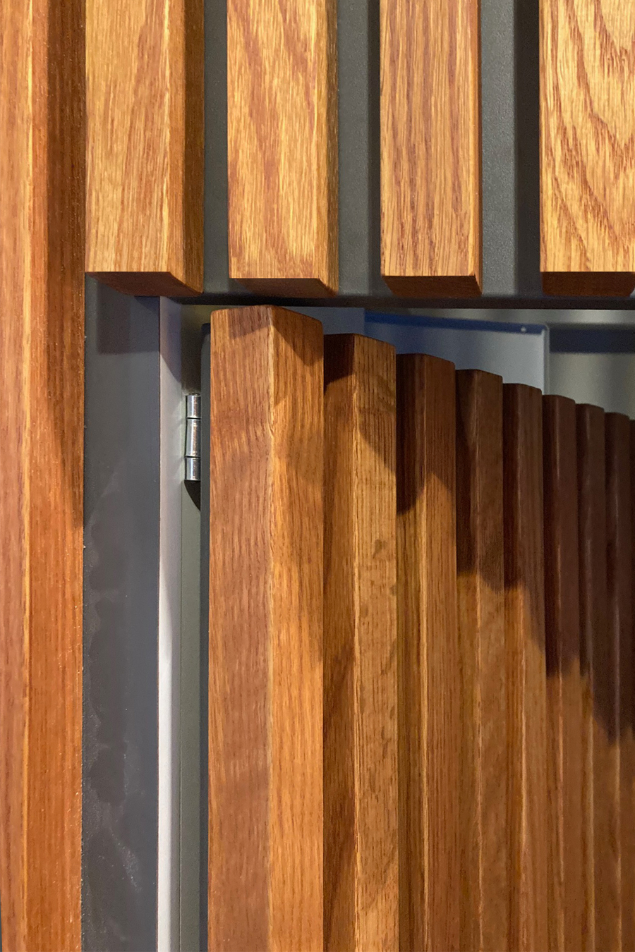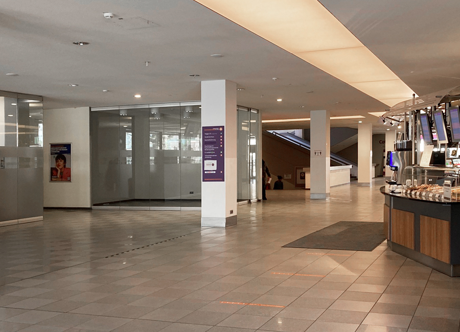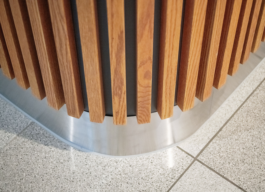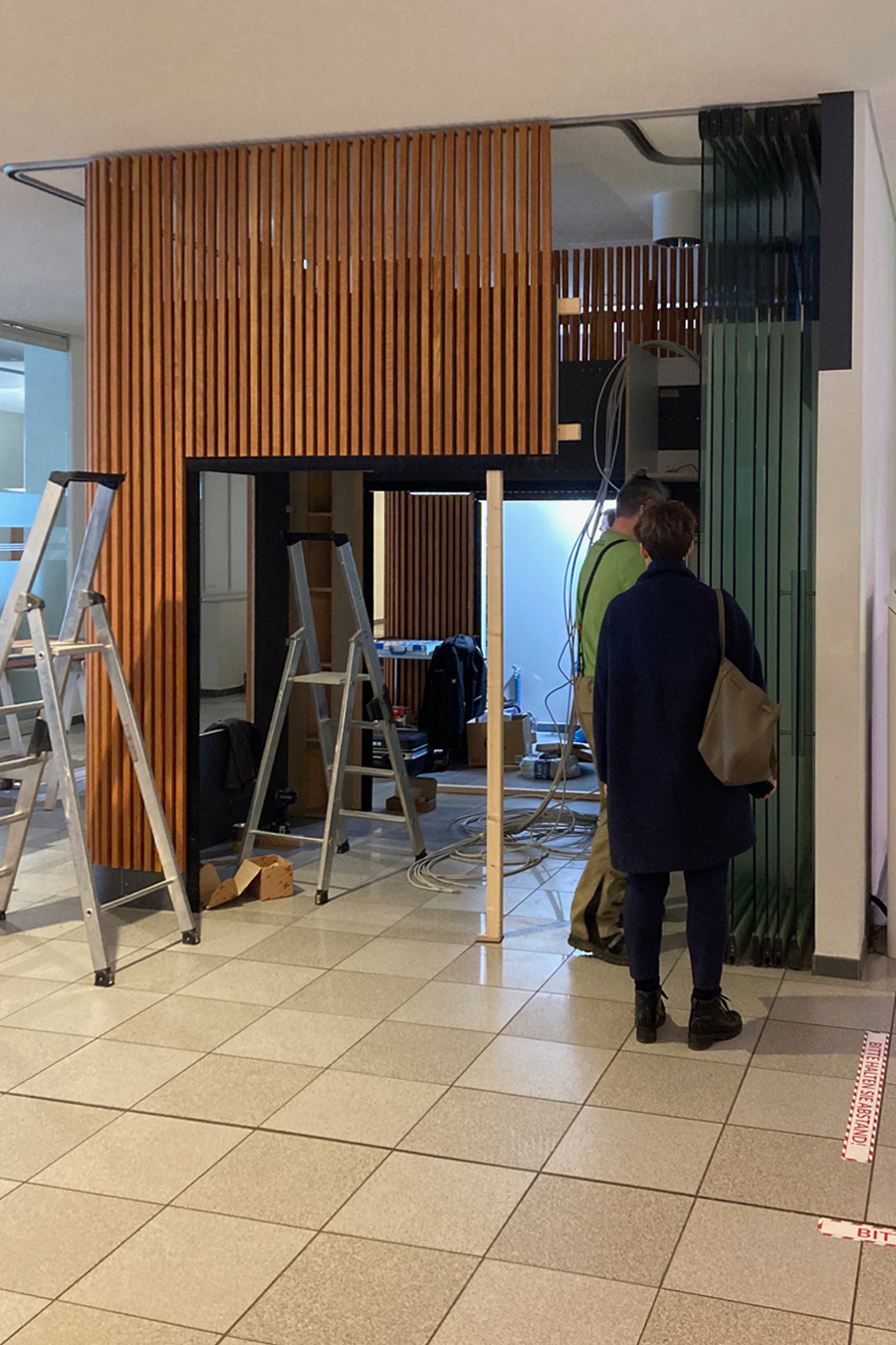 ...Cafeteria wieder auf. Das Holz der Lamellen wird hier speziell eingefärbt, um mit den bereits vorhandenen Fronten der anderen Angebote im Foyer zu korrespondieren. Unten hinterlegt, sind die Lamellen zu Gunsten der freien Belüftung der Automaten nach oben offen. Der Rückraum ist durch unsichtbare Tapetentüren in der Wand zu begehen. Die Geometrie der Lamellenwand wird der bestehenden Beleuchtung angepasst, um sie teilweise nachhaltig zu erhalten. Eine leuchtend gelbe Nische zum kurzen Verweilen setzt einen eigenen Akzent in diesem Foyer, in dem jeder Bereich mit einer eigenen Farbe kodiert ist. Der leuchtende Schriftzug ist eine warme Einladung auch nach Feierabend der Mensen.