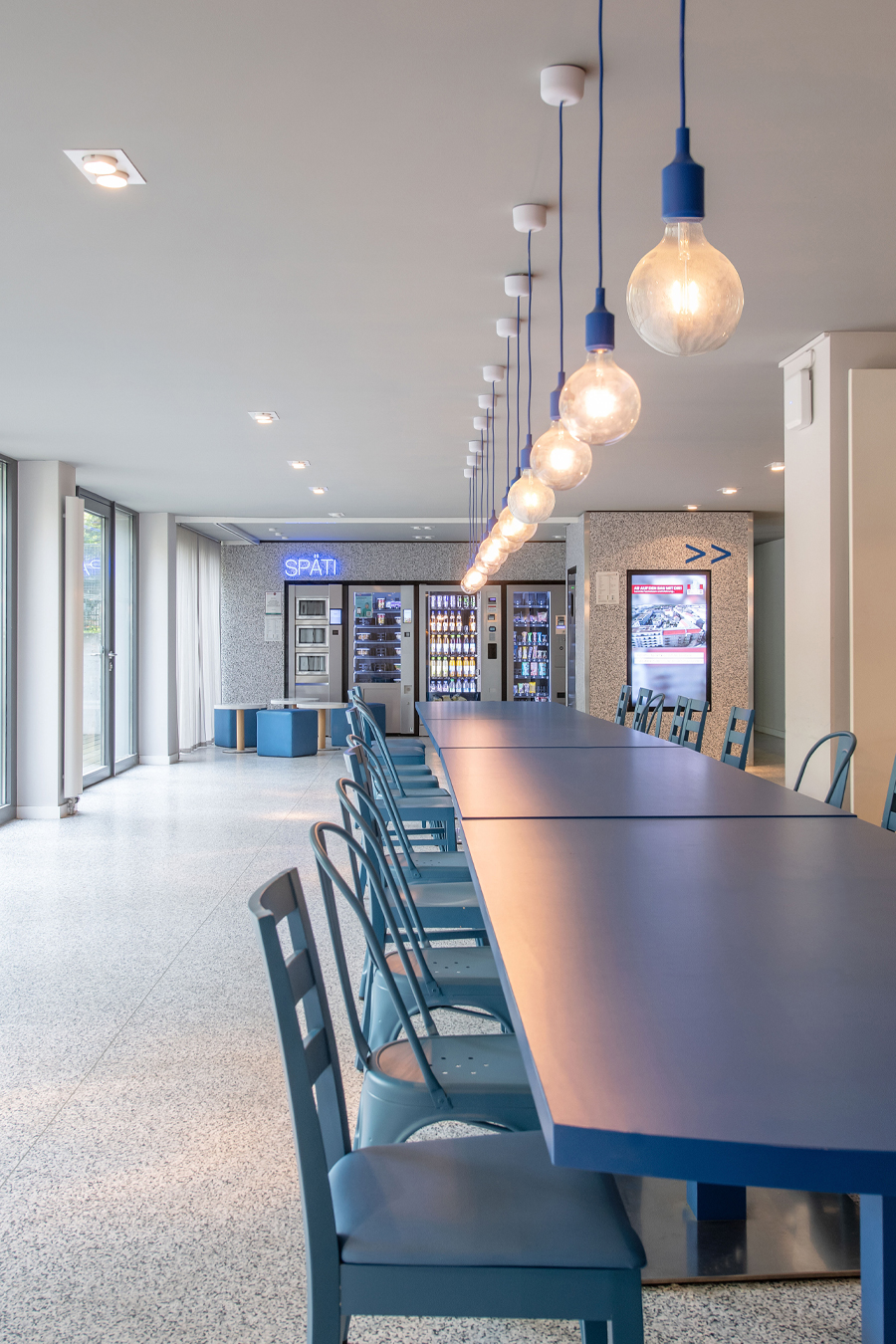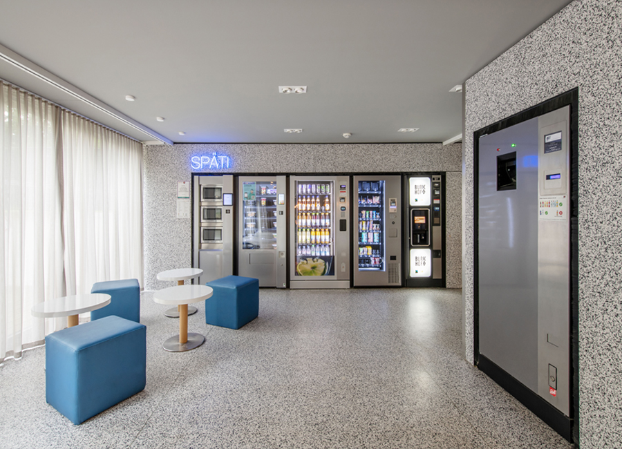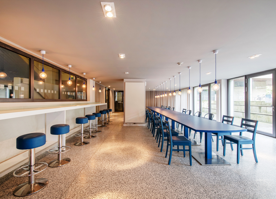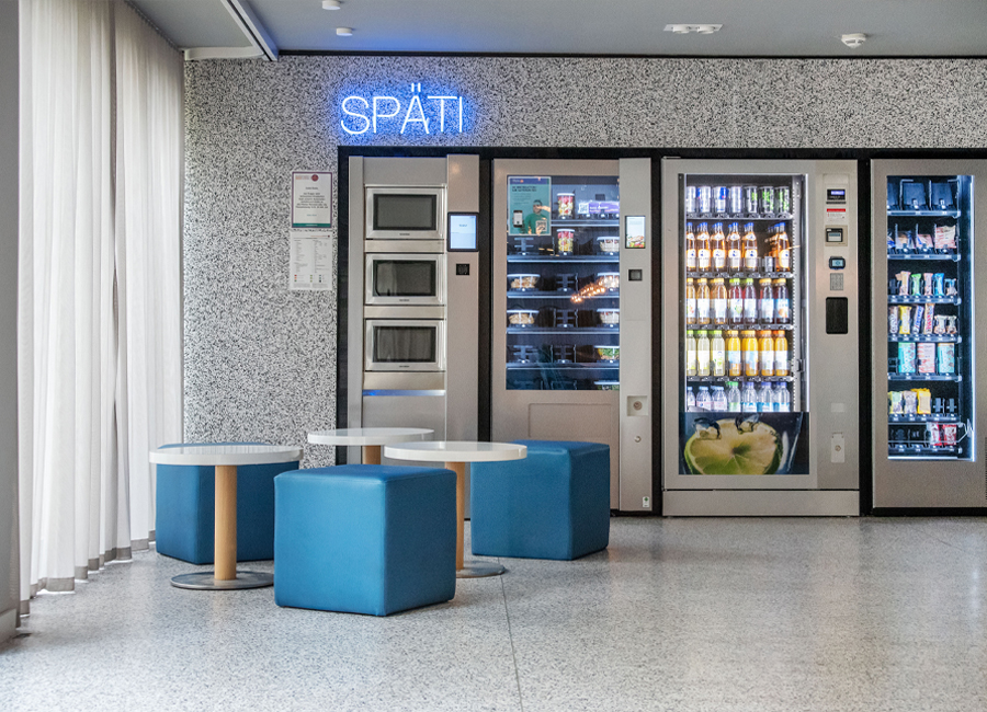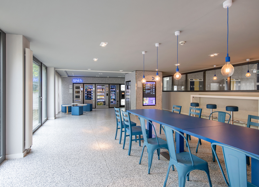 Der Bodenbelag muss erneuert werden und findet nun auch seine Fortsetzung in der Front der Automatenwand. Hier gibt es kalte und warme Getränke, Snacks und warme Speisen. Diese warmen Gerichte, täglich frisch in der Mensa zubereitet, werden gekühlt vorgehalten und können dann in den Mikrowellen aufgewärmt werden, Buchung, Reservierung und Bezahlung per App. Alles natürlich in Mehrwegverpackung mit Geschirr- und Pfandrücknehmern in der Automatenwand. Üppige Vorhänge an allen Wandflächen und vor den bodentiefen Fenstern zum begrünten Hof sorgen für entspannte Akustik. Eine lange Tafel aus recycelten Bestandsmöbeln und stimmungsvolle Beleuchtung sorgt für gemütliche Gastlichkeit.