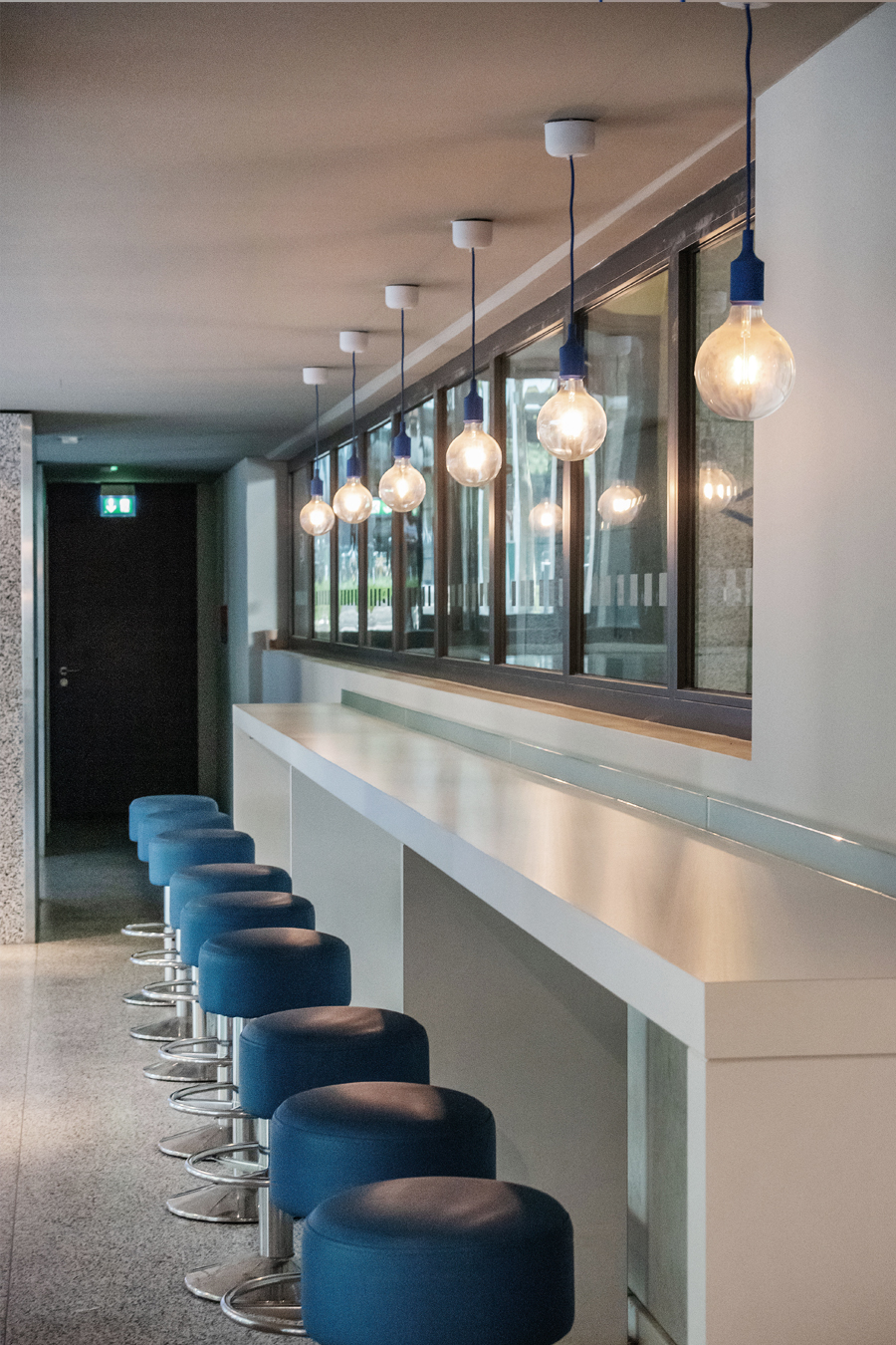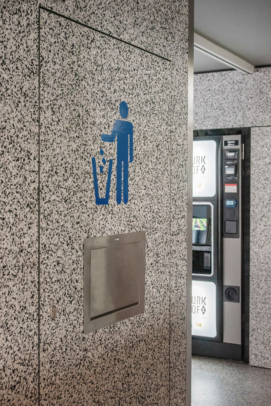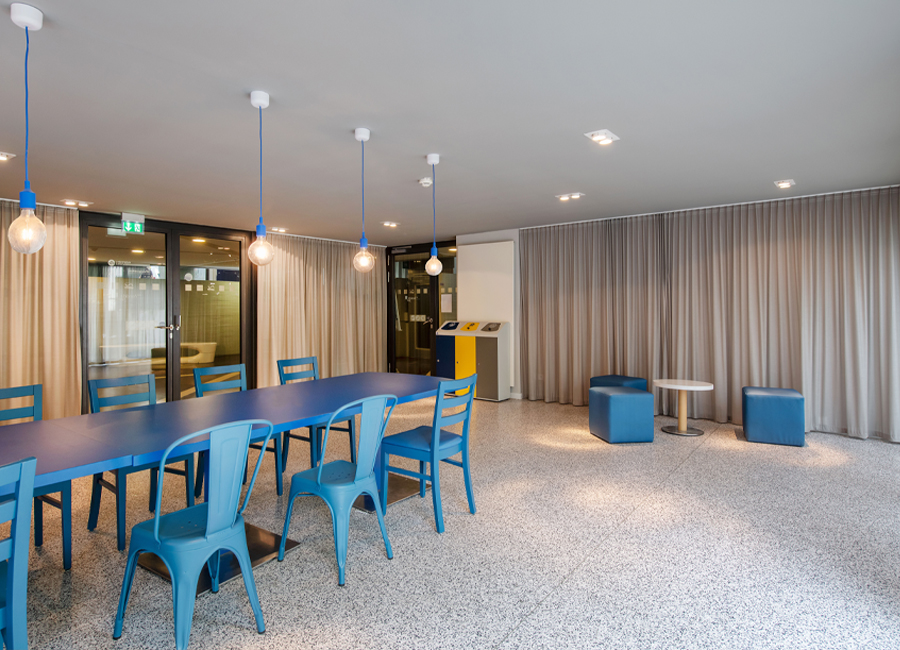Der Bodenbelag muss erneuert werden und findet nun auch seine Fortsetzung in der Front der Automatenwand. Hier gibt es kalte und warme Getränke, Snacks und warme Speisen. Diese warmen Gerichte, täglich frisch in der Mensa zubereitet, werden gekühlt vorgehalten und können dann in den Mikrowellen aufgewärmt werden, Buchung, Reservierung und Bezahlung per App. Alles natürlich in Mehrwegverpackung mit Geschirr- und Pfandrücknehmern in der Automatenwand. Üppige Vorhänge an allen Wandflächen und vor den bodentiefen Fenstern zum begrünten Hof sorgen für entspannte Akustik. Eine lange Tafel aus recycelten Bestandsmöbeln und stimmungsvolle Beleuchtung sorgt für gemütliche Gastlichkeit.