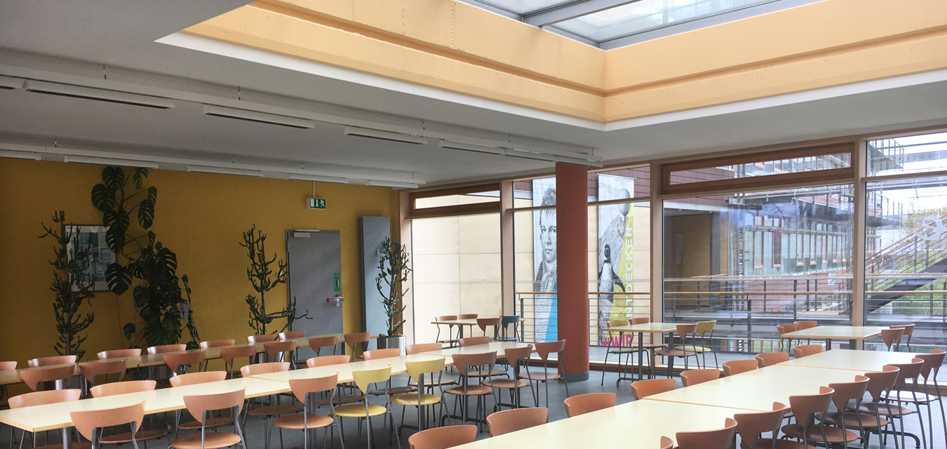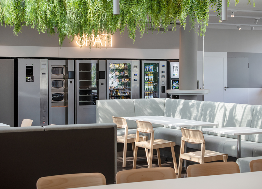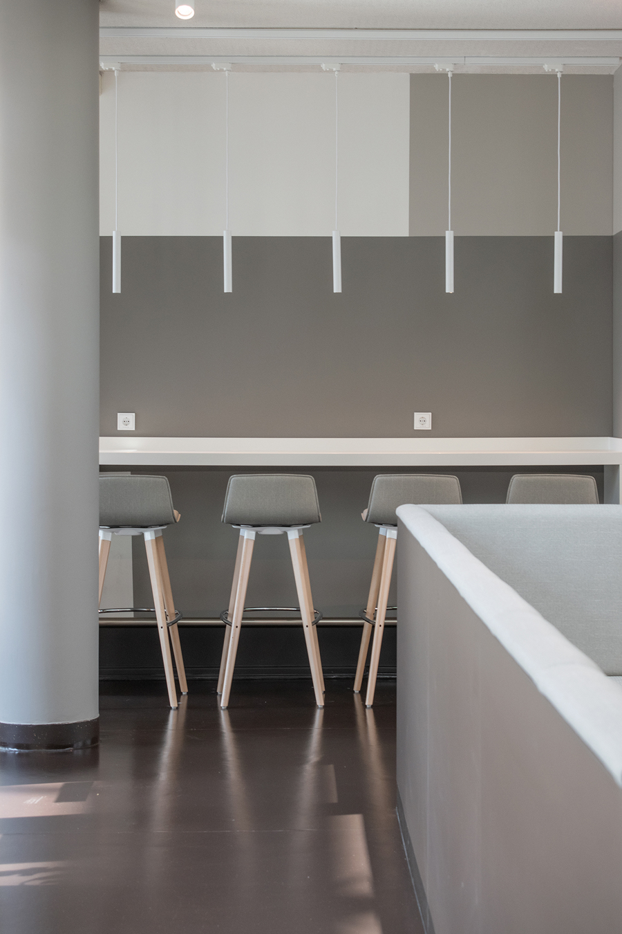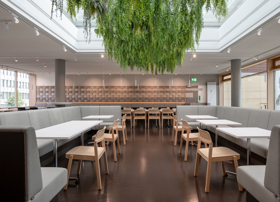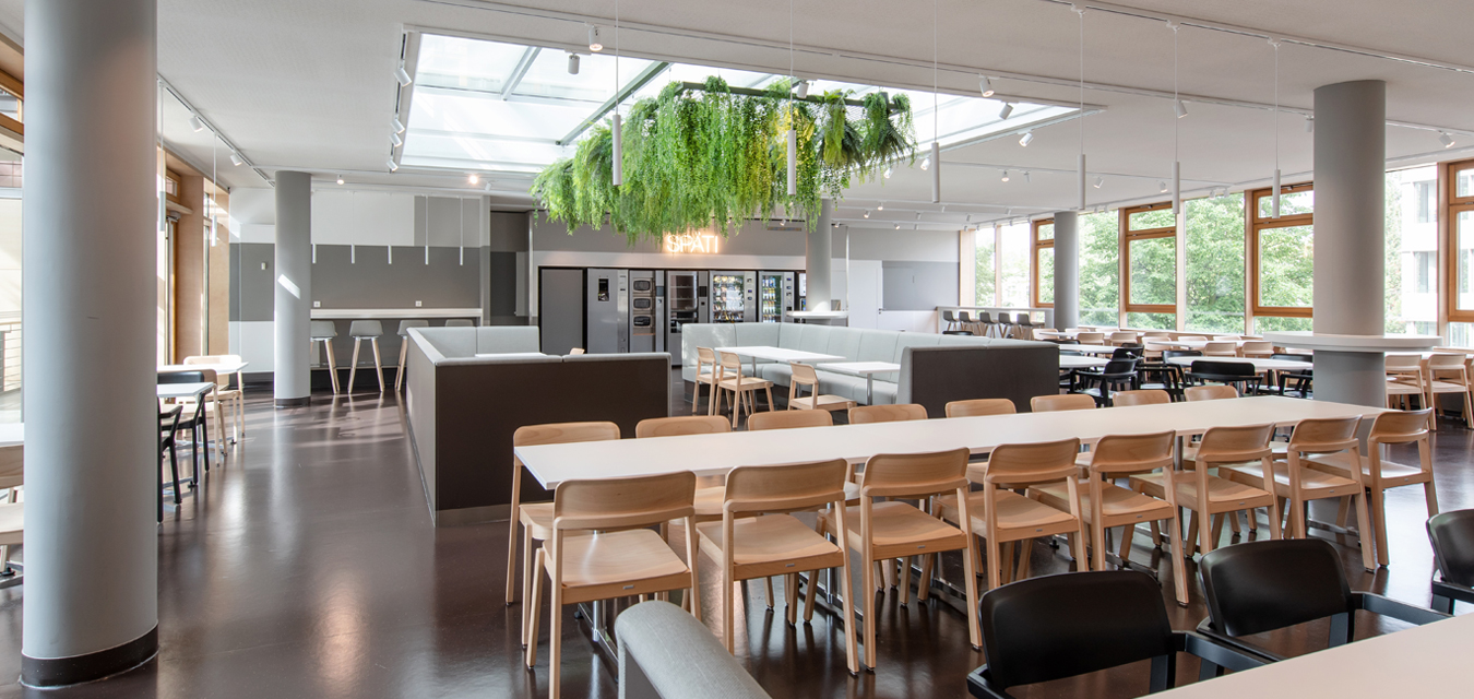 Das zentrale große Oberlichtfenster wird durch einen hängenden Garten betont und schafft so einen Blickfang in der Mitte dieses tiefen Raumes. Unterschiedliche Sitzgelegenheiten bieten individuelle Angebote, die Pause zu verbringen: auf die Schnelle am Stehtisch am Eingang, allein und konzentriert am kleinen Tisch am Fenster oder in der Gruppe an der langen Tafel.
