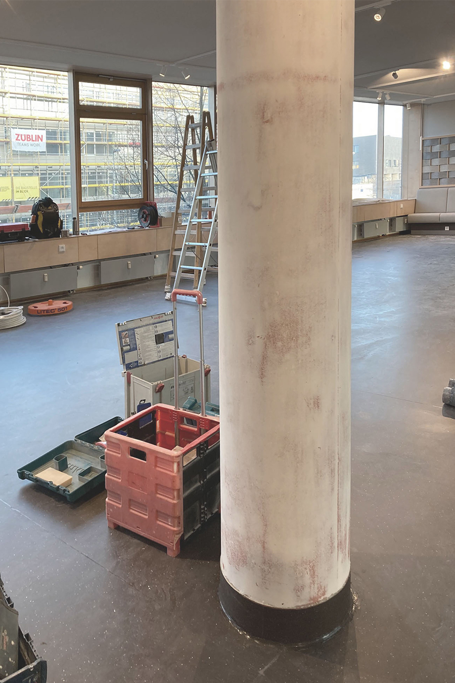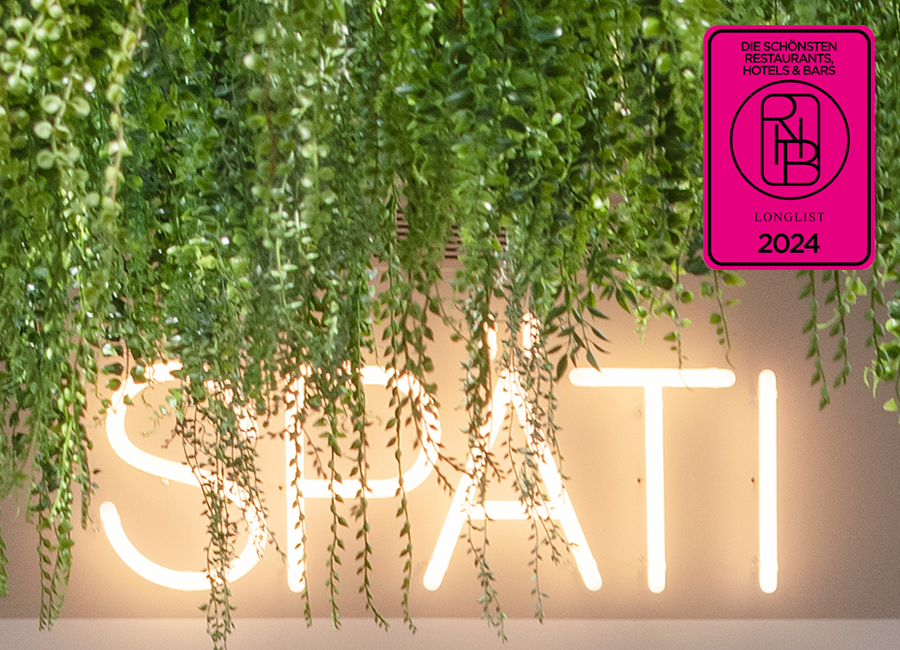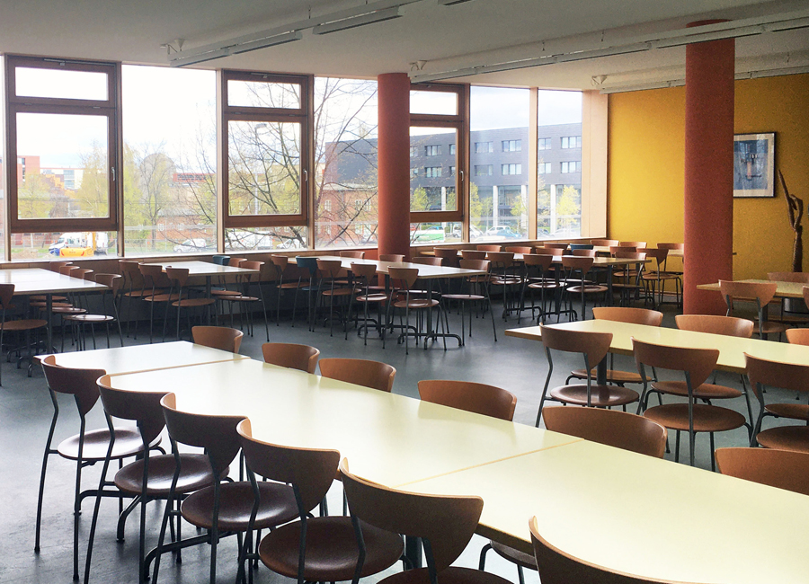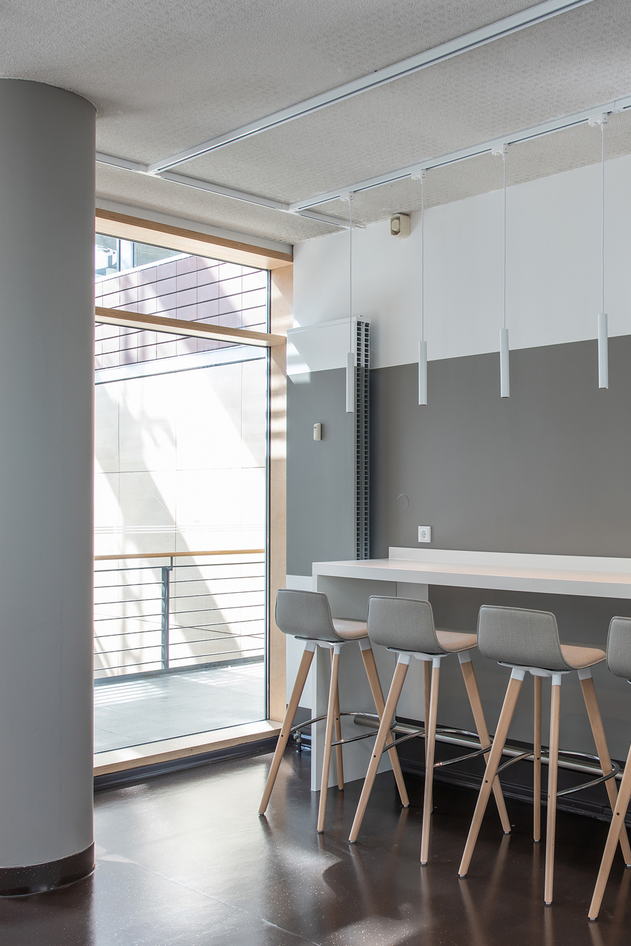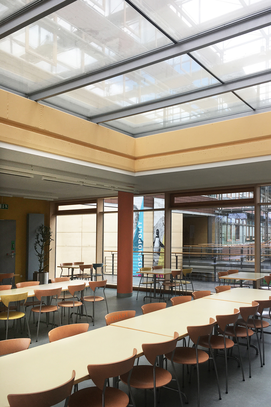 Das zentrale große Oberlichtfenster wird durch einen hängenden Garten betont und schafft so einen Blickfang in der Mitte dieses tiefen Raumes. Unterschiedliche Sitzgelegenheiten bieten individuelle Angebote, die Pause zu verbringen: auf die Schnelle am Stehtisch am Eingang, allein und konzentriert am kleinen Tisch am Fenster oder in der Gruppe an der langen Tafel.