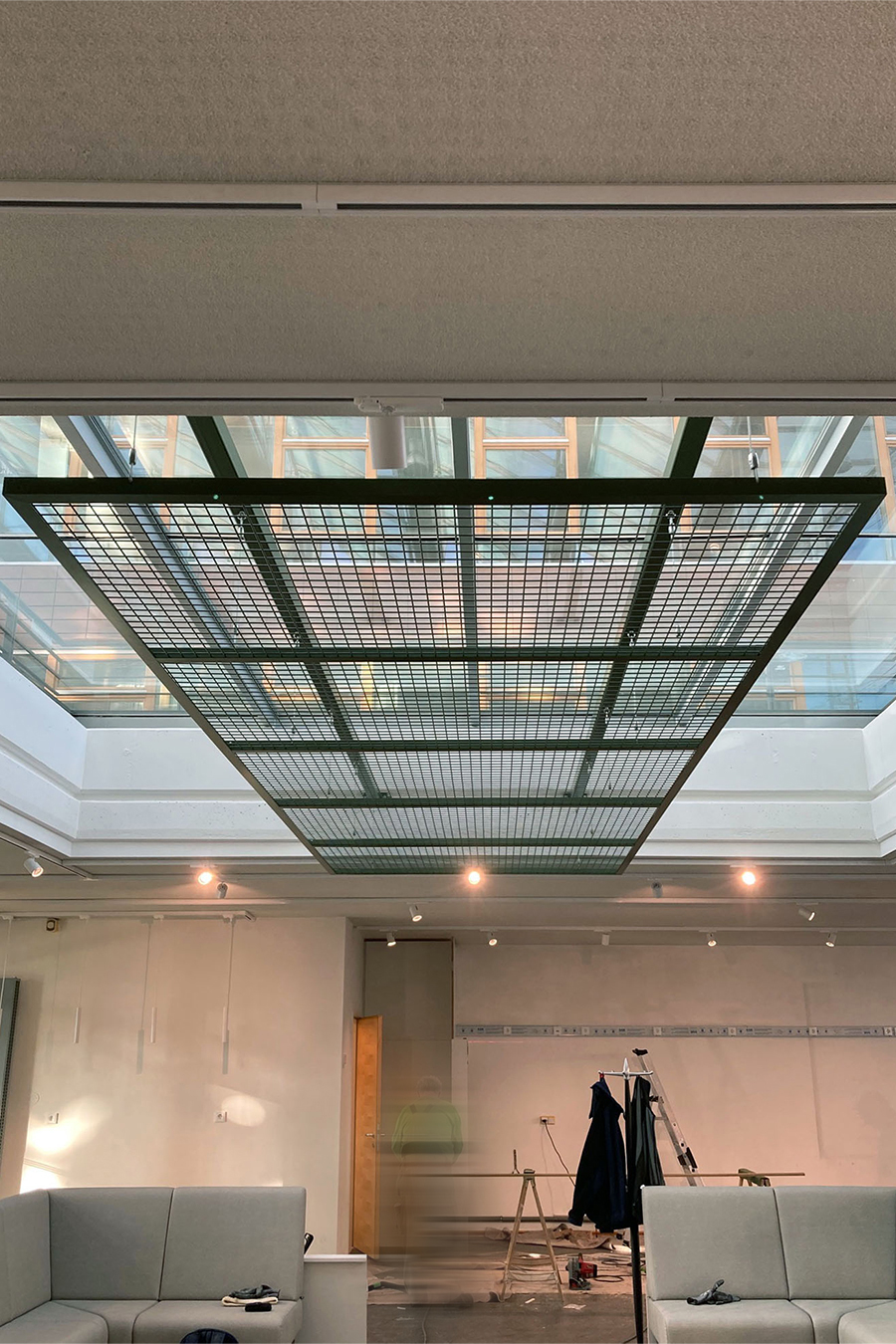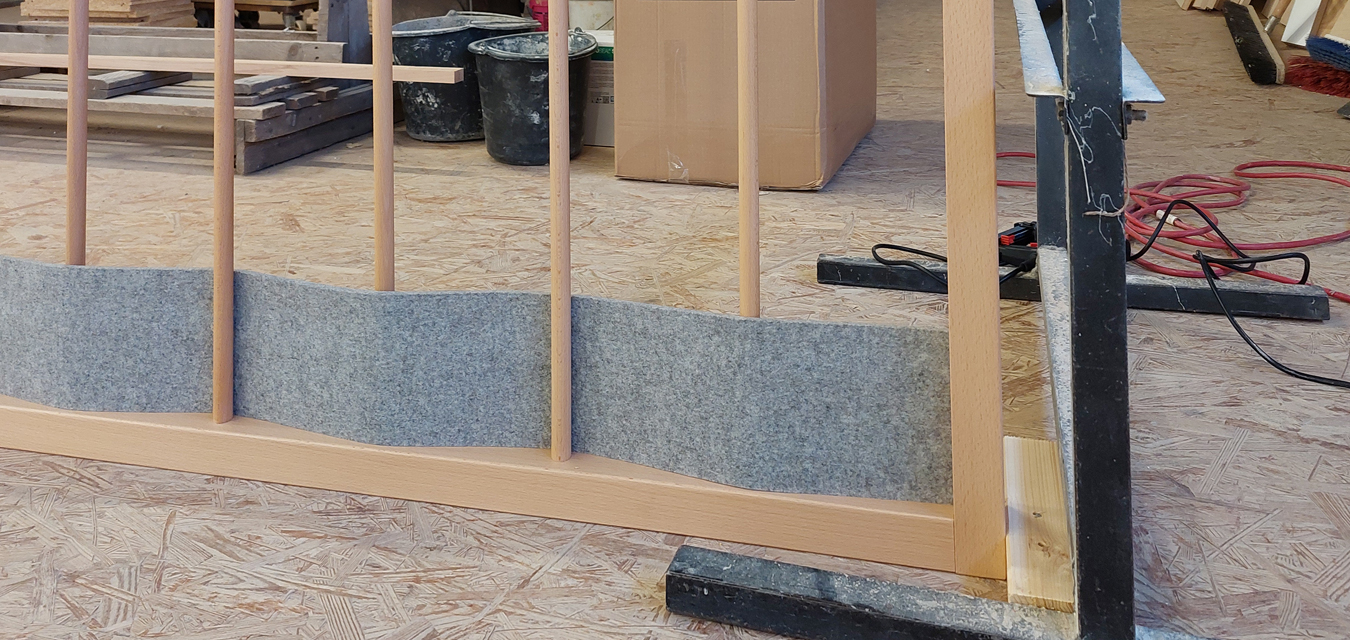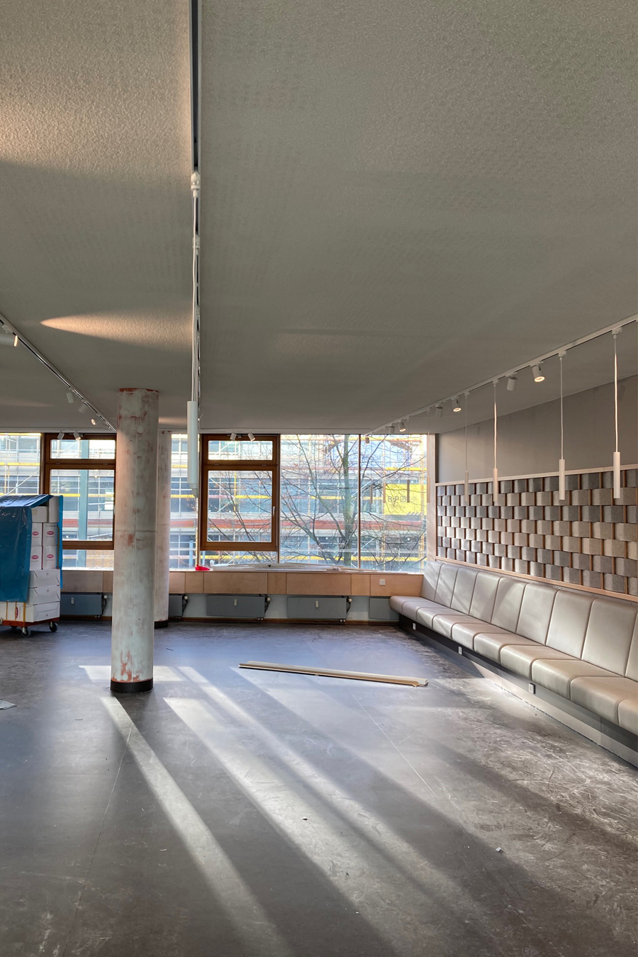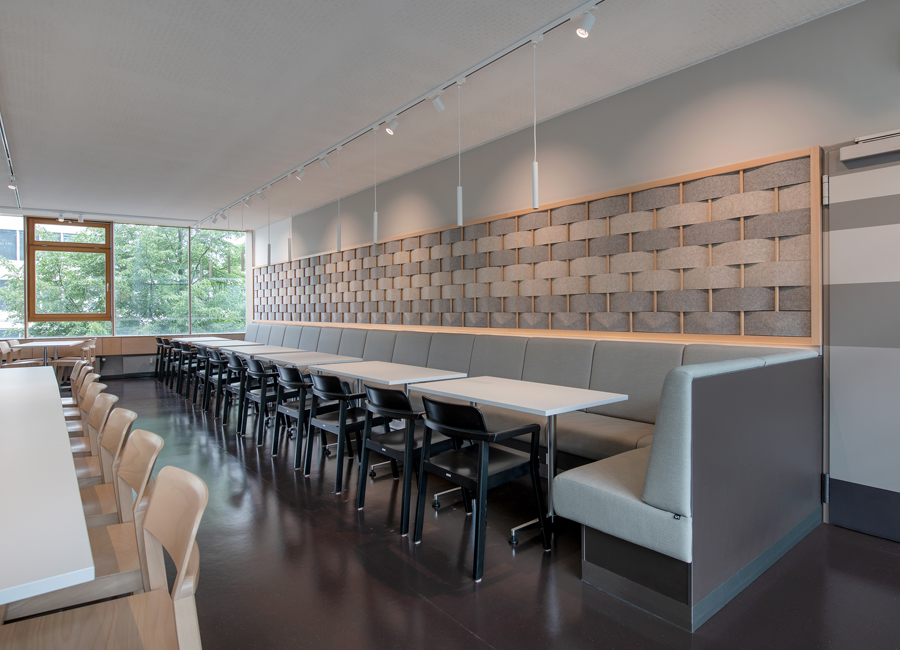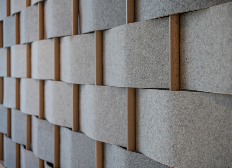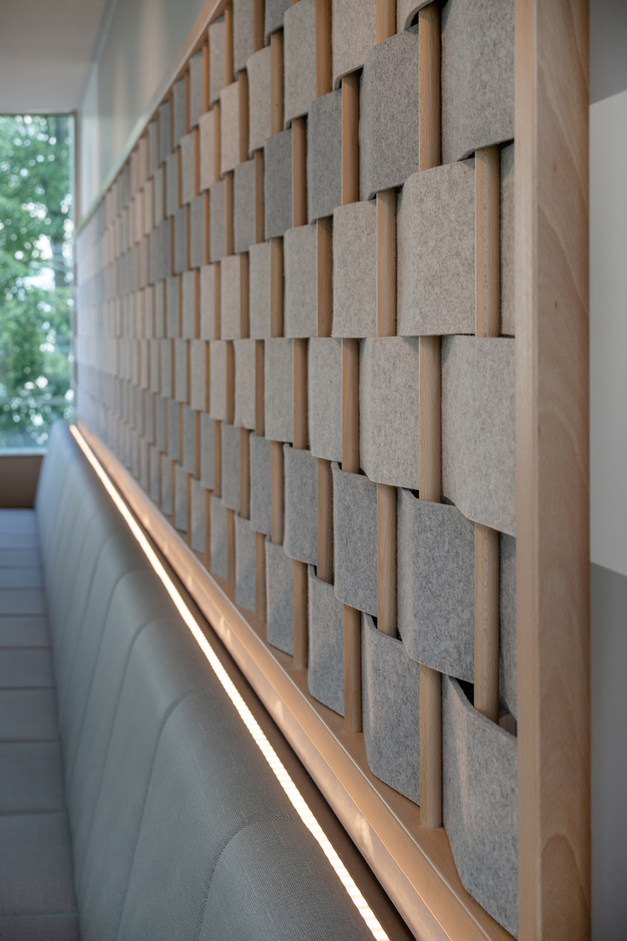 Die gewebte Filzwand sorgt für entspannte Akustik. Das Thema der sich überschneidenden Farbflächen hilft sichtbare Haustechnik und unruhige Wandansichten zu beruhigen.