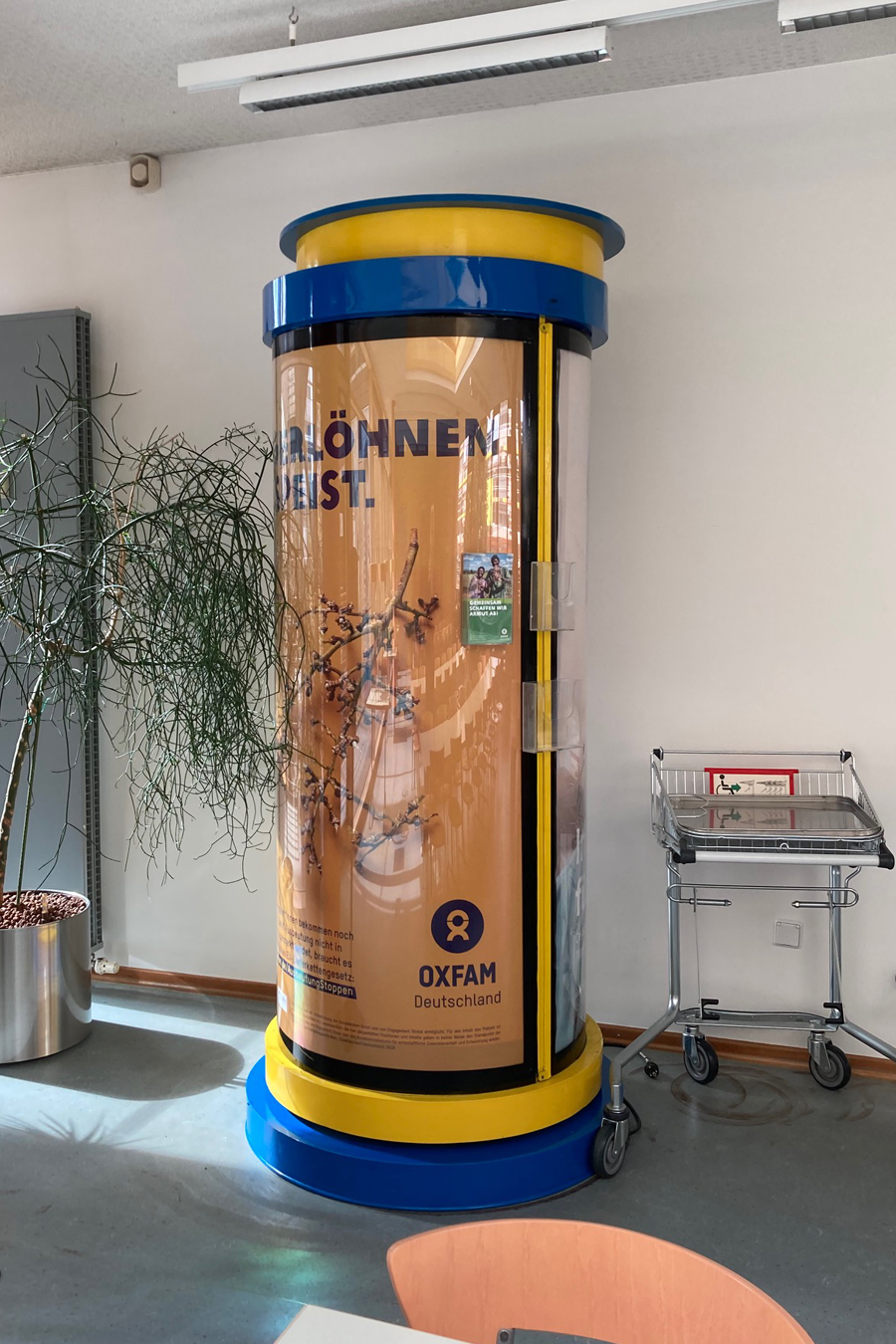 Ein wenig genutzter, gestalterisch in die Jahre gekommener Nebenraum soll für ein Automatencafé genutzt werden. Die neue Gestaltung soll der modernen Mensa angepasst werden, die direkt an diesen Nebenraum anschließt. Überschneidung von Farbflächen, erdige milde Farben, gewebter Filz und natürliche Materialien sind das Thema...