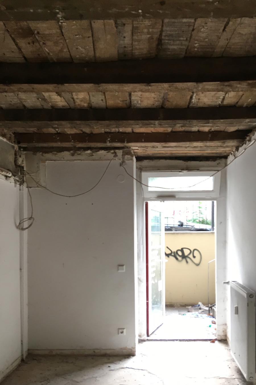 ...den verborgenen Fettabscheider zu finden und auszubauen, den fehlenden baulichen Brandschutz zu heilen und kontinuierlich mit allen zuständigen Baubehörden und der Hausgemeinschaft im Gespräch zu bleiben. Aber am Ende ist der Außeneingang ins Souterrain neu gepflastert und bietet eine grüne Oase im Freien, die Teeküche schafft Ordnung am Eingang und lädt zum Verweilen ein, die maßgeschneiderten Stahl-Glas-Türen trennen und verbinden zugleich und das neue Eichenparkett und die hochwertige Beleuchtung erzählen nun eine andere Geschichte im denkmalgeschützten Haus.