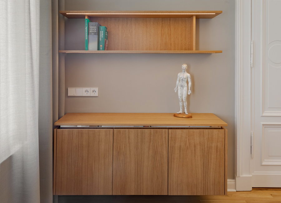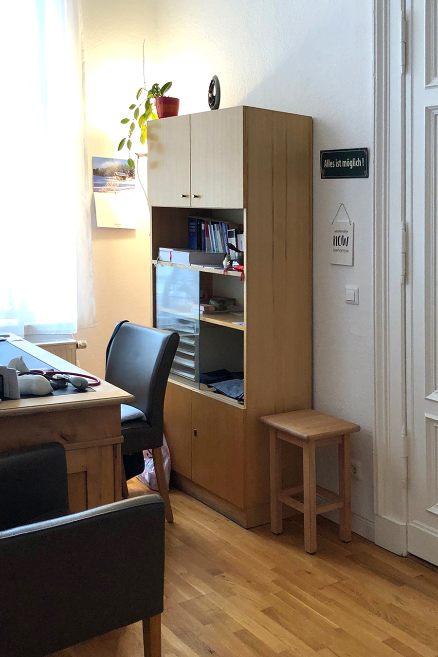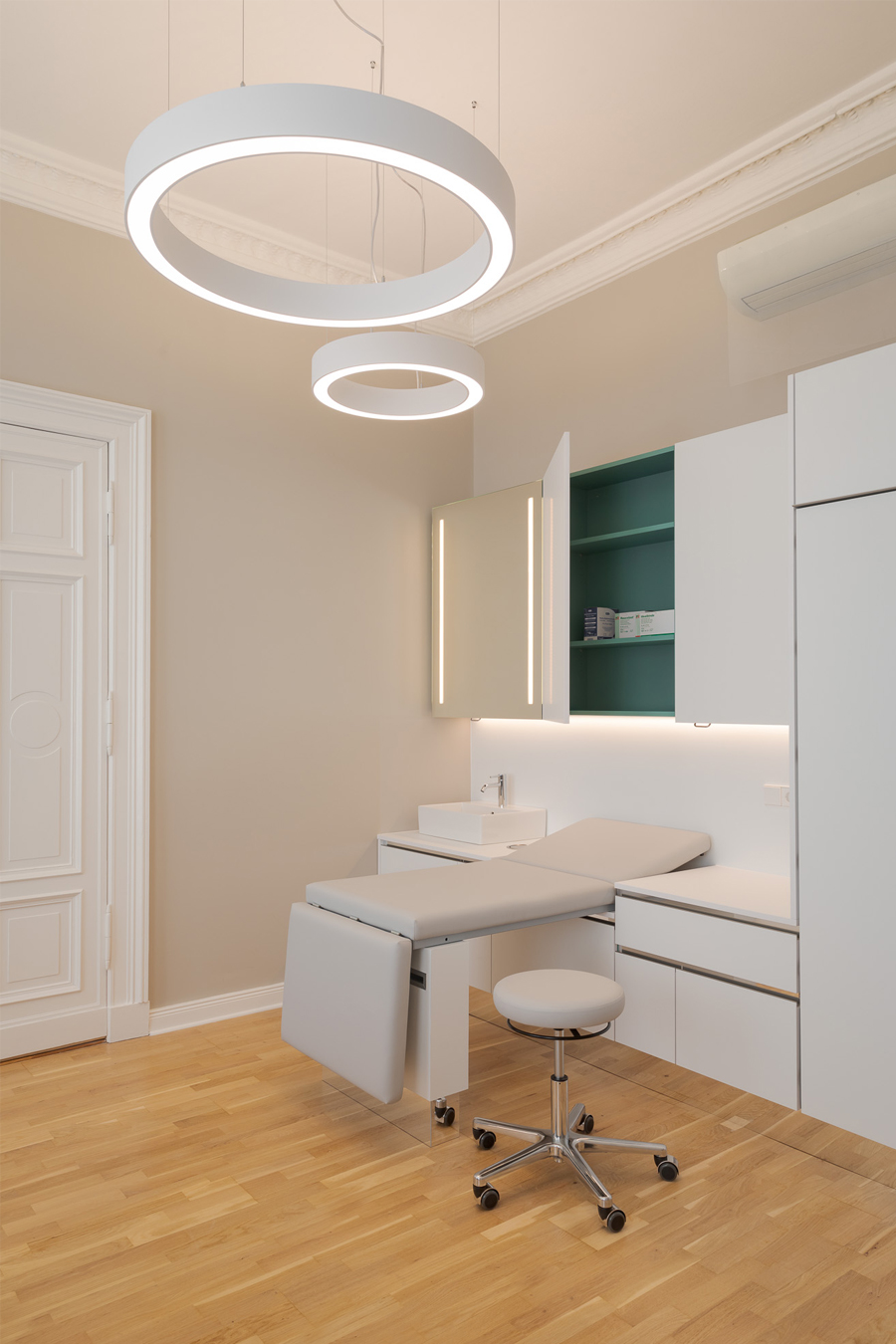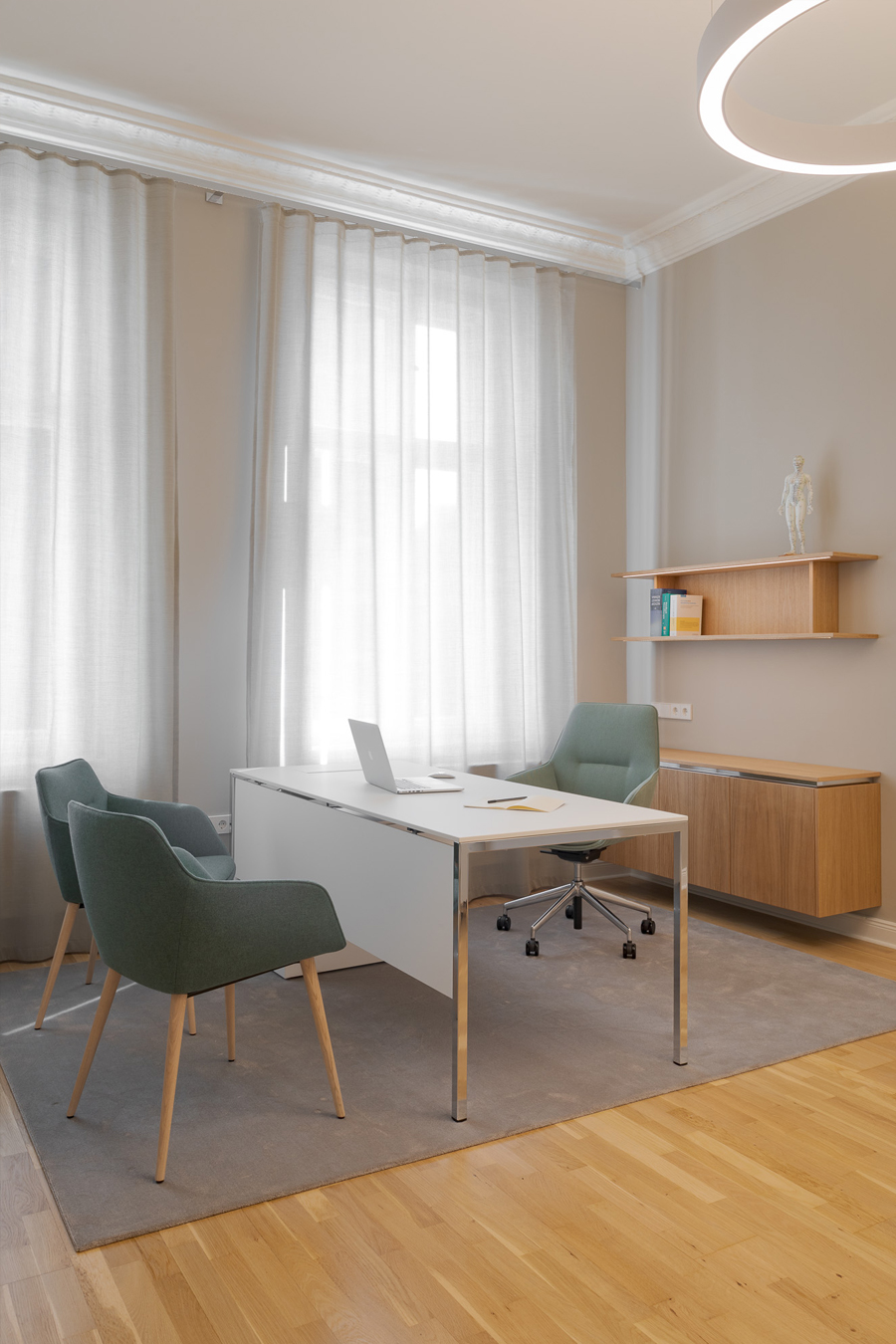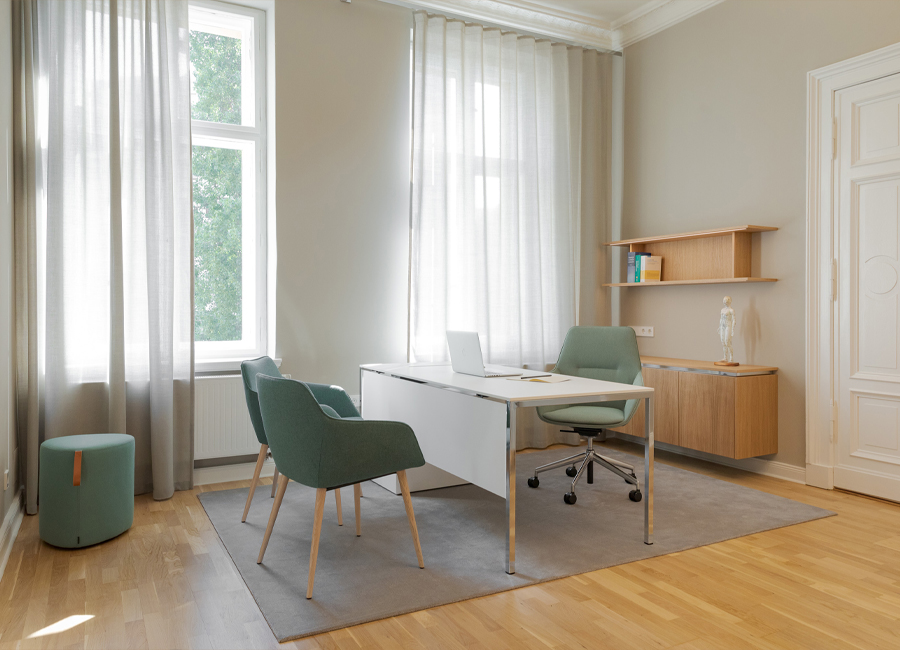 Eine neue Ärztin in einer Gemeinschaftspraxis bringt frischen Wind in den Alltag. Das muss man auch in Ihrem Behandlungsraum sehen. Eine einladende frische Atmosphäre, gute Organisiation des Behandlungsablaufs, funktionales aber auch stimmungsvolles Licht, aufgefrischte schöne Altbausubstanz und Vorhänge für entspannte Akustik...