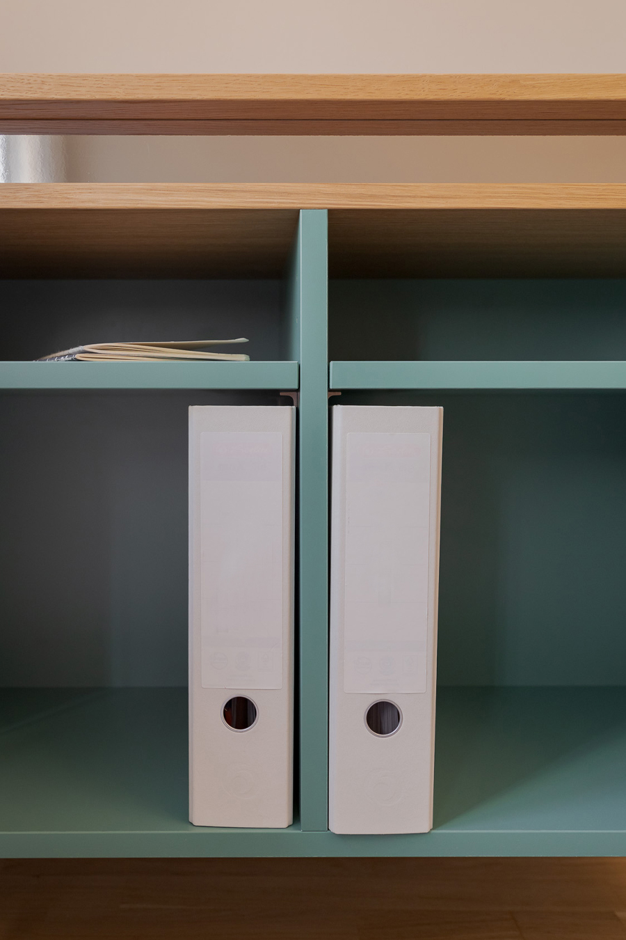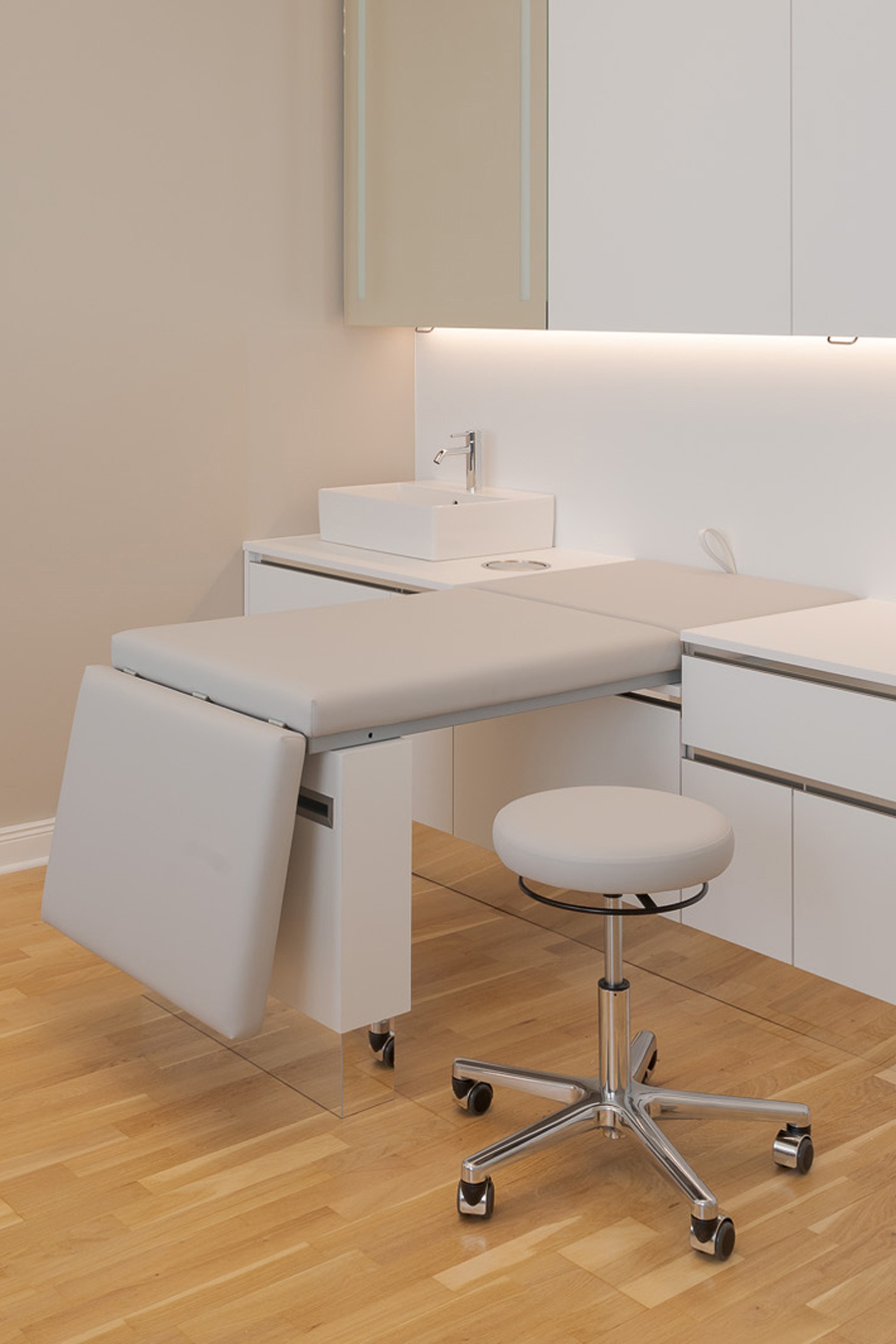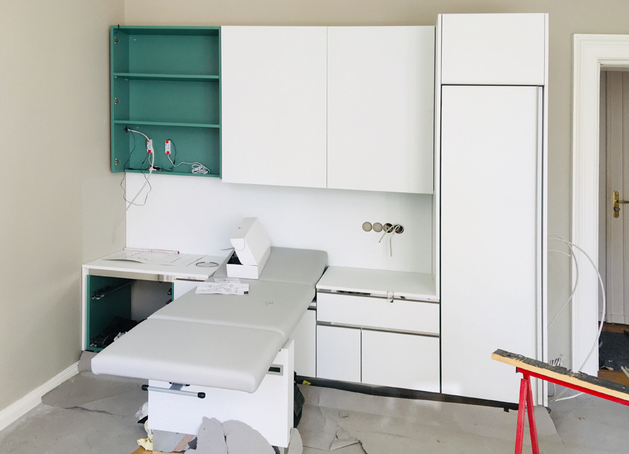 ...spiegeln die Qualität und die Frische der neuen Frau im Team wieder. Der Behandlungsbereich wird optimal den Arbeitsabläufen der Behandlung angepasst. Ein seitlicher Paravent schafft Intimität beim Umziehen oder bei der Untersuchung. Am Arbeitsplatz kann in angenehmer Atmosphäre gesprochen und beraten werden, ein leichter Pouf bietet Platz auch für größere Familien. Die frischen Blau- und Grüntöne korrespondieren mit dem kleinen Park vorm Haus und lassen den frischen Wind förmlich spüren.