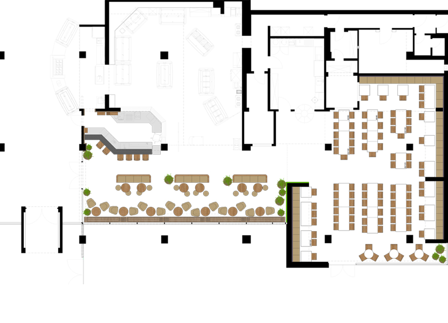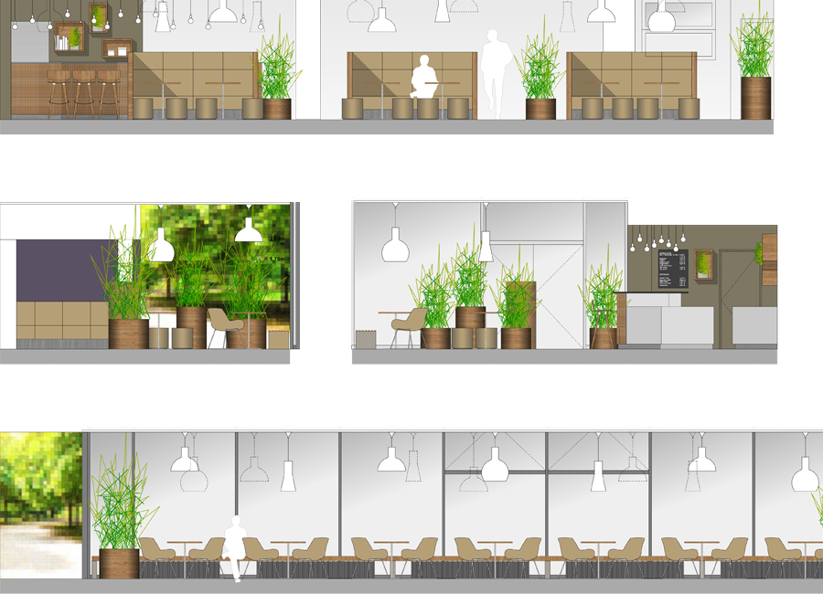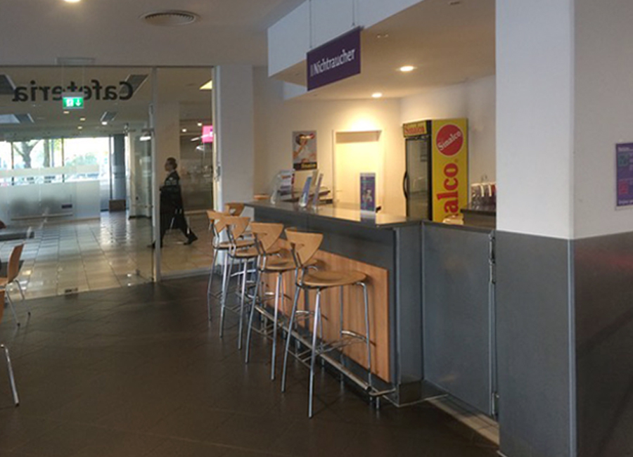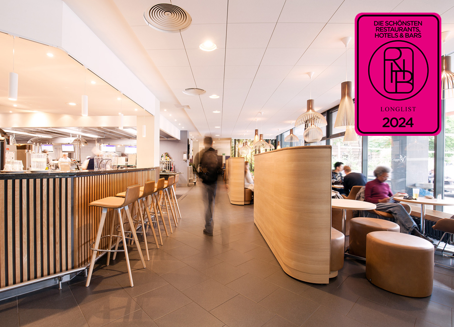 Die bereits bestehende Speisenausgabe wird nachhaltig „aufgefrischt“. Nur die Fronten der Ausgabetresen werden ausgetauscht, die in die Jahre gekommenen Fliesen im Hintergrund durch einen Anstrich dem neuen Konzept angepasst. Neue Deckenpaneele im Gastraum sorgen für Ruhe und damit Wohnlichkeit. Die Pendelleuchten mit dekorativen Holzschirmen über den flachen Tischen am Fenster verstärken die entspannte Atmosphäre. Ein ganzheitliches Konzept, vom veganen Speisenangebot über nachhaltig revitalisierte Ausgabetresen bis zur harmonischen, natürlichen Gastraumgestaltung.