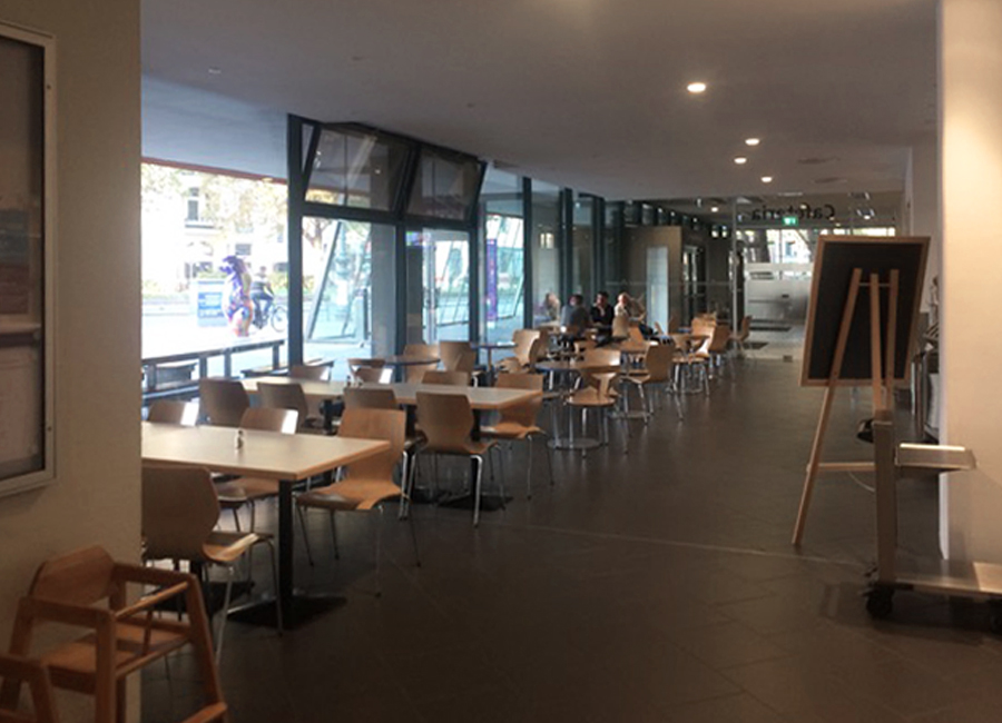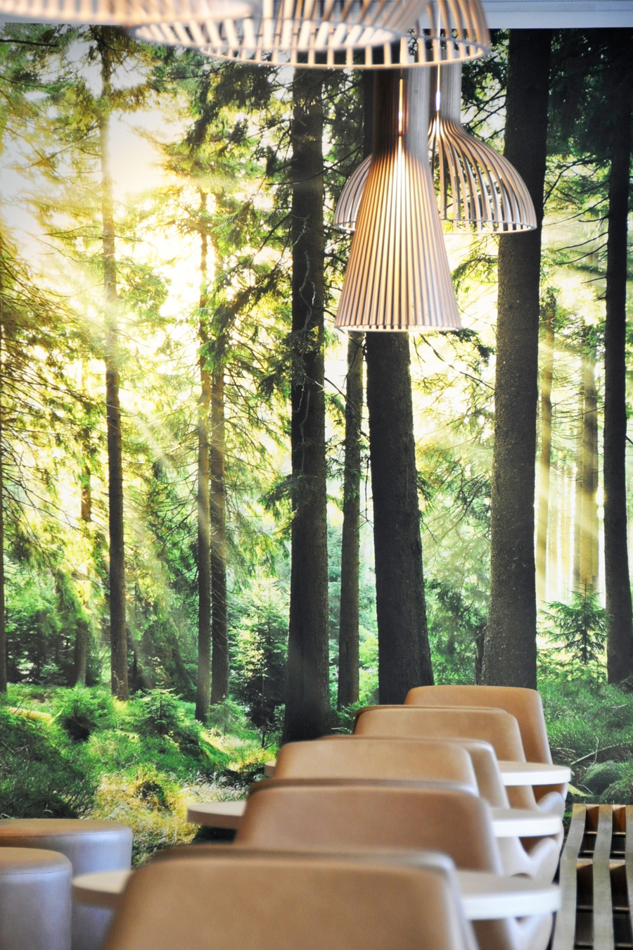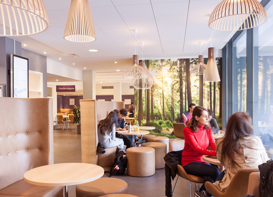 Die erste, rein vegane Mensa in Deutschland! Veganes Essen, dazu frisch gepresste Smoothis an der Bar am Eingang. Natürliche Farben, viel Holz, gemütliche Bänke mit Kunstlederbezug und ein wandfüllendes Waldmotiv schaffen eine harmonische Atmosphäre und verbinden den Gastbereich mit dem grünen Außenraum hinter großen Panoramafenstern...