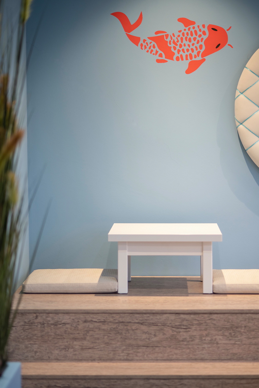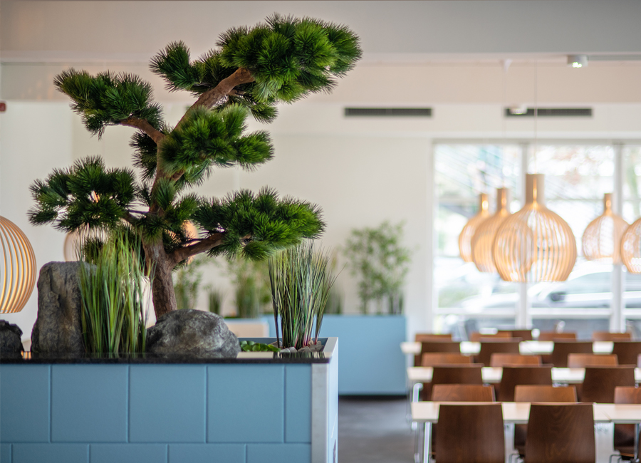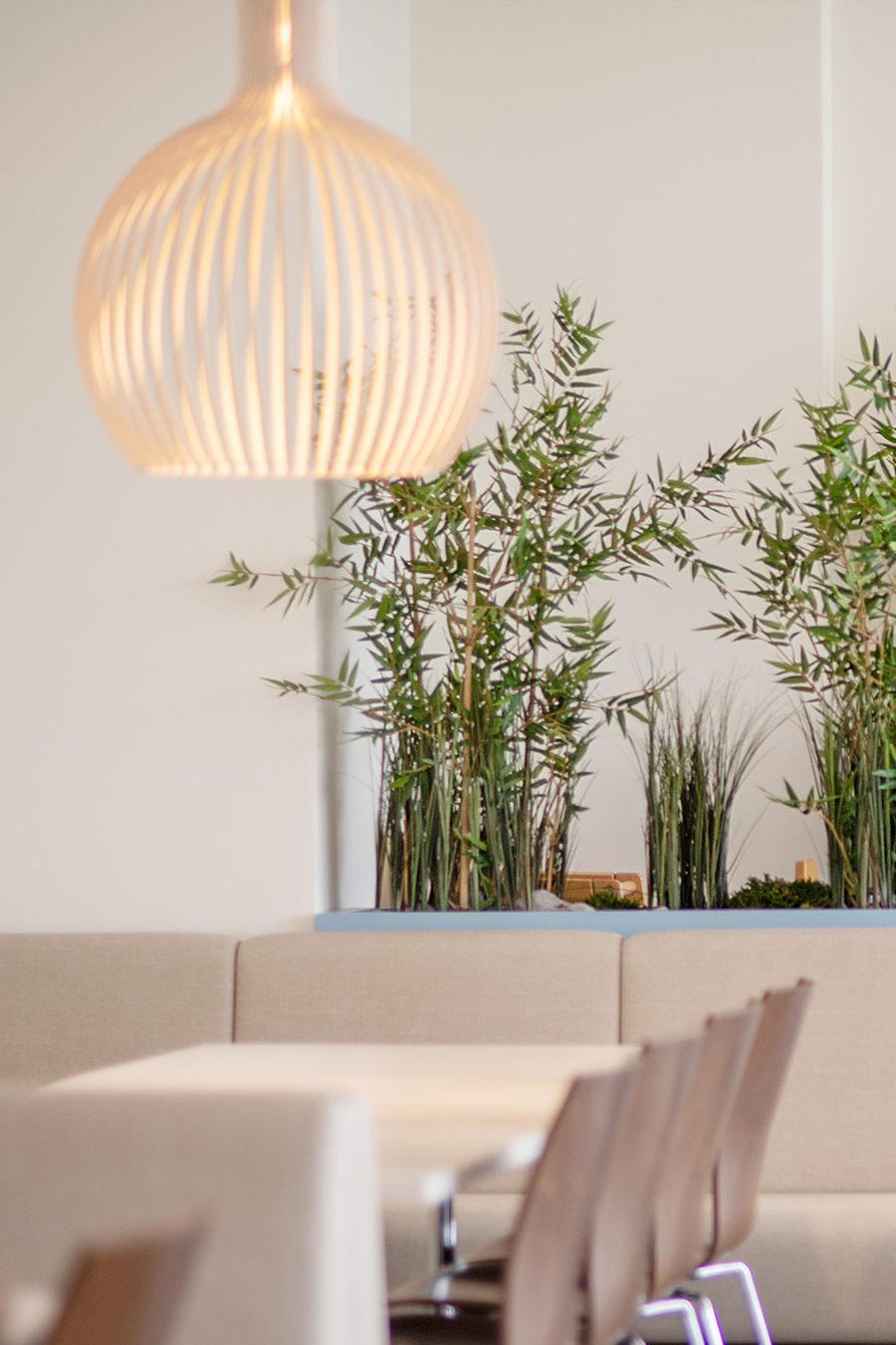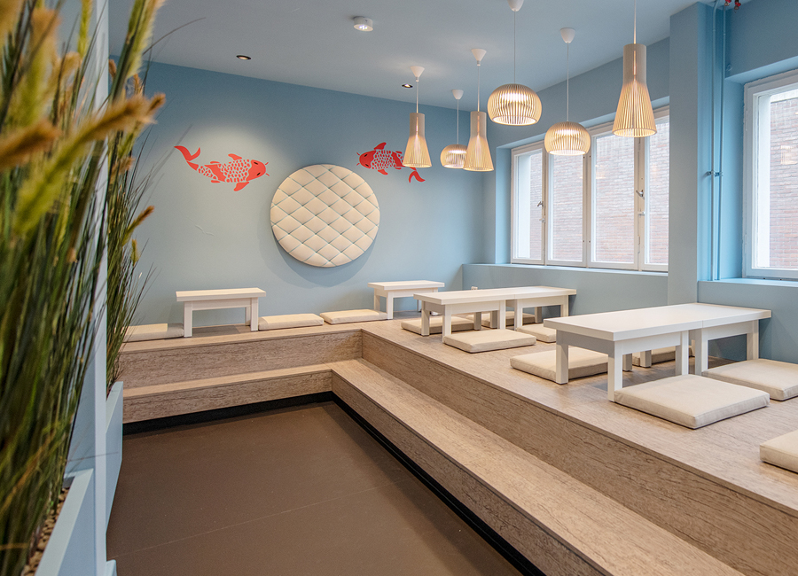 ...und japanisch anmutenden Accessoires gelungen. Drei nebeneinander liegende Räume greifen jeweils ein eigenes, japanisch anmutendes Thema auf. Die gewählten Inszenierungen unterstützen die vorhandene Atmosphäre der Räume. Ein lichtdurchfluteter großer Raum zum Garten hin wird zum Wintergarten, der innenliegende, fensterlos längliche Verbindungsraum zur schummrigen Ladenstraße, an dessen Ende der Blick auf den Fujiyama freigegeben wird. Und für noch mehr Authentizität kann man im kleinen Garten auf Podesten an Tatamitischen sitzen und die rein japanischen Speisen in diesem Betriebsrestaurant genießen.