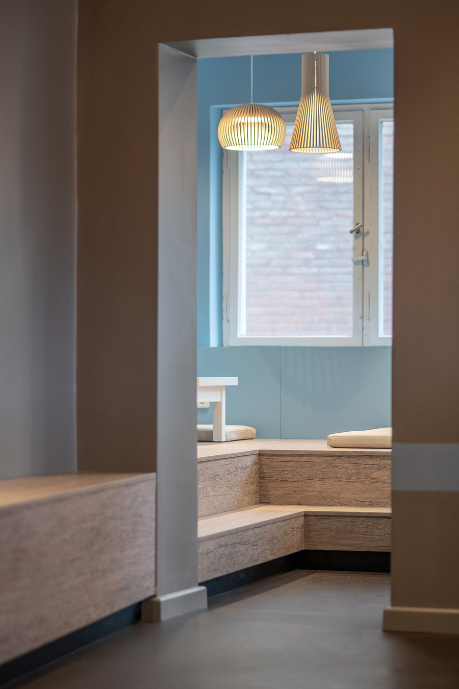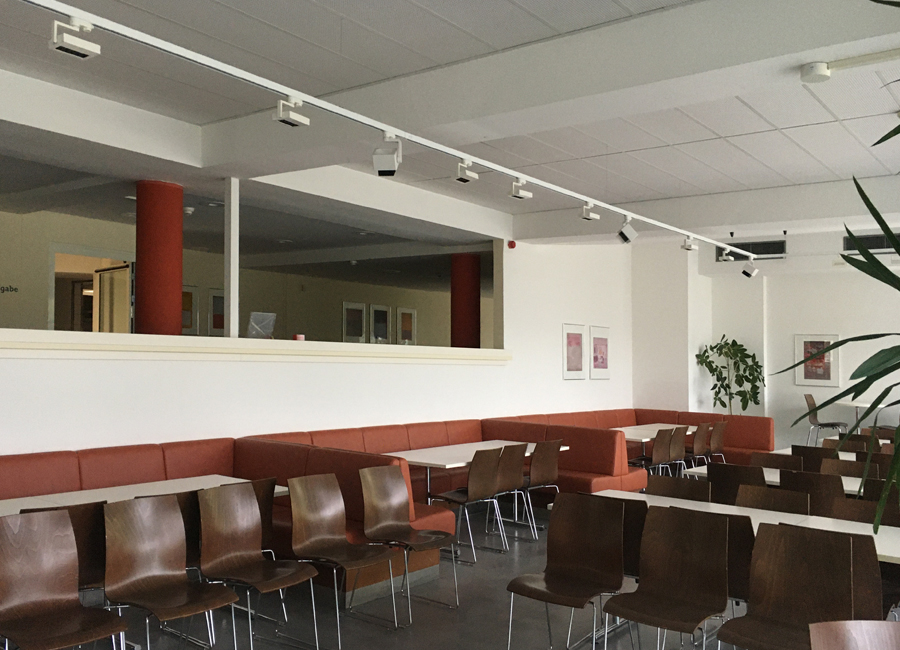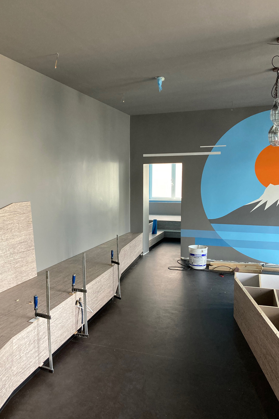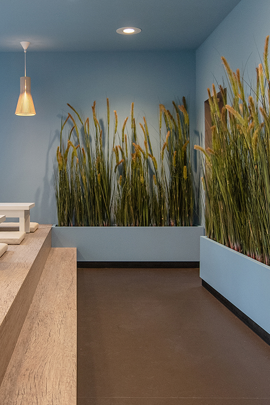 ...und japanisch anmutenden Accessoires gelungen. Drei nebeneinander liegende Räume greifen jeweils ein eigenes, japanisch anmutendes Thema auf. Die gewählten Inszenierungen unterstützen die vorhandene Atmosphäre der Räume. Ein lichtdurchfluteter großer Raum zum Garten hin wird zum Wintergarten, der innenliegende, fensterlos längliche Verbindungsraum zur schummrigen Ladenstraße, an dessen Ende der Blick auf den Fujiyama freigegeben wird. Und für noch mehr Authentizität kann man im kleinen Garten auf Podesten an Tatamitischen sitzen und die rein japanischen Speisen in diesem Betriebsrestaurant genießen.