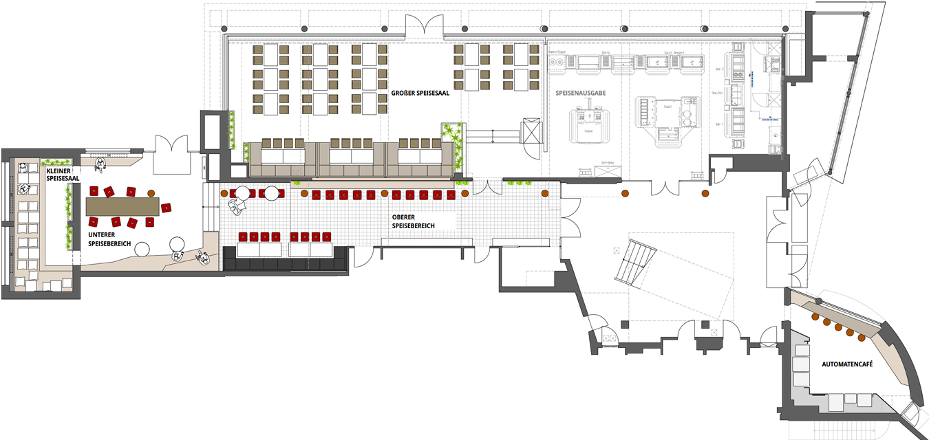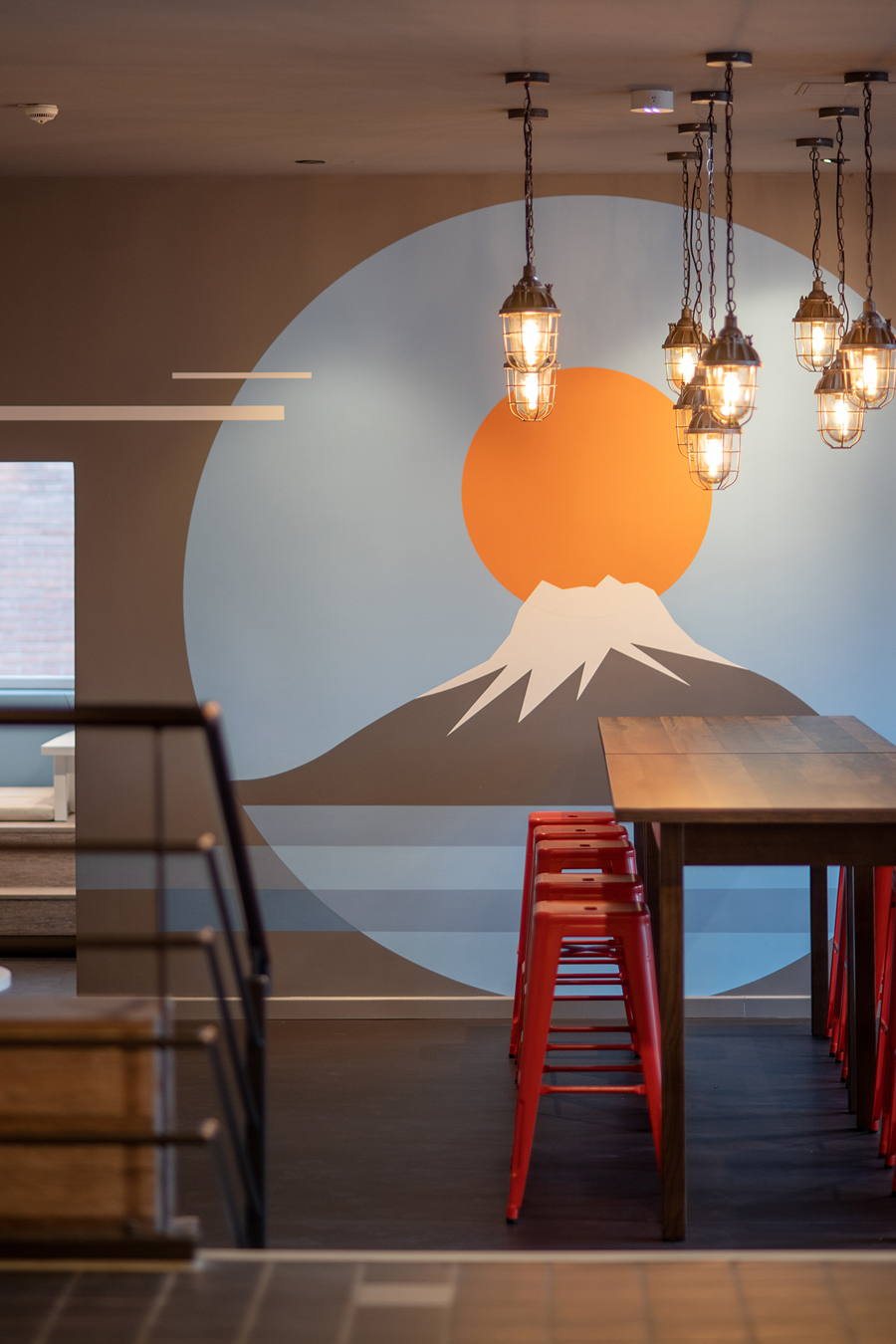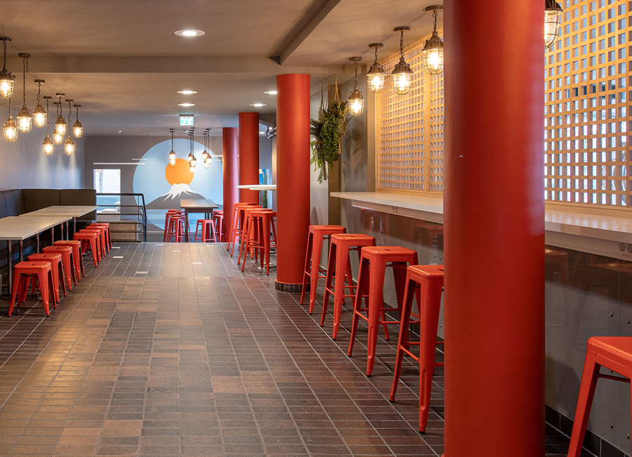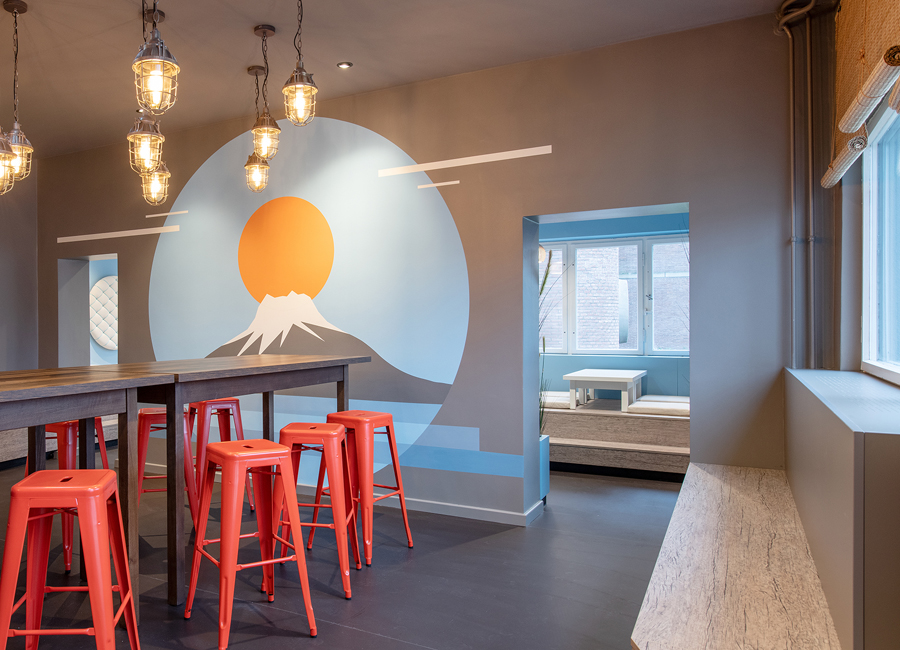 Ein „großer Garten“ mit Blick in den großen Garten, eine schummrige Ladenstraße mit Laternen, der Blick auf den Fujiyama und ein „kleiner Garten“ mit Tatamitischen auf Sitzpodesten....wenn das nicht auf das japanische Essen einstimmt? Eventgastronomie auch im Betriebsrestaurant. Das ist mit einigen visuellen Highlights und typischen Materialien...