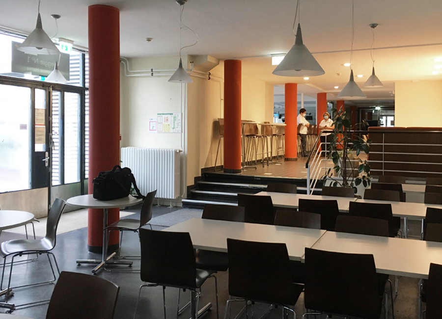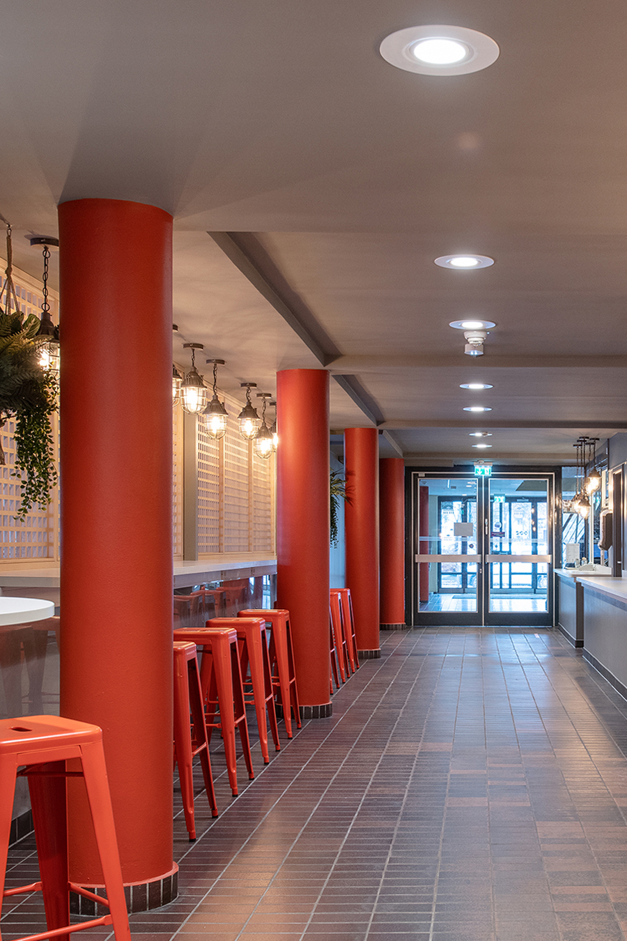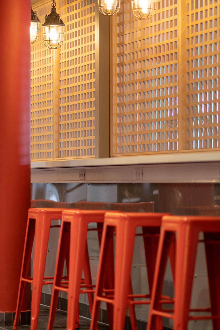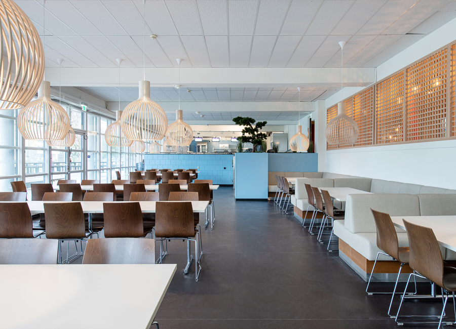 Ein „großer Garten“ mit Blick in den großen Garten, eine schummrige Ladenstraße mit Laternen, der Blick auf den Fujiyama und ein „kleiner Garten“ mit Tatamitischen auf Sitzpodesten....wenn das nicht auf das japanische Essen einstimmt? Eventgastronomie auch im Betriebsrestaurant. Das ist mit einigen visuellen Highlights und typischen Materialien...