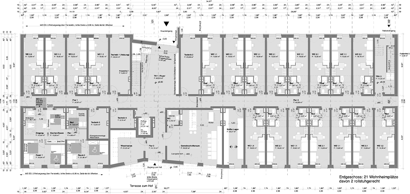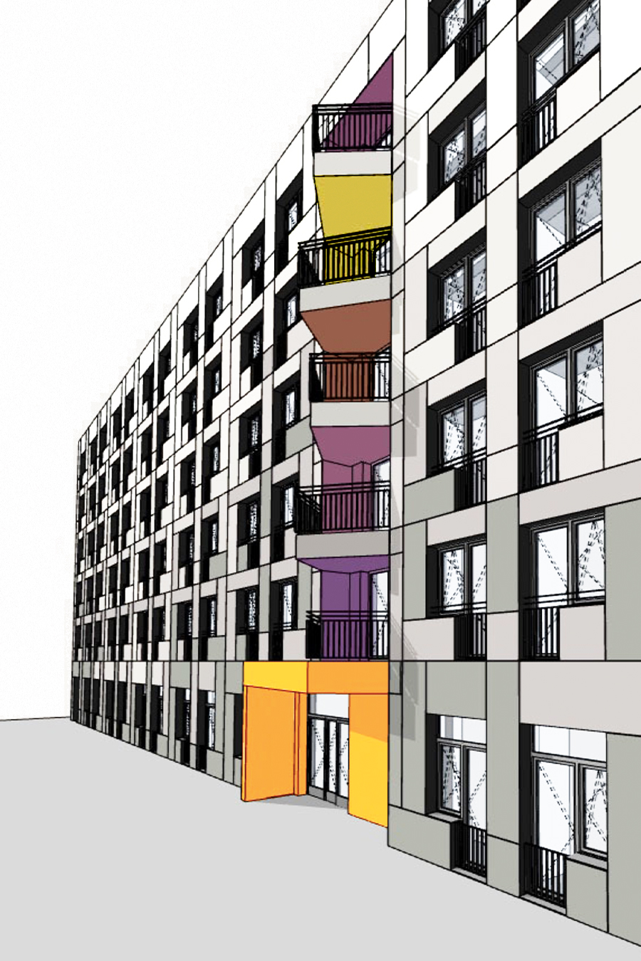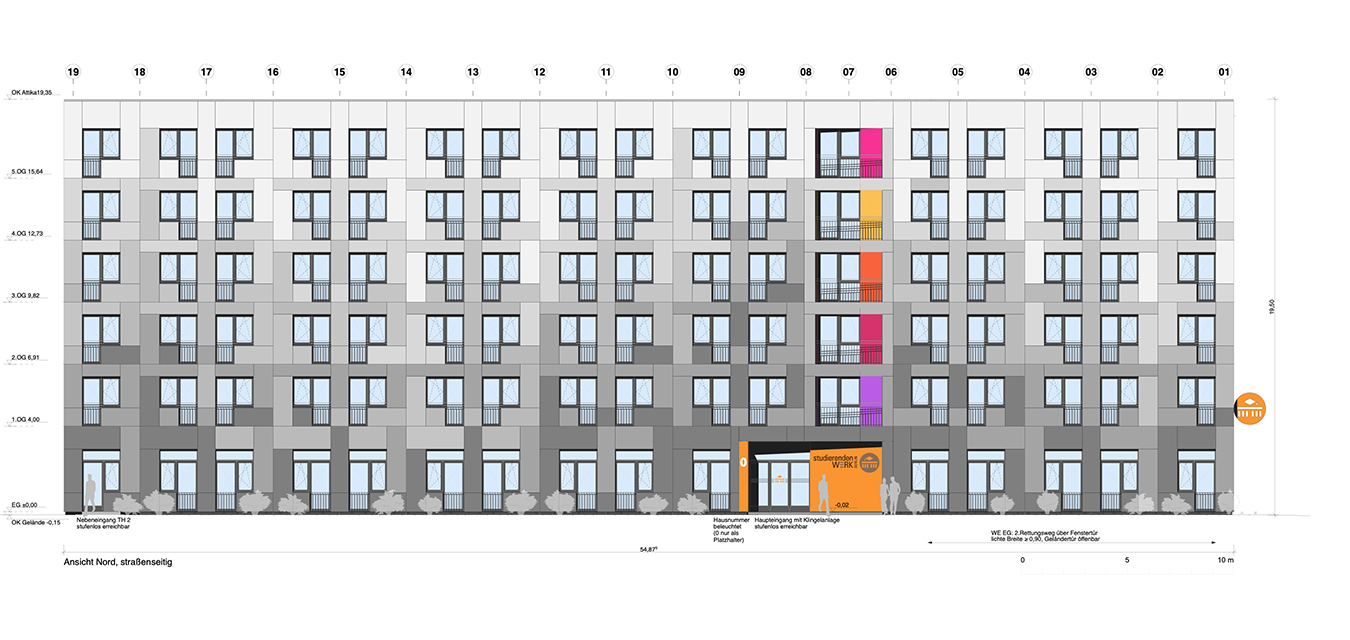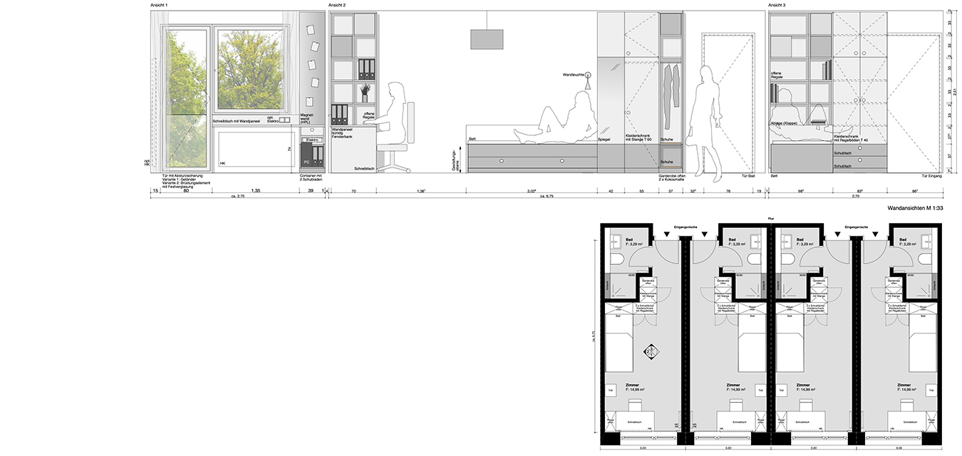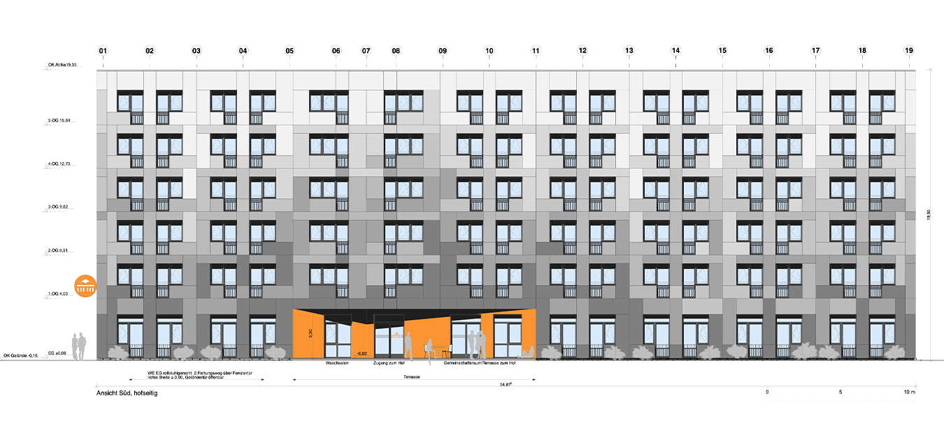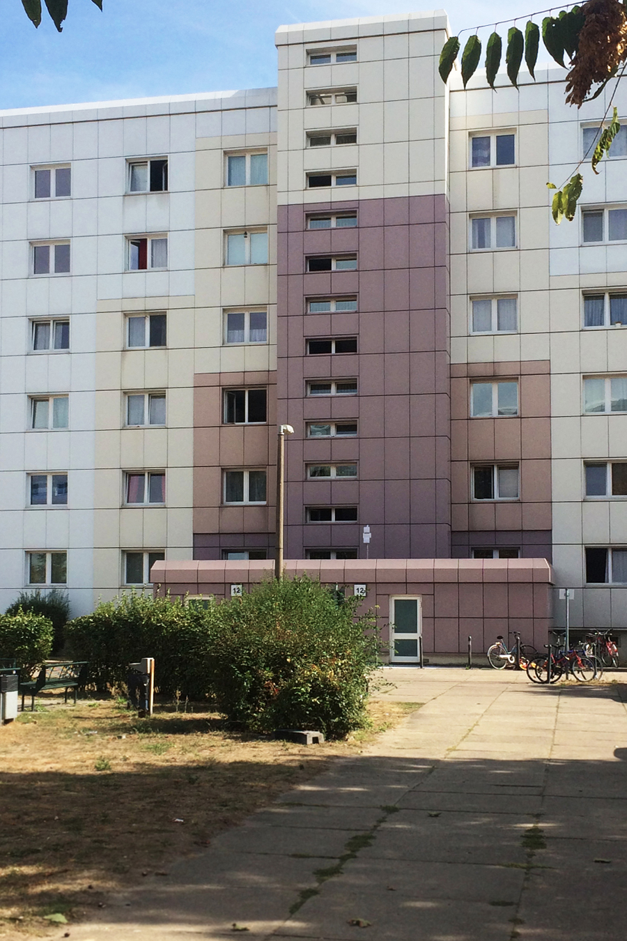 Städtebaulich schließt der Neubauriegel im rechten Winkel zum Bestand den großen Innenhof des Areals und schafft so eine grüne Oase inmitten der Stadt. Die Fassadengestaltung des Neubaus geht mit ihrem Raster auf die Vorhangfassadentafeln der Plattenbauten ein, seitliche Fassadenbegrünungen laden in den neu gestalteten grünen Innenhof ein. Das großzügige Foyer bietet Eingang, Orientierung und Begegnung. Von hier erreicht man den Hausclub mit großer Küche und Blick in den Garten, außerdem den Waschsalon. Mit Treppe oder Aufzug geht es in die oberen Etagen, wo wohnen in Einzelapartments mit Bad und Kitchenette oder barrierefreien 2-er Wohnungen möglich ist. Neuer Wohnraum für 176 Menschen.