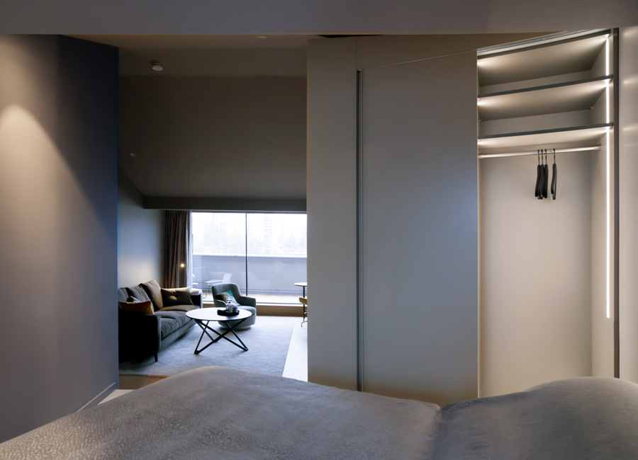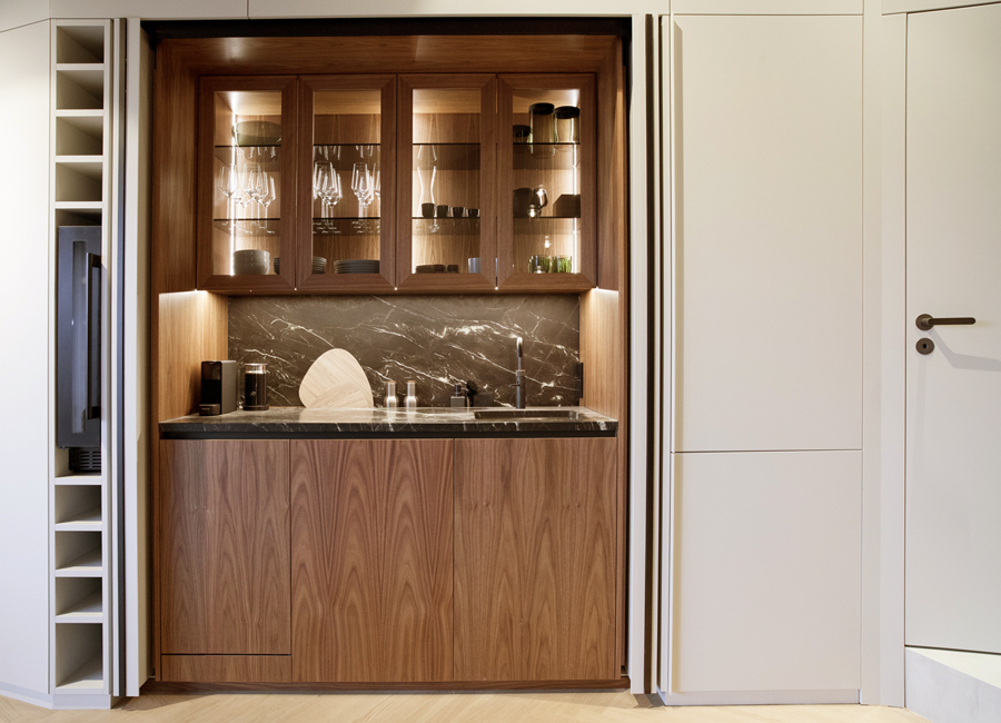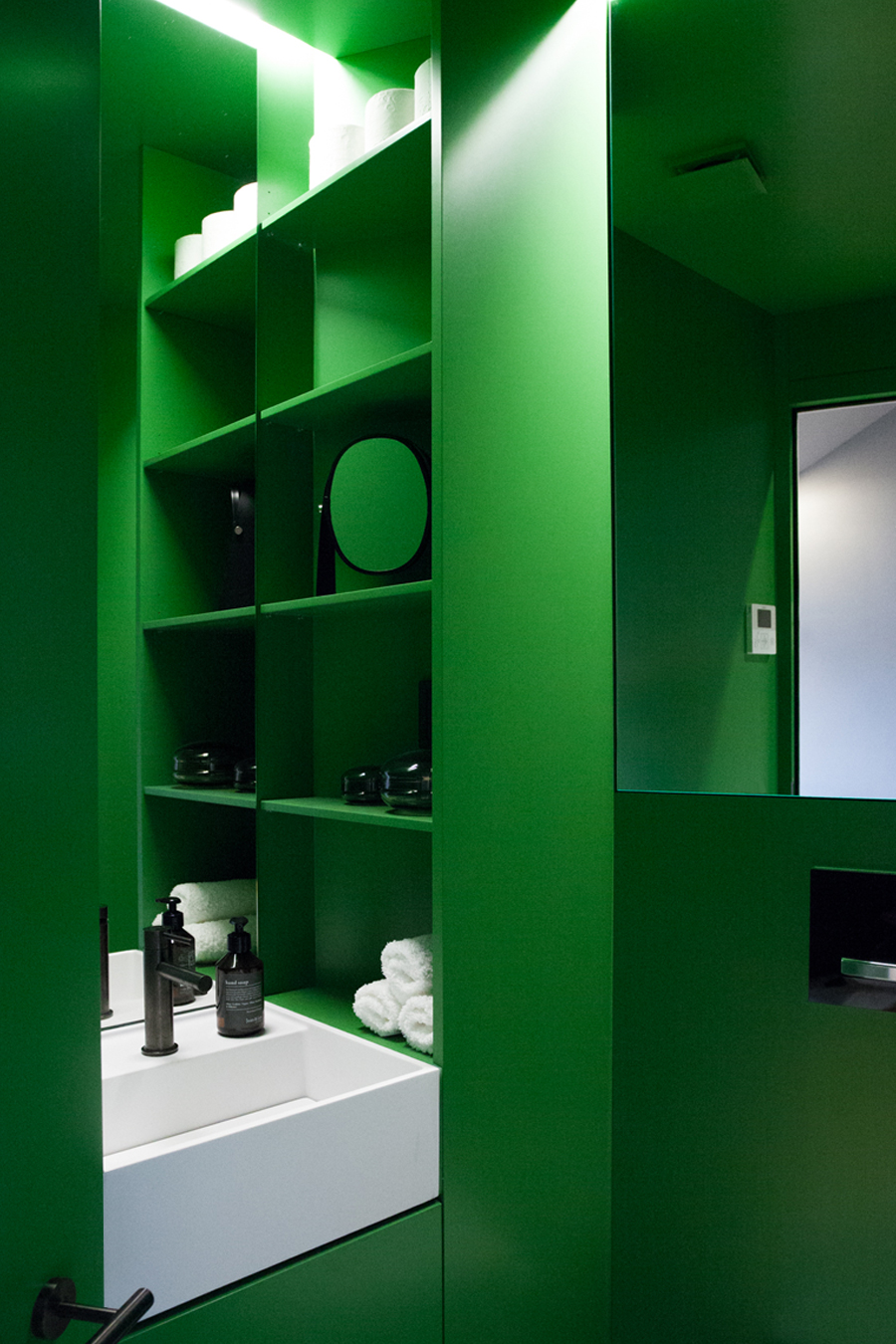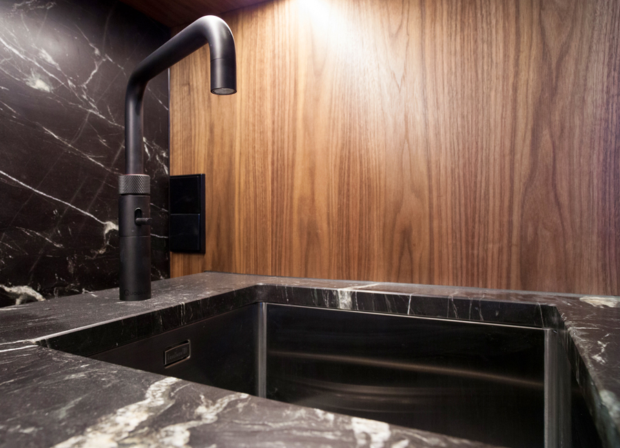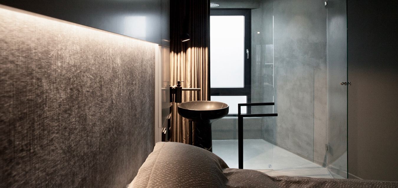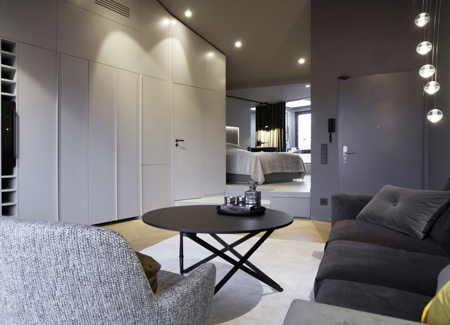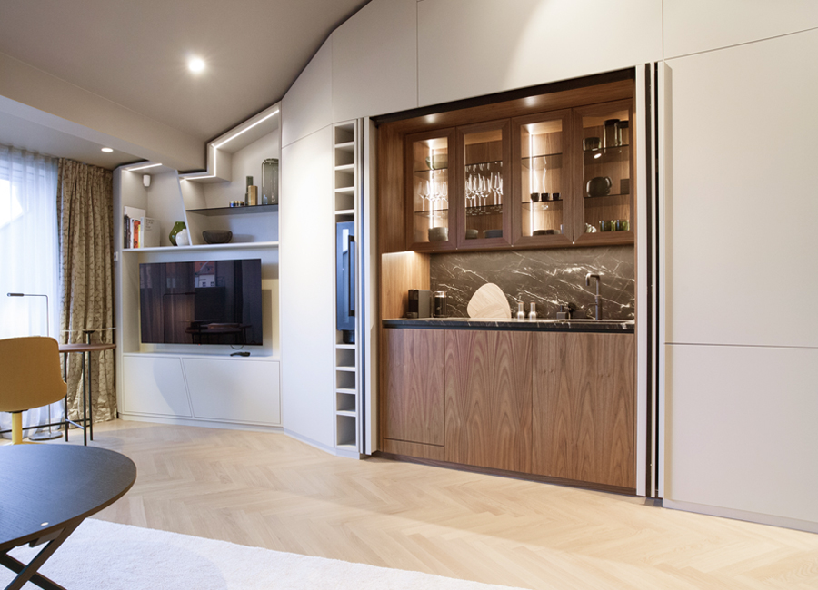 Maßgeschneiderter Tischlereinbau mit hochwertigen handwerklichen Details bringen Ruhe und Wertigkeit in den Raum. Exquisite, aber auch mal unverhoffte Farbgestaltung schafft eine edle und charaktervolle Atmosphäre auf sehr kleiner Fläche. Ausgefeilte Lichttechnik ermöglicht die unterschiedliche Betonung der Raumbereiche oder Stimmungen. So kann ein Raum viele Geschichten erzählen, die Größe spielt keine Rolle mehr.