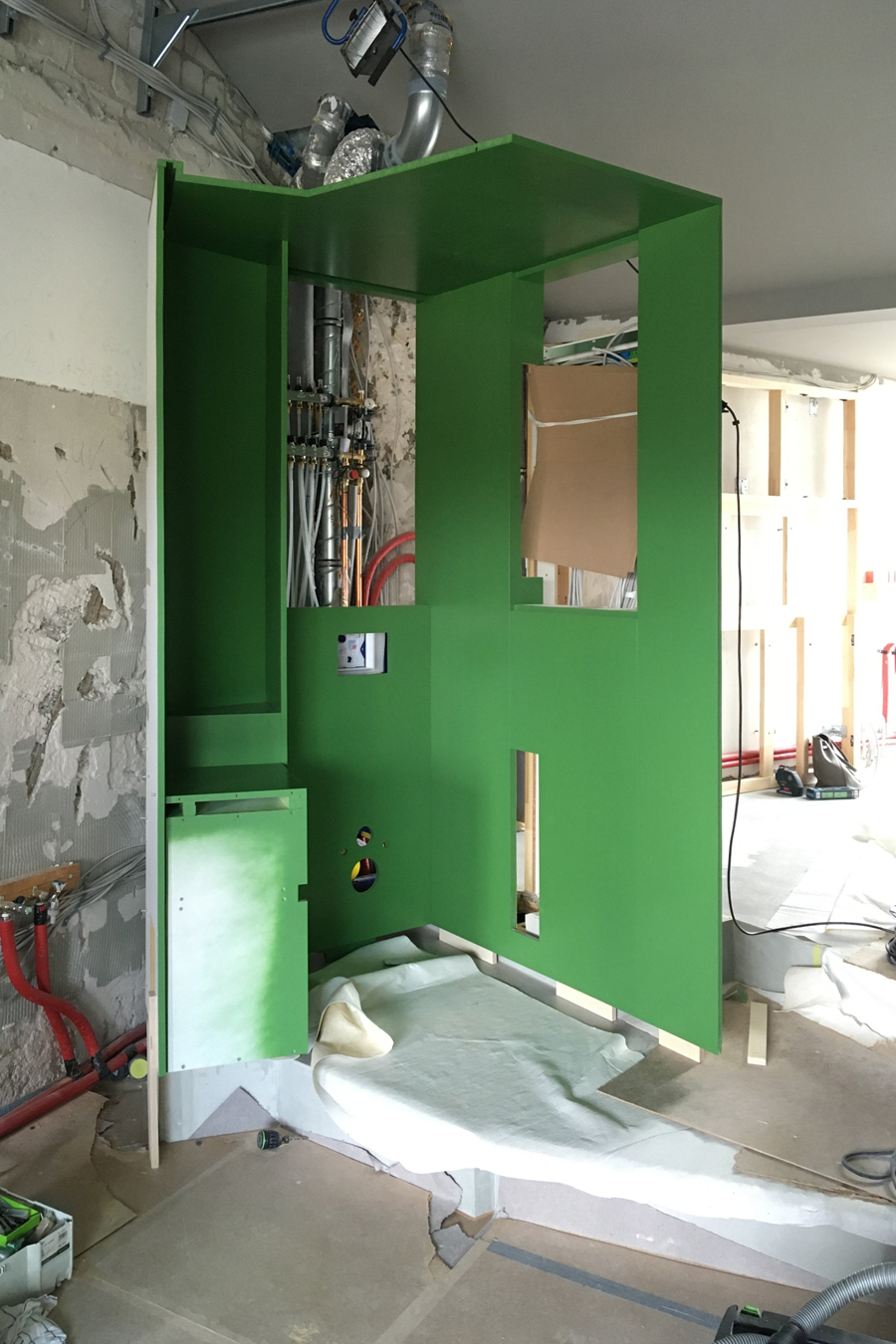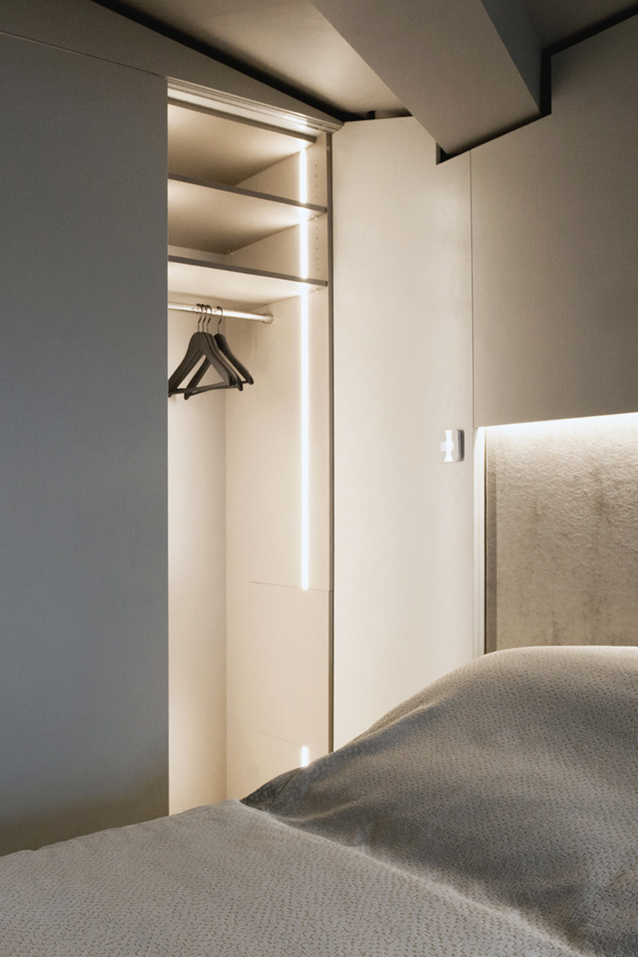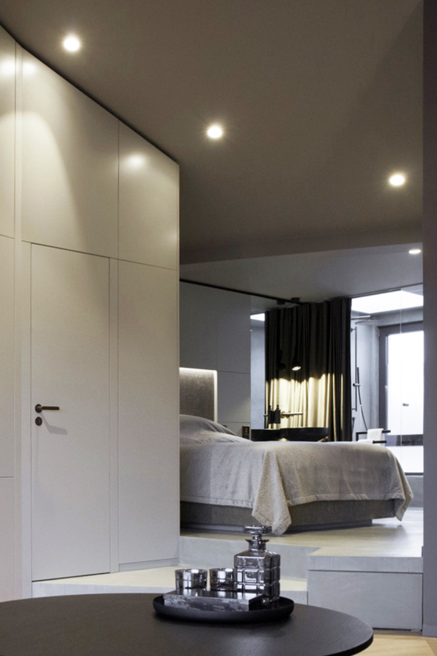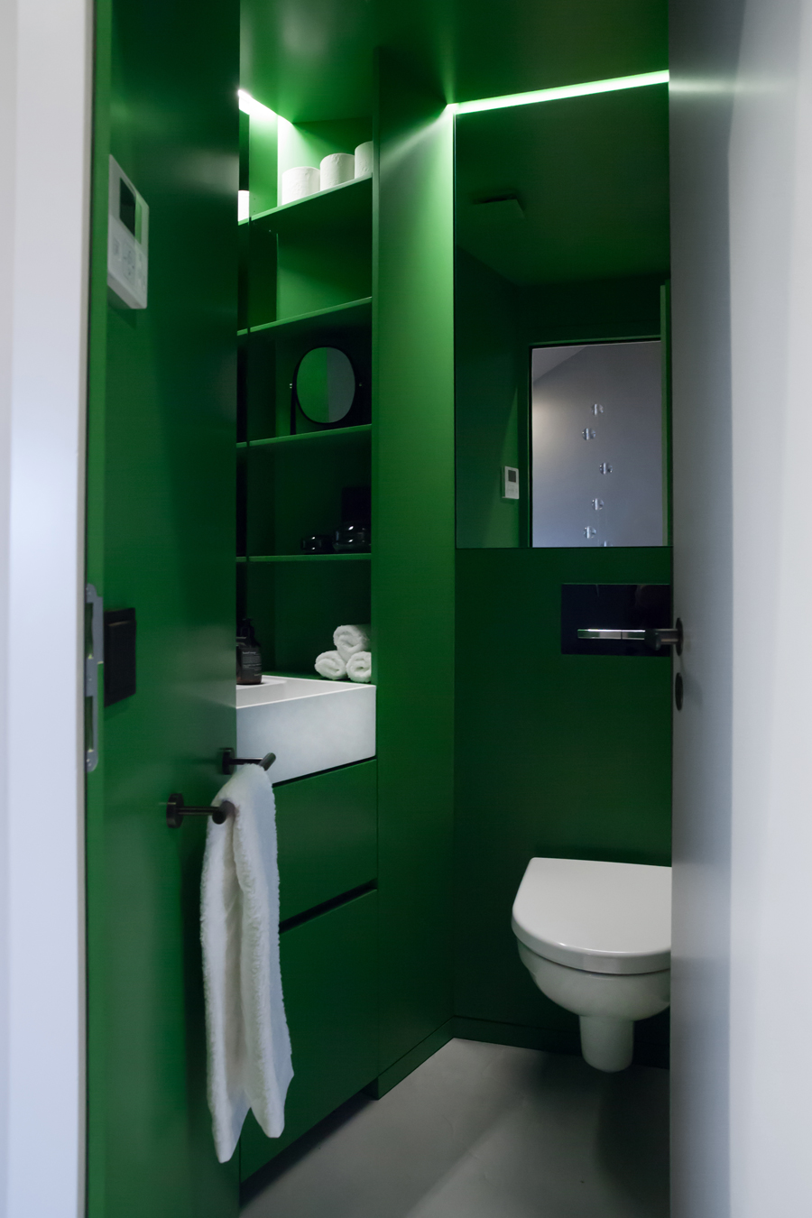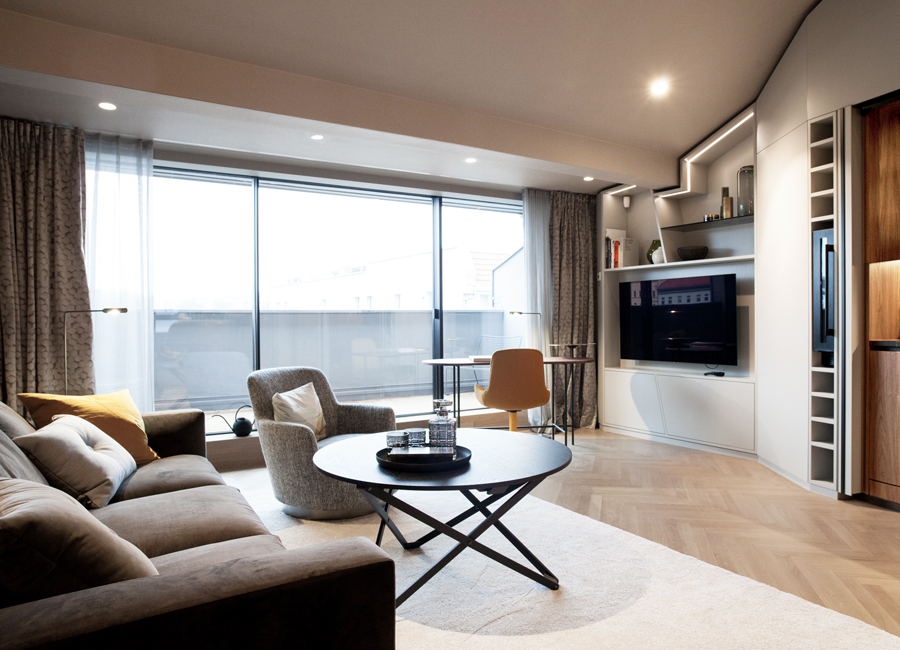 Maßgeschneiderter Tischlereinbau mit hochwertigen handwerklichen Details bringen Ruhe und Wertigkeit in den Raum. Exquisite, aber auch mal unverhoffte Farbgestaltung schafft eine edle und charaktervolle Atmosphäre auf sehr kleiner Fläche. Ausgefeilte Lichttechnik ermöglicht die unterschiedliche Betonung der Raumbereiche oder Stimmungen. So kann ein Raum viele Geschichten erzählen, die Größe spielt keine Rolle mehr.