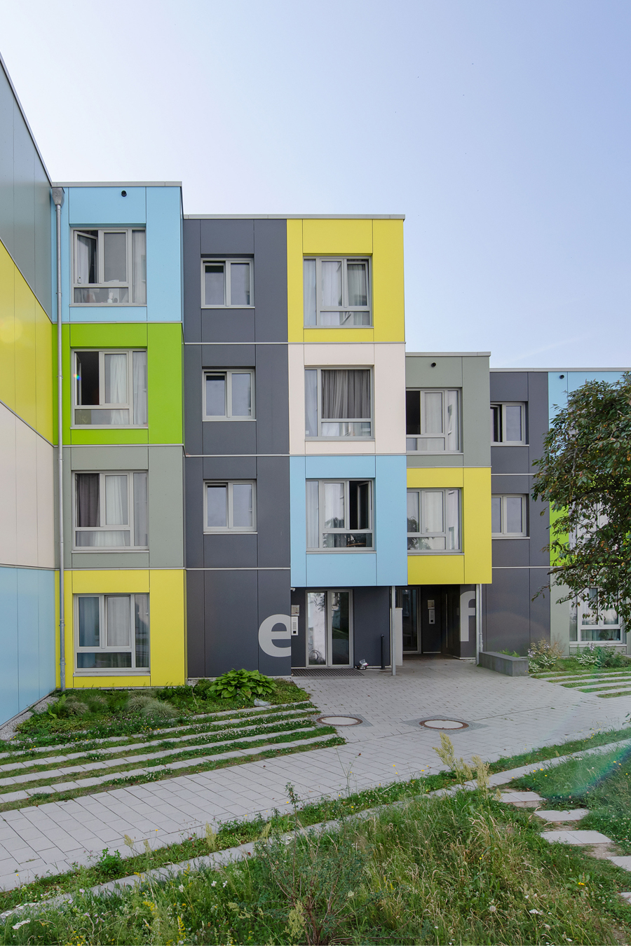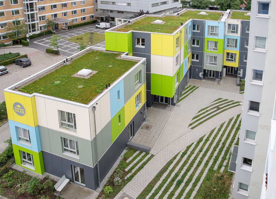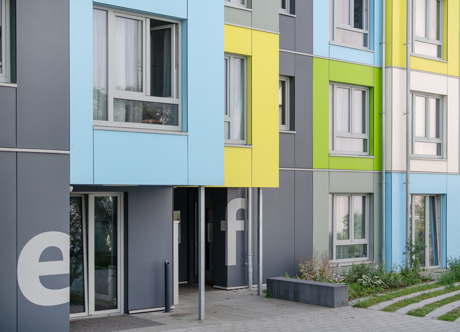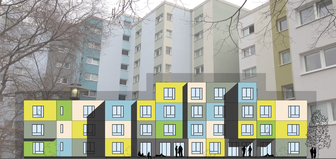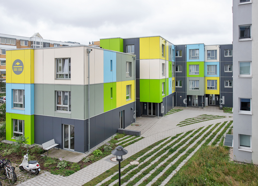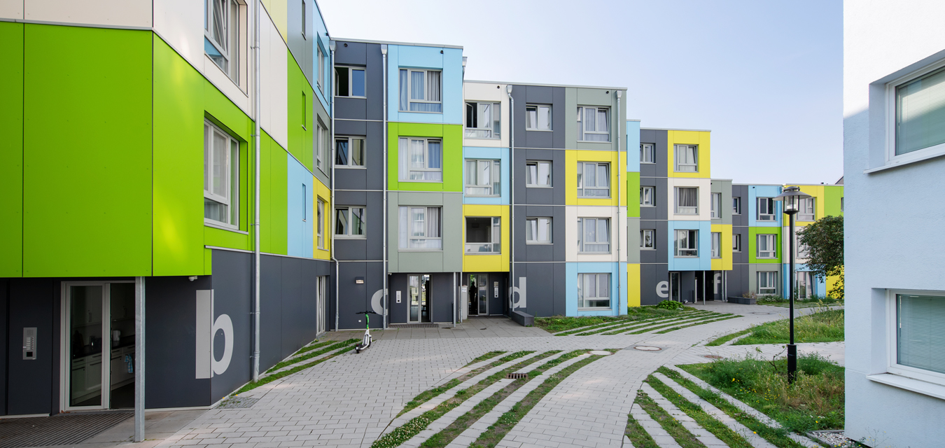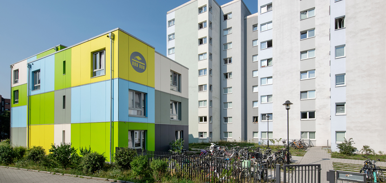 Diese 86 neuen Wohneinheiten mit Bad und Gemeinschaftsküchen wurden neben dem voll vermieteten Bestandsgebäude in extrem kurzer Bauzeit errichtet. Nach dem Betonieren des Fundaments und der Treppenhäuser, wurden die vorgefertigten Holzcontainer innerhalb von wenigen Wochen aufeinandergestapelt. Durch die Bogenform des Neubaus entsteht ein reizvoller Zwischenraum zum Bestandsgebäude. Die unterschiedlichen Farben der Container erzeugen eine gestalterische Leichtigkeit des neuen Bauvolumens und schaffen individuelle Identität für die Bewohner. Die kräftigen Farben sind die neue Variante der Pastellfarben der Bestandsfassade und bilden gemeinsam ein harmonisches neues Ensemble.