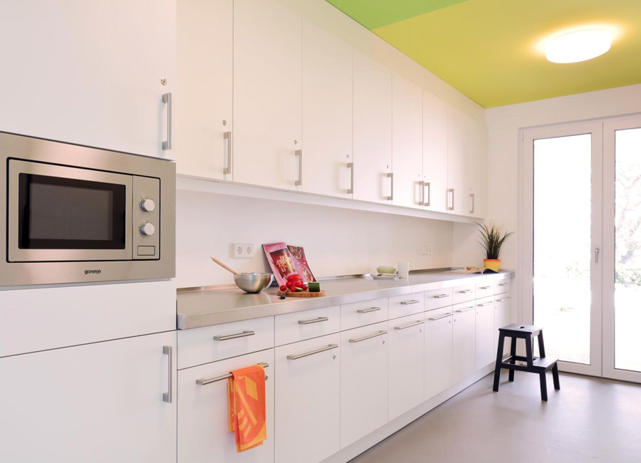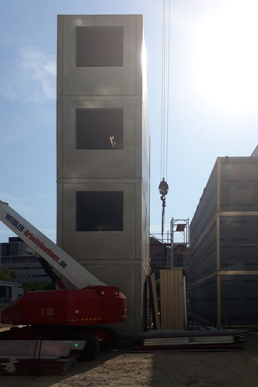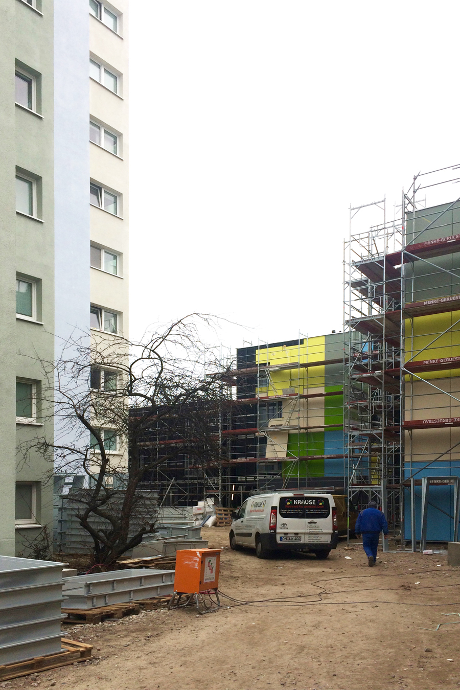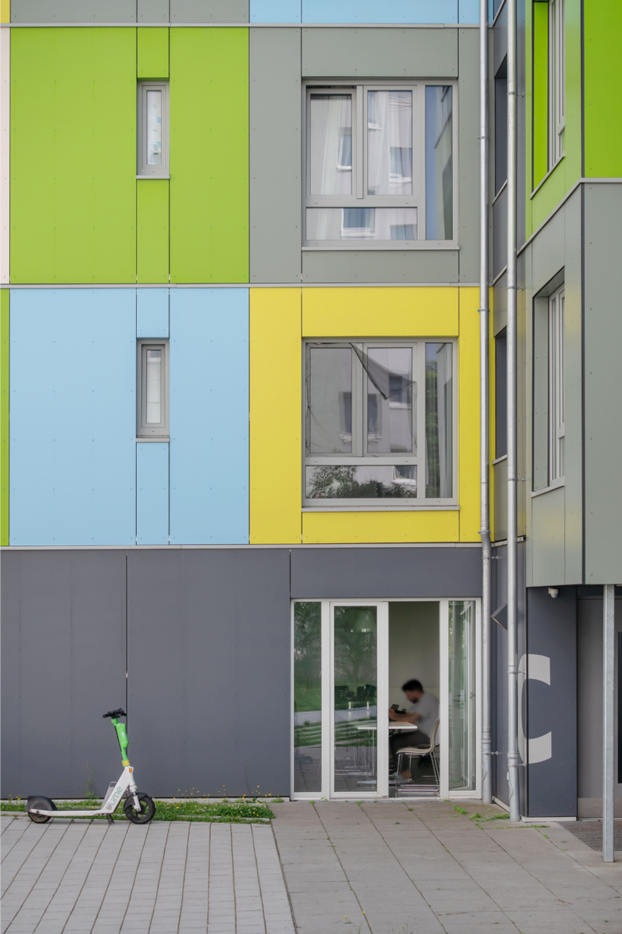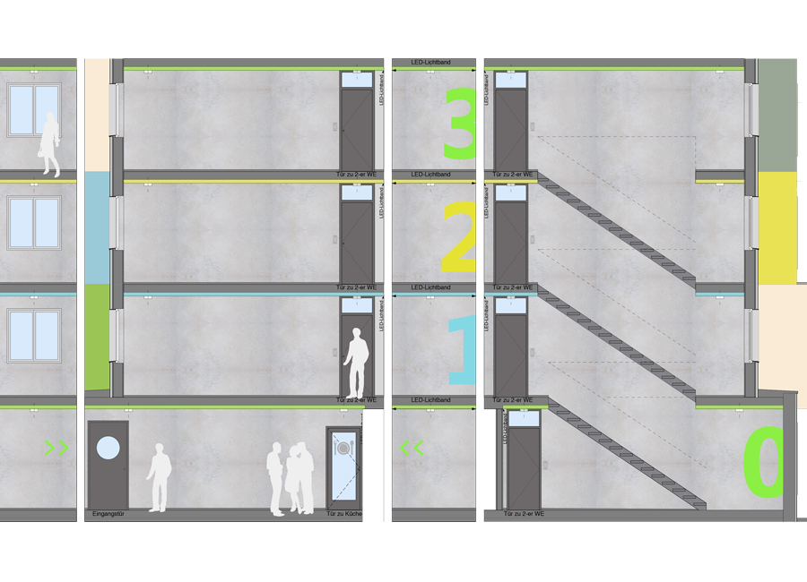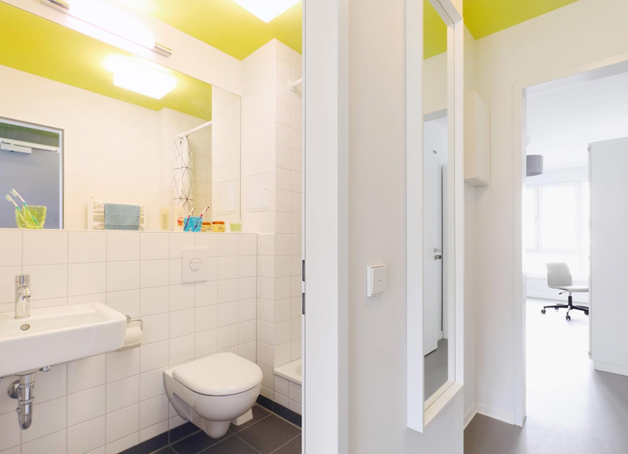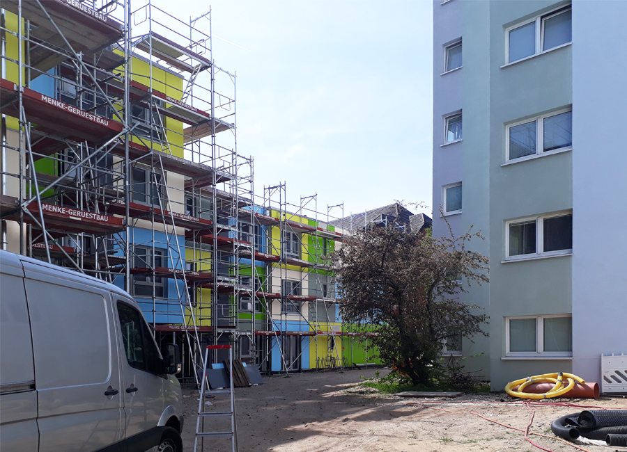Diese 86 neuen Wohneinheiten mit Bad und Gemeinschaftsküchen wurden neben dem voll vermieteten Bestandsgebäude in extrem kurzer Bauzeit errichtet. Nach dem Betonieren des Fundaments und der Treppenhäuser, wurden die vorgefertigten Holzcontainer innerhalb von wenigen Wochen aufeinandergestapelt. Durch die Bogenform des Neubaus entsteht ein reizvoller Zwischenraum zum Bestandsgebäude. Die unterschiedlichen Farben der Container erzeugen eine gestalterische Leichtigkeit des neuen Bauvolumens und schaffen individuelle Identität für die Bewohner. Die kräftigen Farben sind die neue Variante der Pastellfarben der Bestandsfassade und bilden gemeinsam ein harmonisches neues Ensemble.