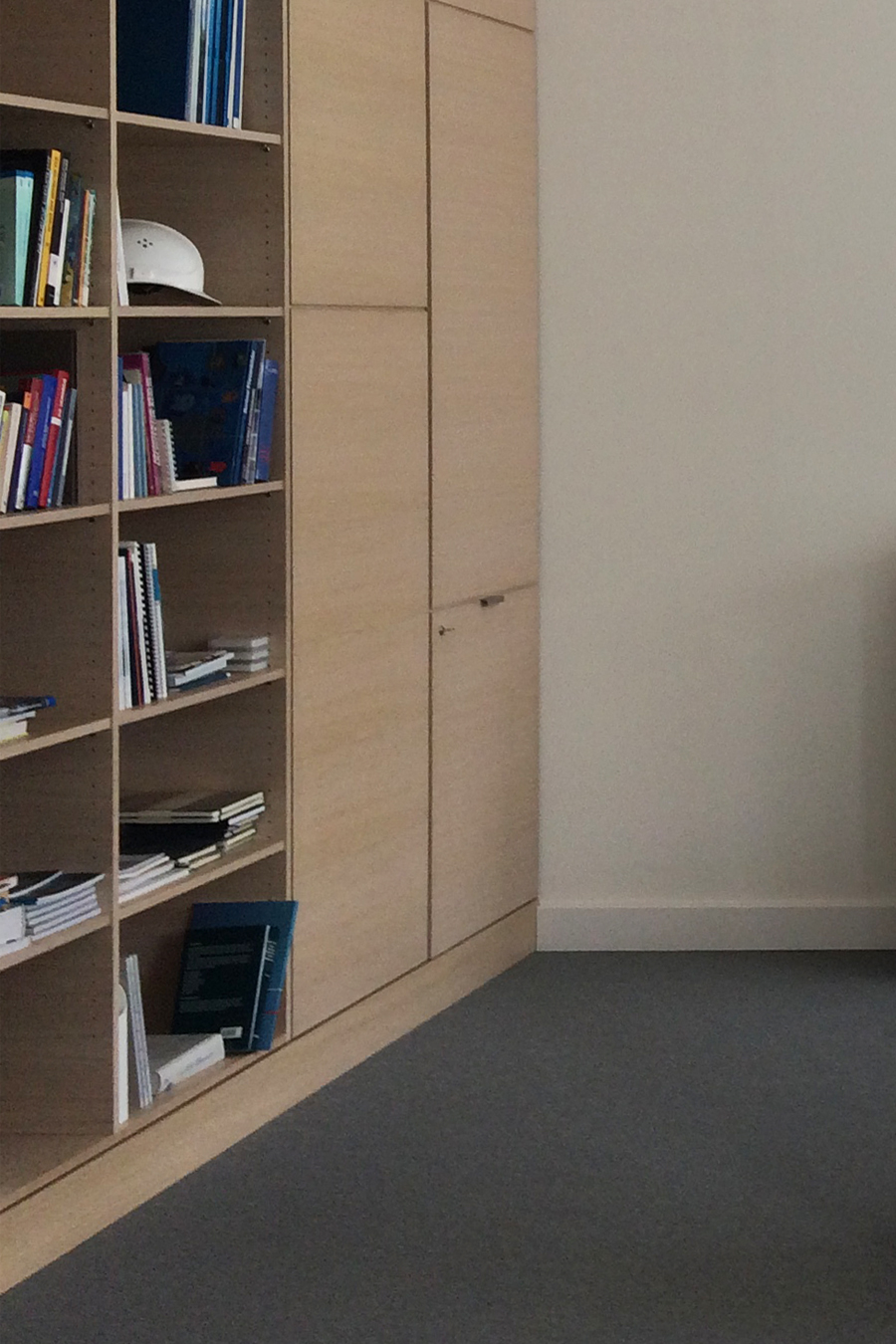 Schon das Sekretariat ist nun strukturiert, funktional und vermittelt am vorgelagerten Tresen Ansprechbarkeit und Kompetenz. Das Büro erscheint einladend und nahbar, weiche Oberflächen sorgen für entspannte Akustik. Im seitlichen Einbaumöbel verbergen sich Arbeitsmaterialien, kleine Bewirtungsmöglichkeiten und ein Kleiderschrank mit Schminkplatz. Auch ein Platz für Sicherheitskleidung oder verdreckte Schuhe nach dem Einsatz an der Basis ist vorhanden. Ein ausklappbarer Stehtisch lädt zum schnellen, konstruktiven Gespräch ein. Die helle, aufgeräumte und einladende Gesamtatmosphäre spiegelt die gewünschten Prioritäten des Vorstands wieder.