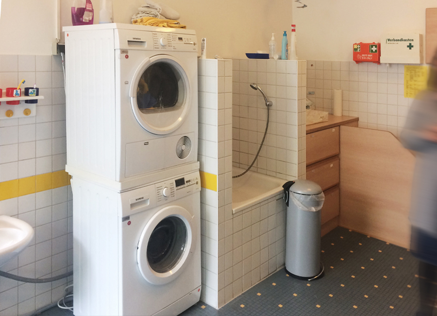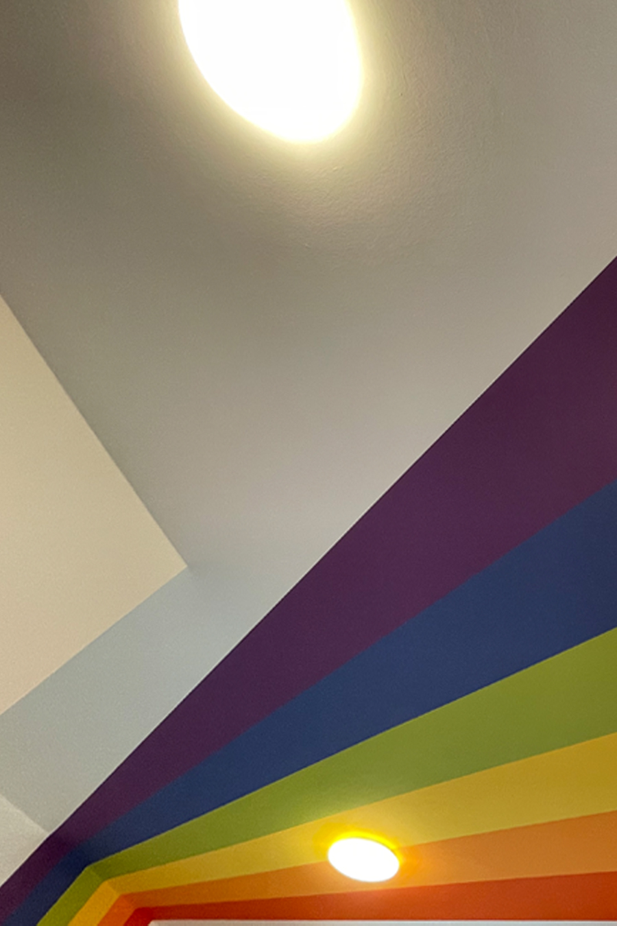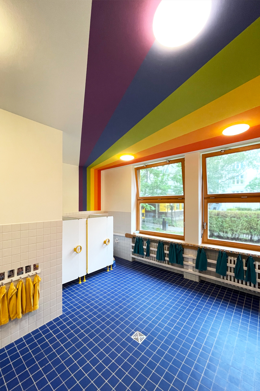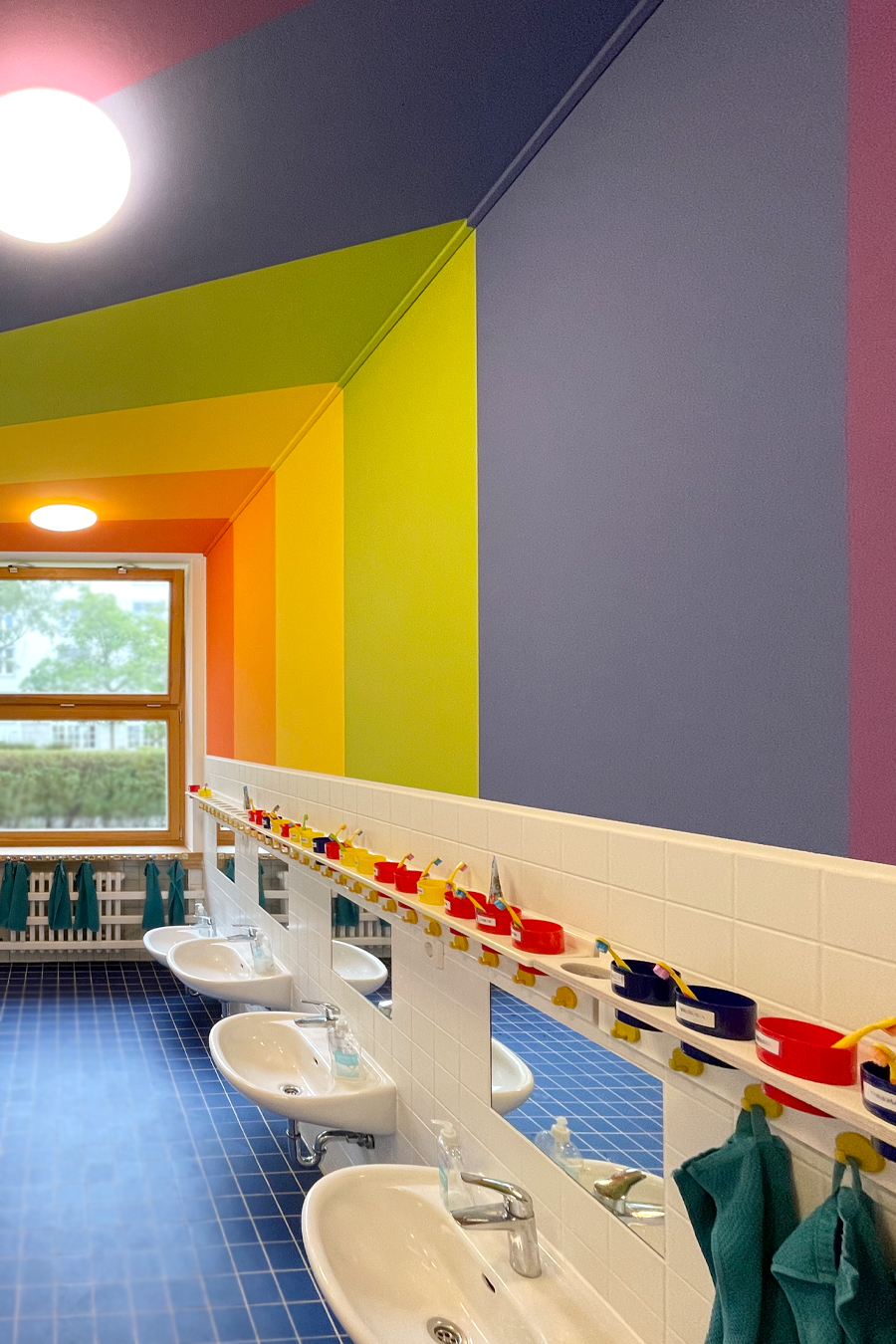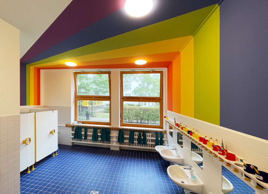 Zuerst muss die Funktion angepasst werden. Die Wäscheaufbereitung erhält einen eigenen Raum, der mit dem Personalbereich verknüpft wird. Dadurch werden die kleinen WC und ihre Kabinen ein wenig verschoben. Die Fliesen hinter den Waschtischen erhalten einen frischen Anstrich, die Bodenfliesen werden erneuert. Eine neue Dusche wird installiert. Soweit die Pflicht, die Kür ist die kindgerechte Gestaltung. Ein überdimensionaler, aufgemalter Regenbogen, der sich von der einen Wand über die gesamte Decke bis zur gegenüberliegenden Wand erstreckt erzählt die Geschichte von Wassertropfen, die sich im Sonnenlicht in leuchtend bunte Streifen verwandeln.