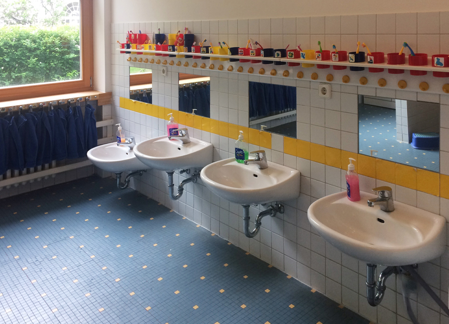 Der Waschraum einer Kita wird stark beansprucht und soll deshalb nicht nur robust und widerstandsfähig sein, sondern auch die Freude an Waschen und Selbstständigkeit fördern. Dabei soll nachhaltig soviel, wie möglich erhalten und wiederverwendet werden. Und natürlich soll die Gestaltung mit geringen Mitteln eine kindgerechte Geschichte erzählen.