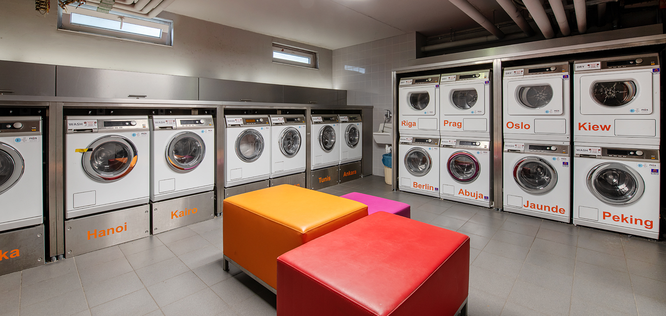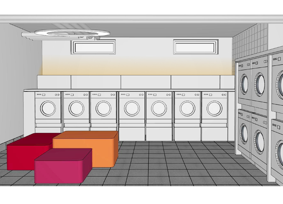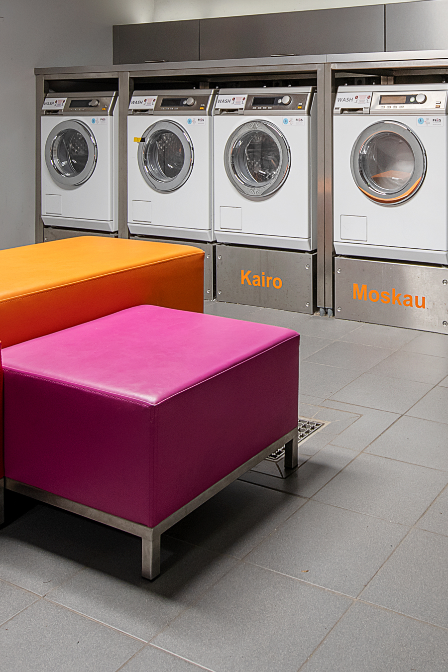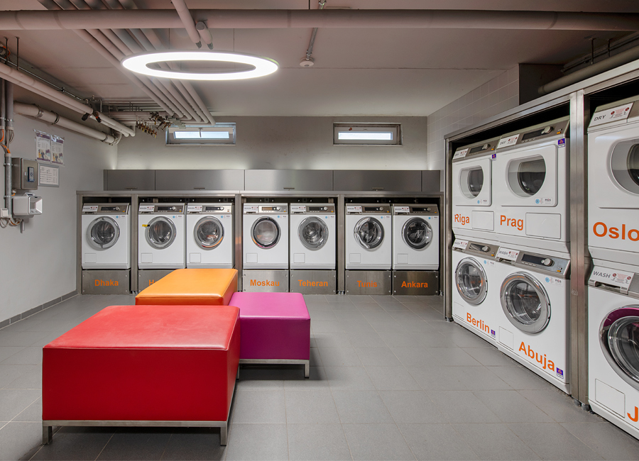 Schon der Weg in den Keller ist deutlich und international lesbar ab dem Hauseingang ausgeschildert. Das schafft Sicherheit und Wohlbefinden. Der kleine Raum selbst ist gut strukturiert und übersichtlich. 11 Waschmaschinen und 4 Trockner können per App ausgewählt und überwacht werden. Die reversible Umbauung sichert die technischen Anschlüsse und verhindert Müll und Wäschestücke zwischen und hinter den Maschinen. Ein Dosiergerät im Nebenraum sorgt für saubere Maschinen und immer das richtige Waschmittel. Und weil es so schön ist, lädt eine farbenfrohe Sitzgruppe im Raum zum Verweilen oder Warten ein.