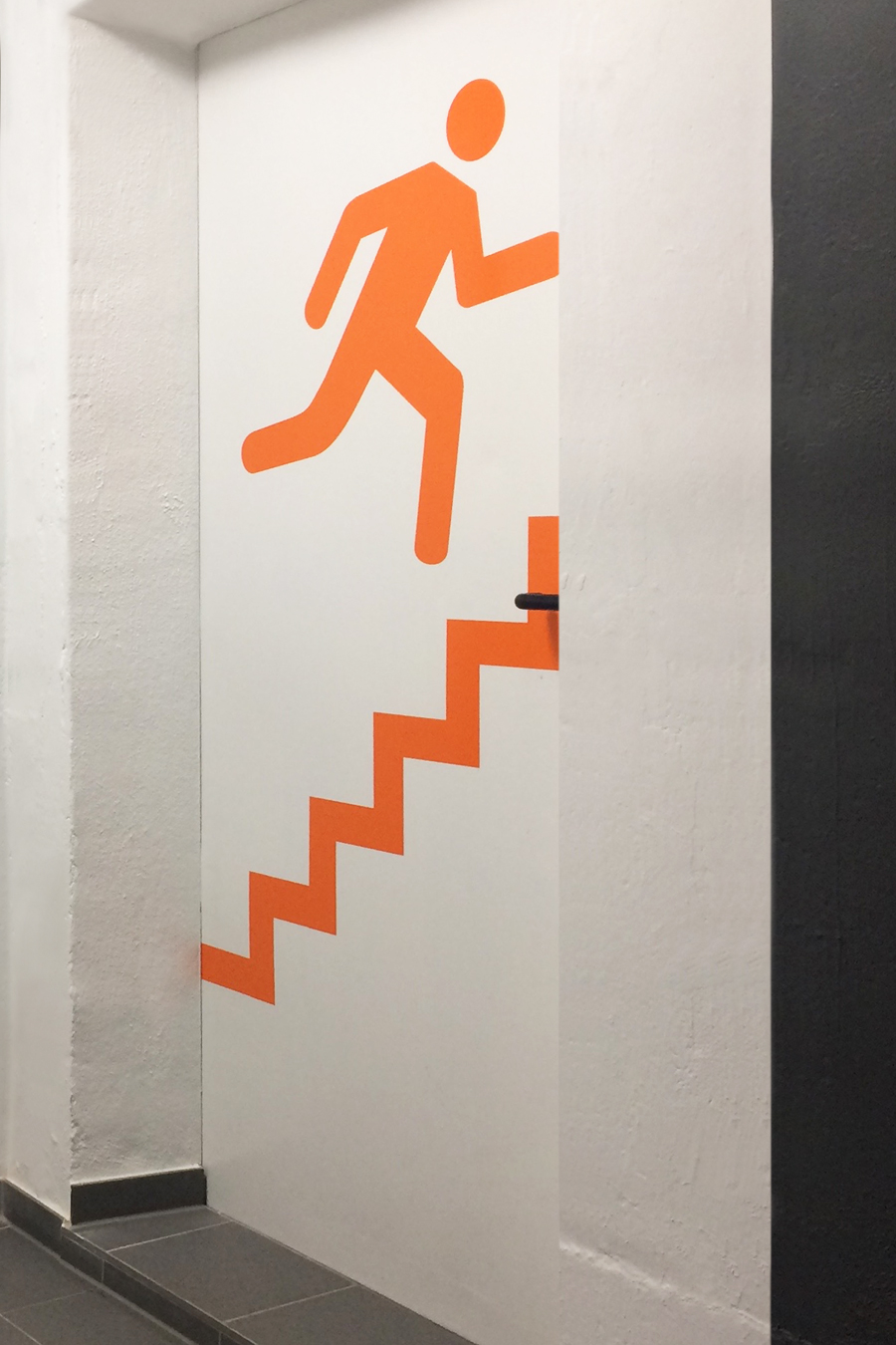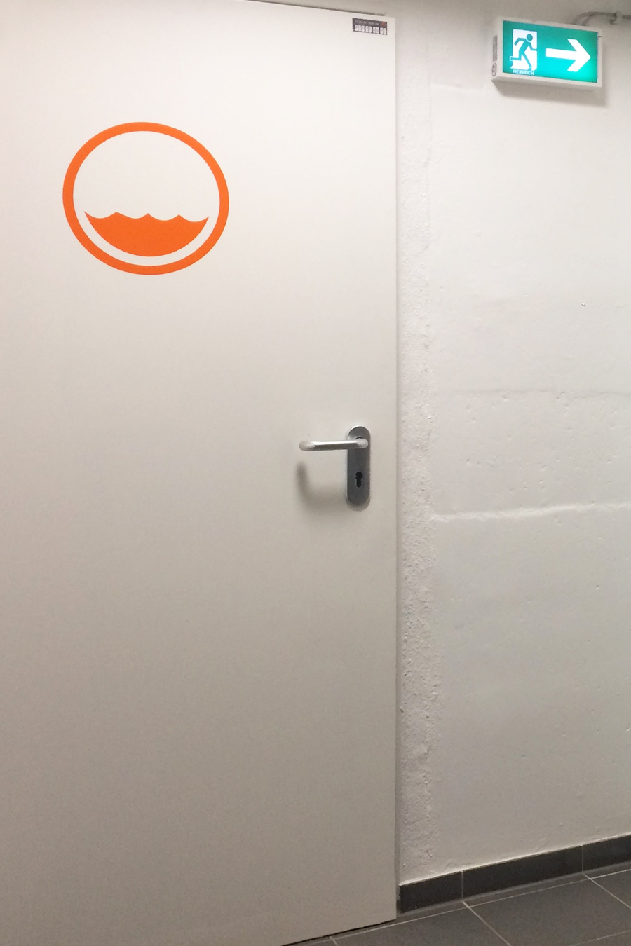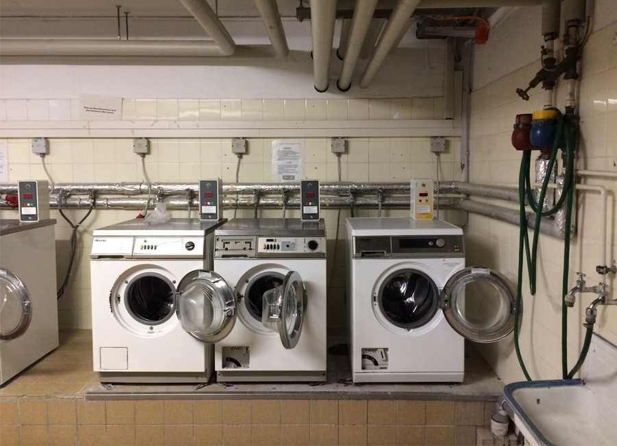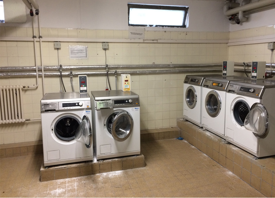 Schon der Weg in den Keller ist deutlich und international lesbar ab dem Hauseingang ausgeschildert. Das schafft Sicherheit und Wohlbefinden. Der kleine Raum selbst ist gut strukturiert und übersichtlich. 11 Waschmaschinen und 4 Trockner können per App ausgewählt und überwacht werden. Die reversible Umbauung sichert die technischen Anschlüsse und verhindert Müll und Wäschestücke zwischen und hinter den Maschinen. Ein Dosiergerät im Nebenraum sorgt für saubere Maschinen und immer das richtige Waschmittel. Und weil es so schön ist, lädt eine farbenfrohe Sitzgruppe im Raum zum Verweilen oder Warten ein.