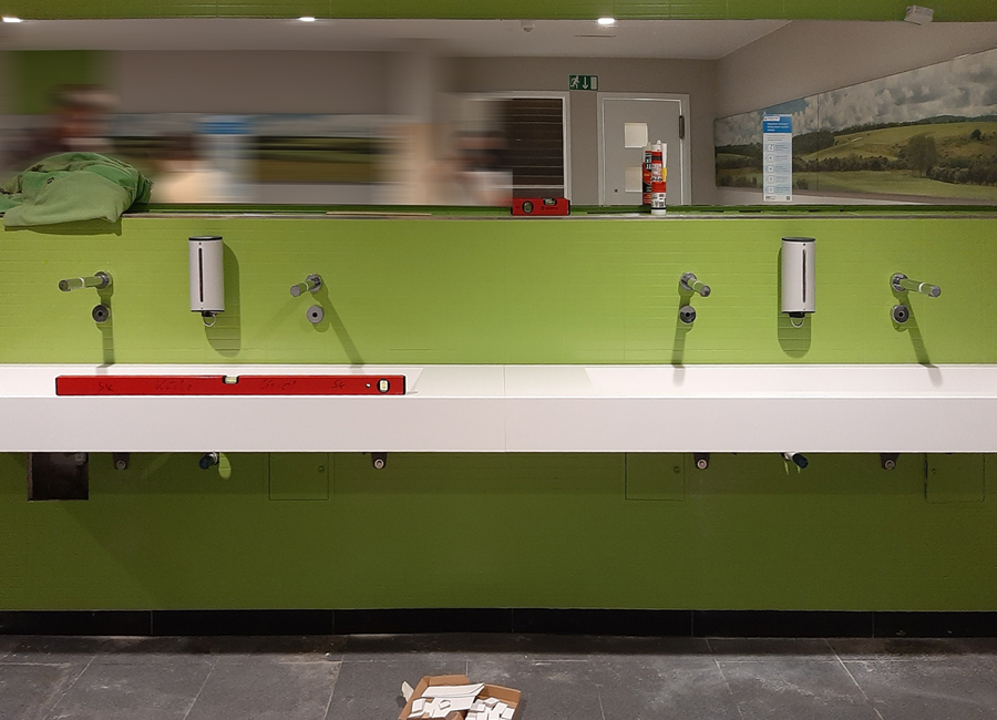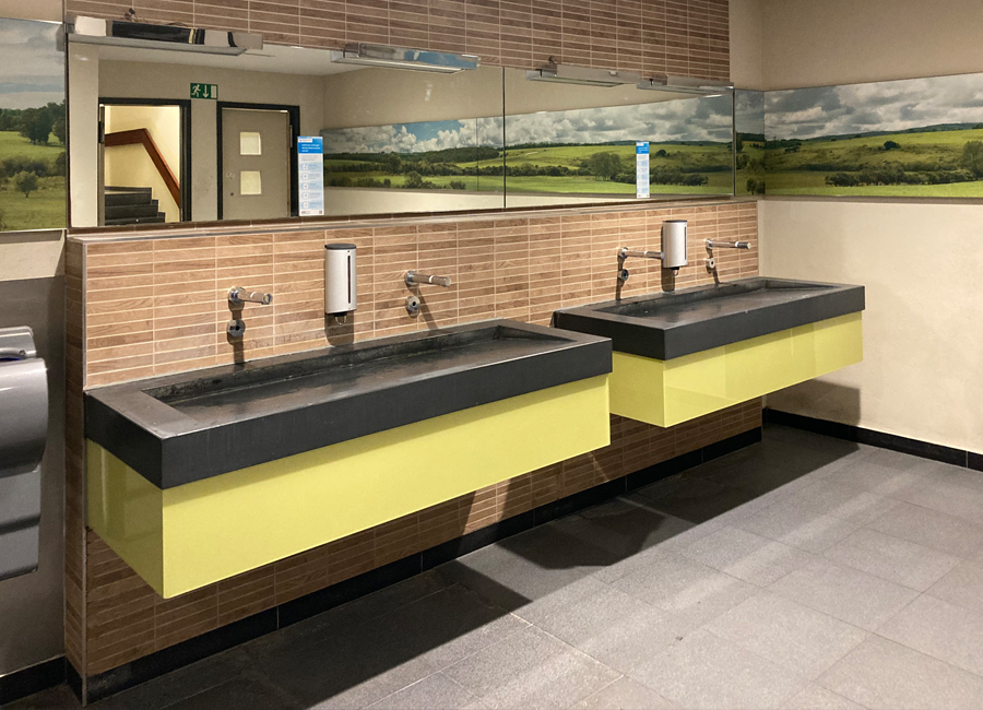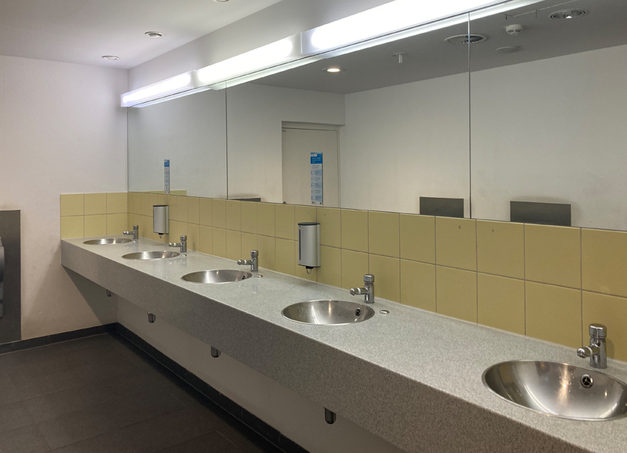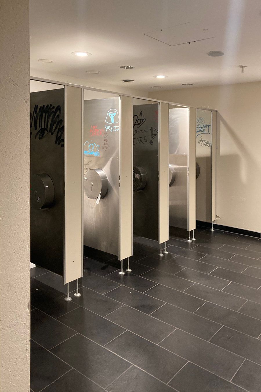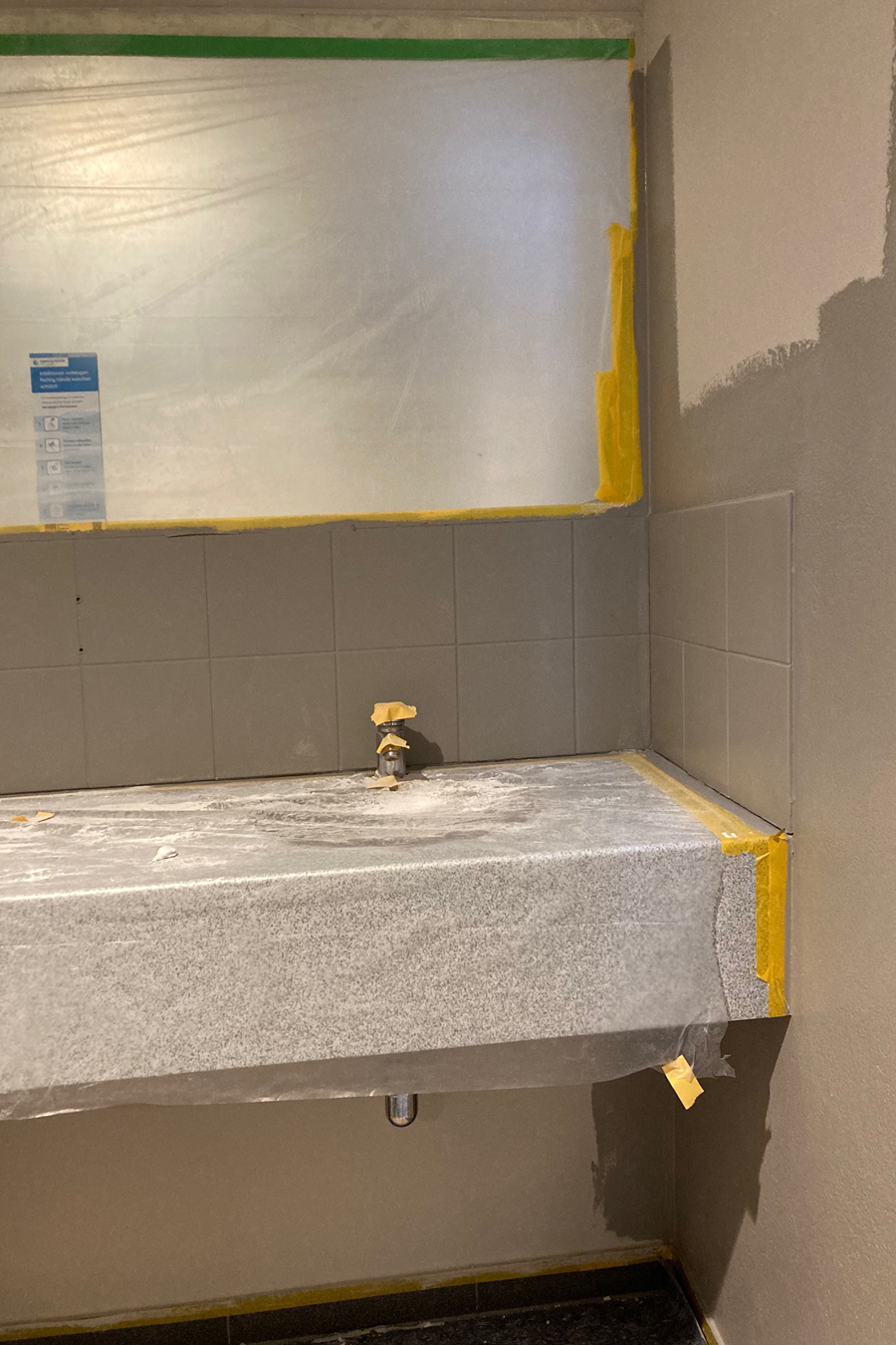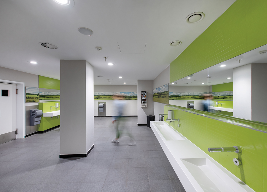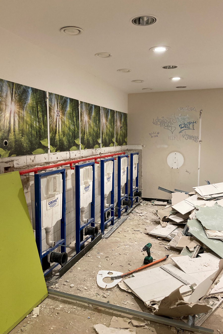 Die vorhandene Substanz wird behutsam und nachhaltig aufgefrischt, wo notwendig Sanitärobjekte erneuert und Licht funktionaler aber auch stimmungsvoller ergänzt. Die Renovierung dauert für die Damen 2 Wochen, für die Herren sechs wegen komplett neuer WC Anlagen. Während der Bauzeit wird das jeweils andere WC unisex genutzt, die Reinigungsfrequenz kurzzeitig erhöht. So entstehen in kurzer Zeit zwei neue Erlebniswelten ohne den erwartbaren Kellerhabitus. Denn Orte, die gut gestaltet sind, spiegeln einerseits die Wertschätzung des Betreibers auch für vorgeblich untergeordnete Räume wider und veranlassen andererseits die Nutzer zu achtsamerem Umgang damit.