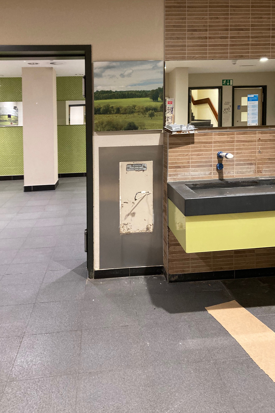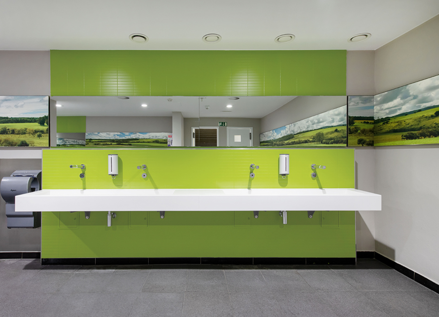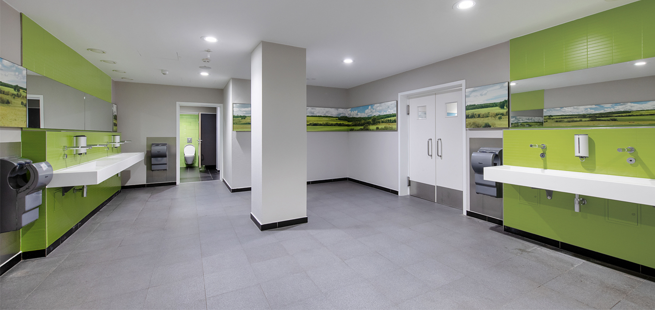 Eine große WC Anlage im Keller eines öffentlichen Gebäudes muß nicht gruselig sein und die gestalterische Auffrischung nicht Jahre dauern und Unmengen kosten. In diesem Damen- und Herrenbereich wird der Weg in den Keller dank großzügiger Wandbilder in eine visuelle Reise aufs Land oder in die Großstadt bei Nacht verwandelt....