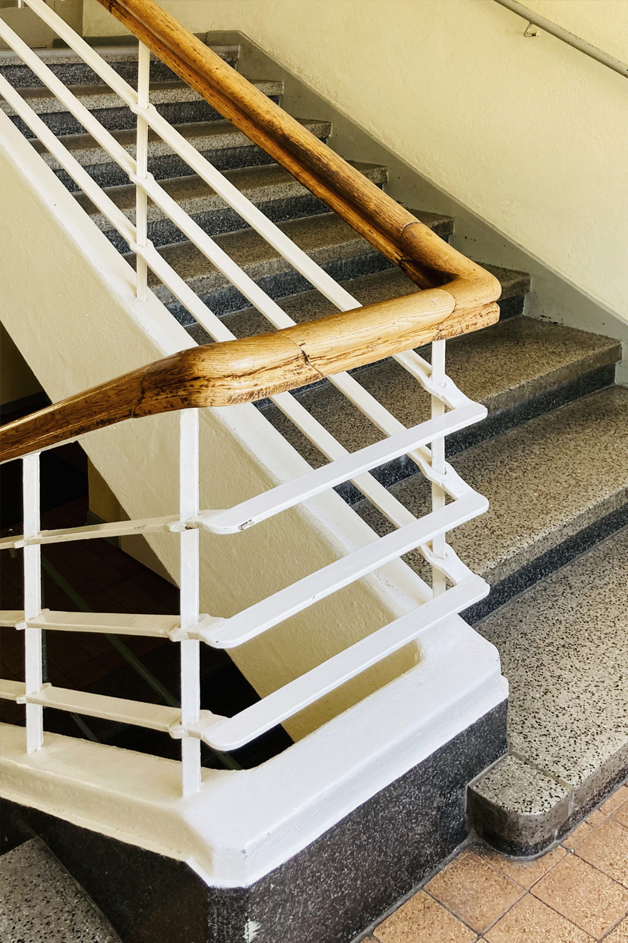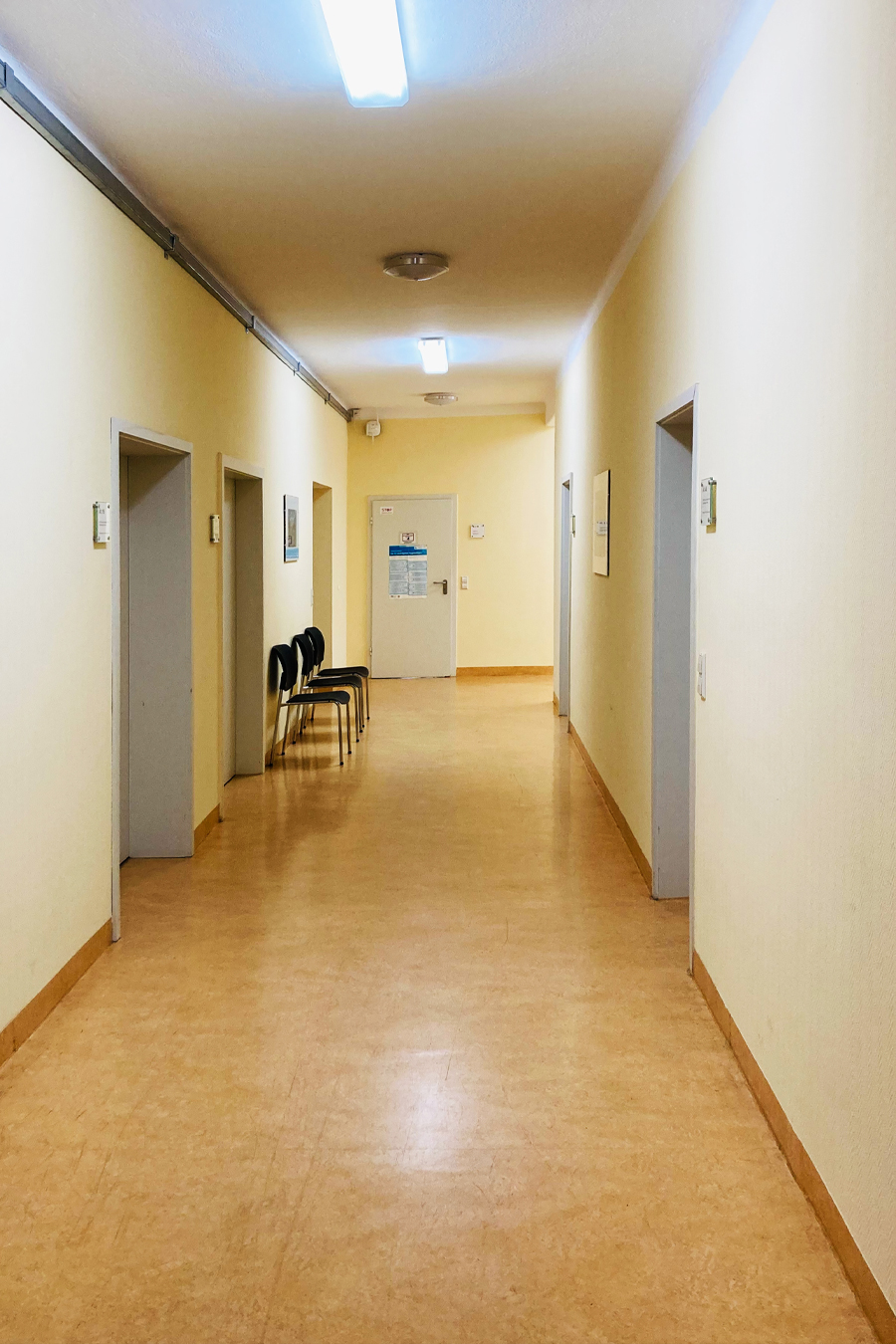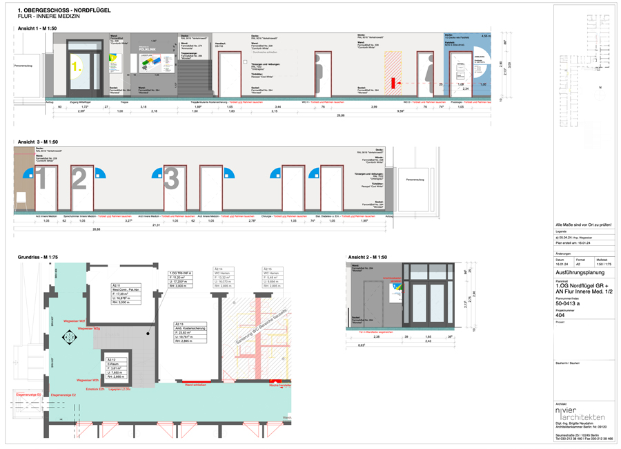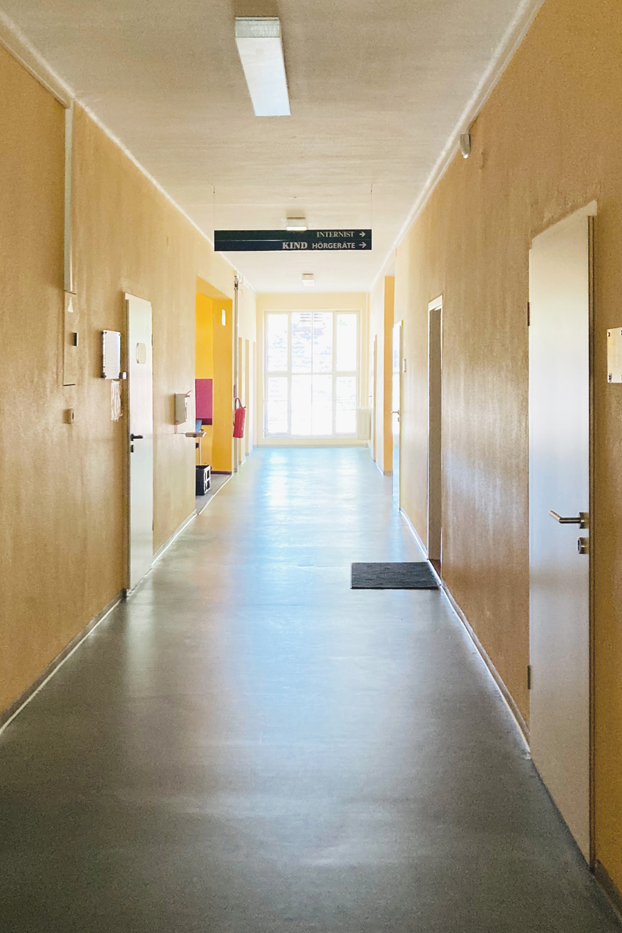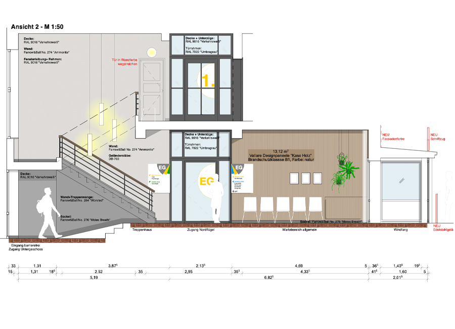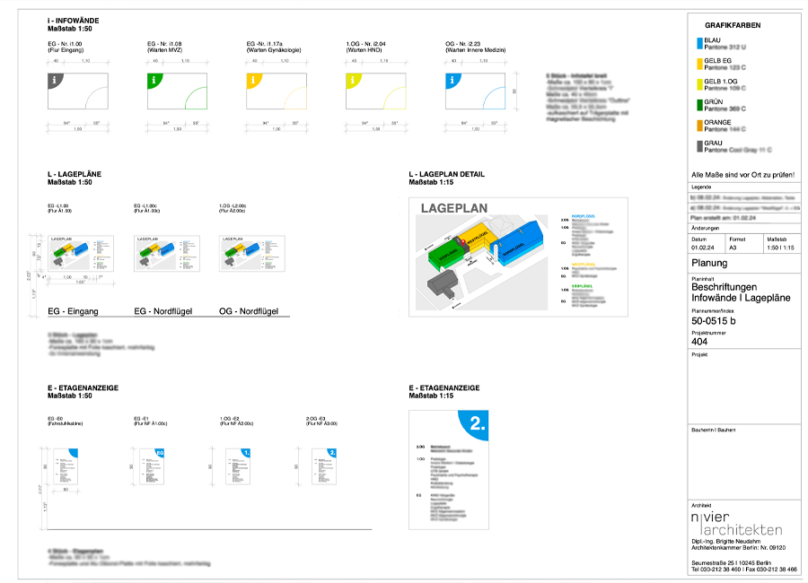 ...was noch nutzbar ist. Ein neues Farbkonzept, basierend auf den vorherrschenden Farben der verbleibenden Bodenbeläge schafft in jedem Bauteil eine wiedererkennbare Identität. Dezente Farben für die fälligen Wandanstriche lassen die Bodenbeläge wertiger erscheinen und bieten einen ruhigen Hintergrund für das neue farbige Leitsystem. Übersichtstafeln an den Eingängen initiieren die Farbcodes der einzelnen Bereiche, farbige Anstriche von Wand und Decke um die Türen der Anmeldungen herum schaffen Orientierung in den langen Fluren. Wiederverwendete Bestuhlung und Spreewaldmotive runden das neue Bild der alten Klinik ab.