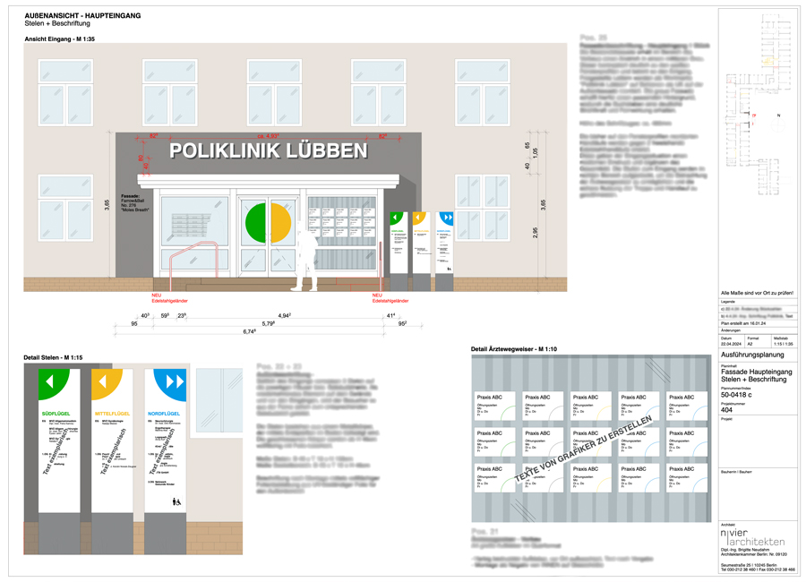 Eine Poliklinik im Spreewald ist wichtige Anlaufstelle für die ganze Umgebung. Die Gestaltung vermittelt aber nicht mehr die Qualität der Behandlung. Und die Unübersichtlichkeit der einzelnen Gebäudeteile verursacht schon beim Betreten ein gewisses Unbehagen. Ein Schilderwald verstärkt dann noch die Unsicherheit. Die Mittel sind begrenzt, es soll erhalten bleiben,...