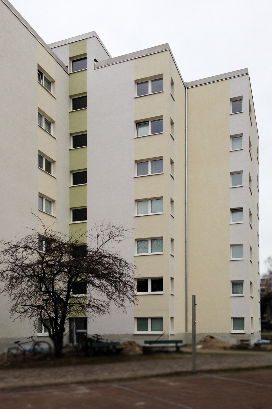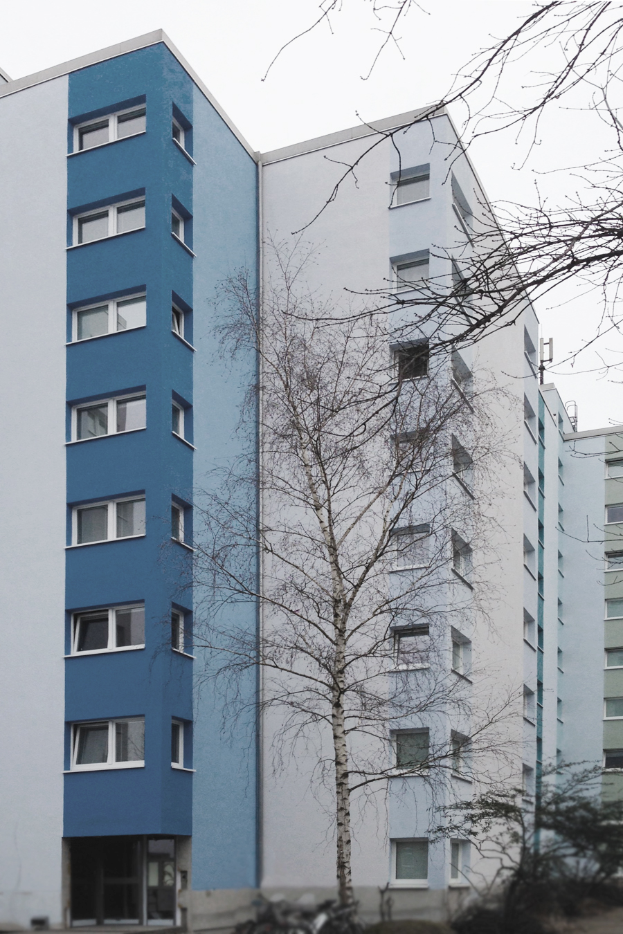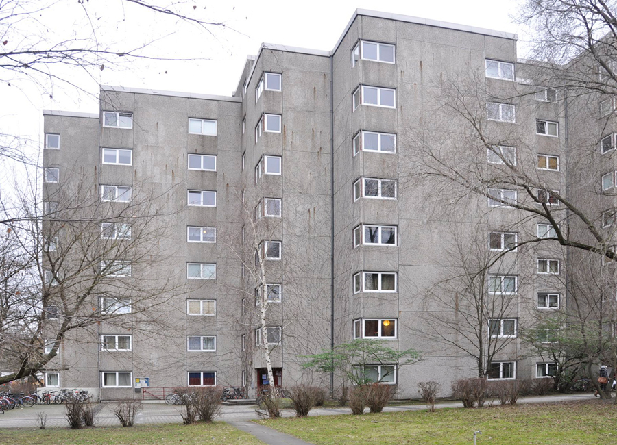 Diese 86 neuen Wohneinheiten mit Bad und Gemeinschaftsküchen wurden neben dem voll vermieteten Bestandsgebäude in extrem kurzer Bauzeit errichtet. Nach dem Betonieren des Fundaments und der Treppenhäuser, wurden die vorgefertigten Holzcontainer innerhalb von wenigen Wochen aufeinandergestapelt. Durch die Bogenform des Neubaus entsteht ein reizvoller Zwischenraum zum Bestandsgebäude. Die unterschiedlichen Farben der Container erzeugen eine gestalterische Leichtigkeit des neuen Bauvolumens und schaffen individuelle Identität für die Bewohner. Die kräftigen Farben sind die neue Variante der Pastellfarben der Bestandsfassade und bilden gemeinsam ein harmonisches neues Ensemble.