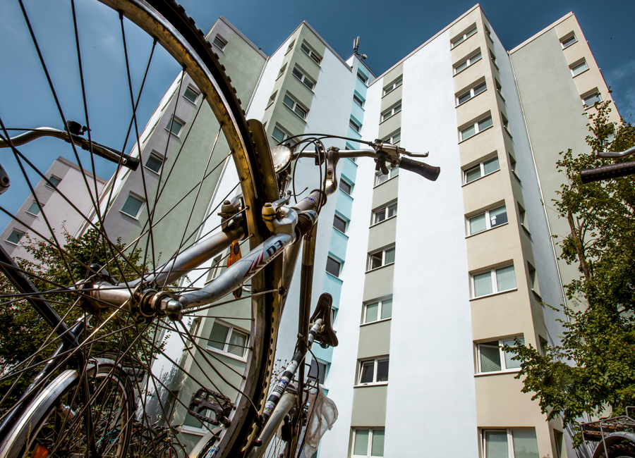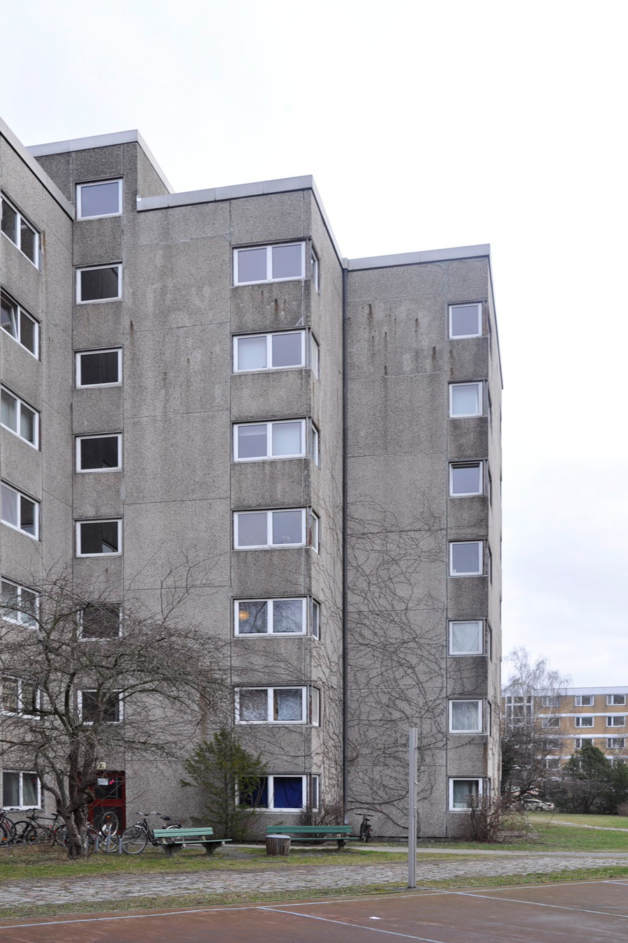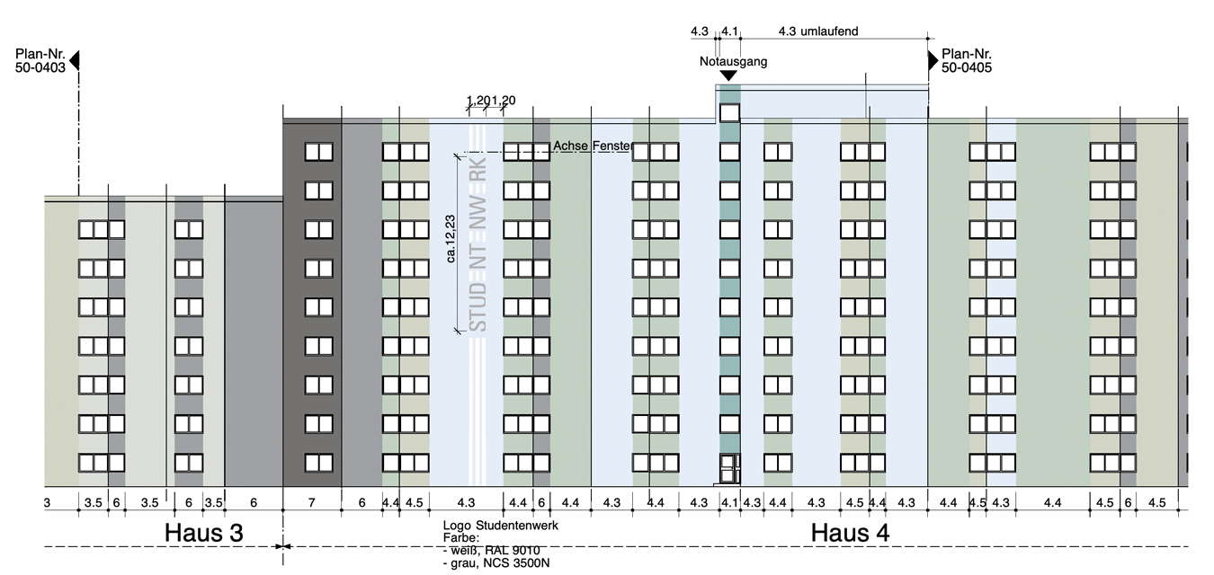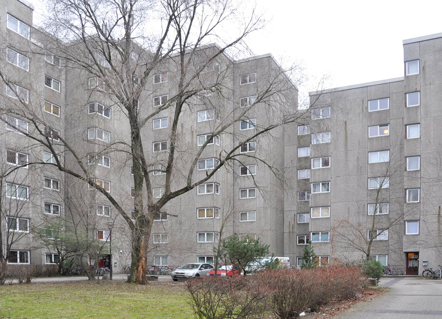 Diese 86 neuen Wohneinheiten mit Bad und Gemeinschaftsküchen wurden neben dem voll vermieteten Bestandsgebäude in extrem kurzer Bauzeit errichtet. Nach dem Betonieren des Fundaments und der Treppenhäuser, wurden die vorgefertigten Holzcontainer innerhalb von wenigen Wochen aufeinandergestapelt. Durch die Bogenform des Neubaus entsteht ein reizvoller Zwischenraum zum Bestandsgebäude. Die unterschiedlichen Farben der Container erzeugen eine gestalterische Leichtigkeit des neuen Bauvolumens und schaffen individuelle Identität für die Bewohner. Die kräftigen Farben sind die neue Variante der Pastellfarben der Bestandsfassade und bilden gemeinsam ein harmonisches neues Ensemble.