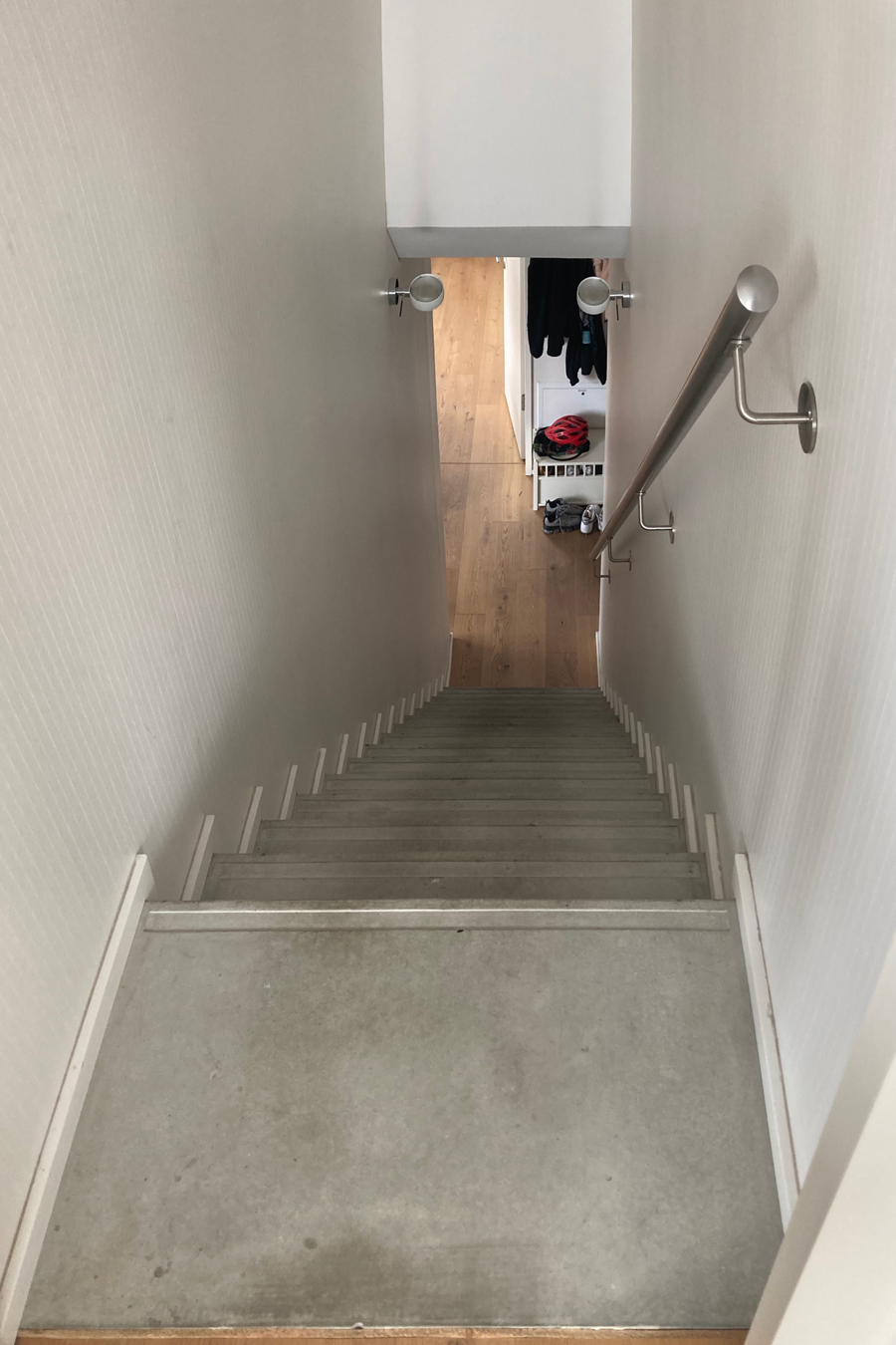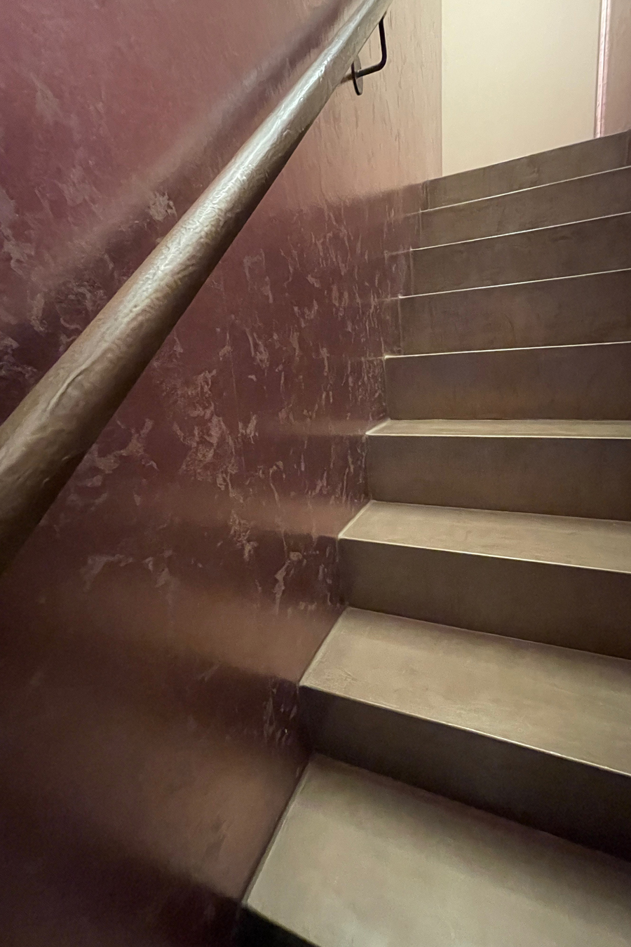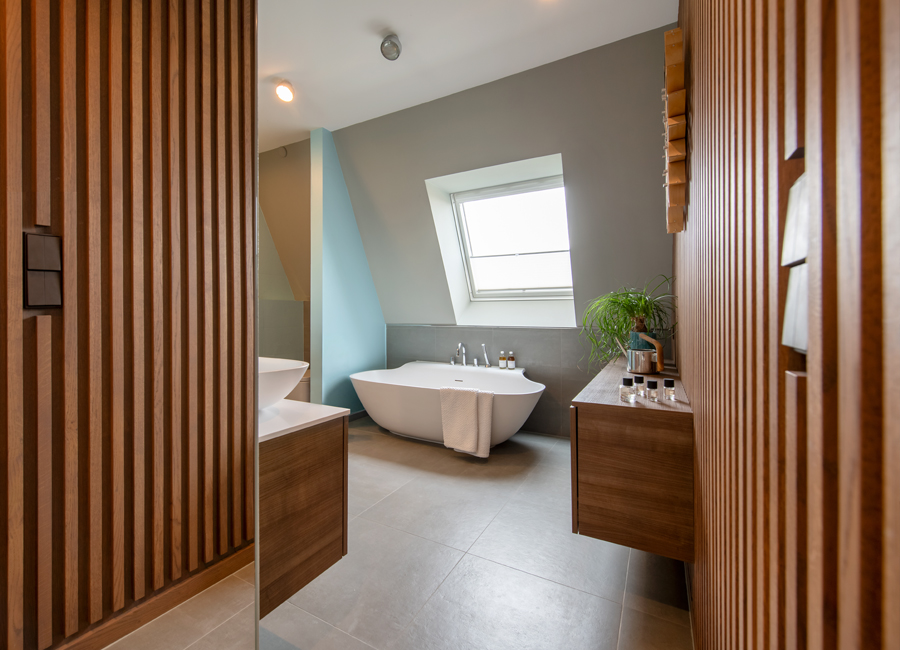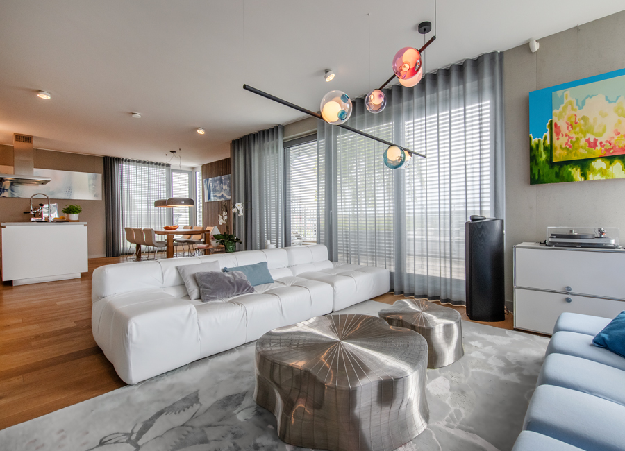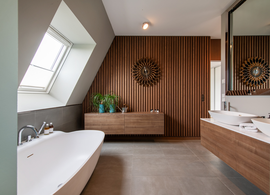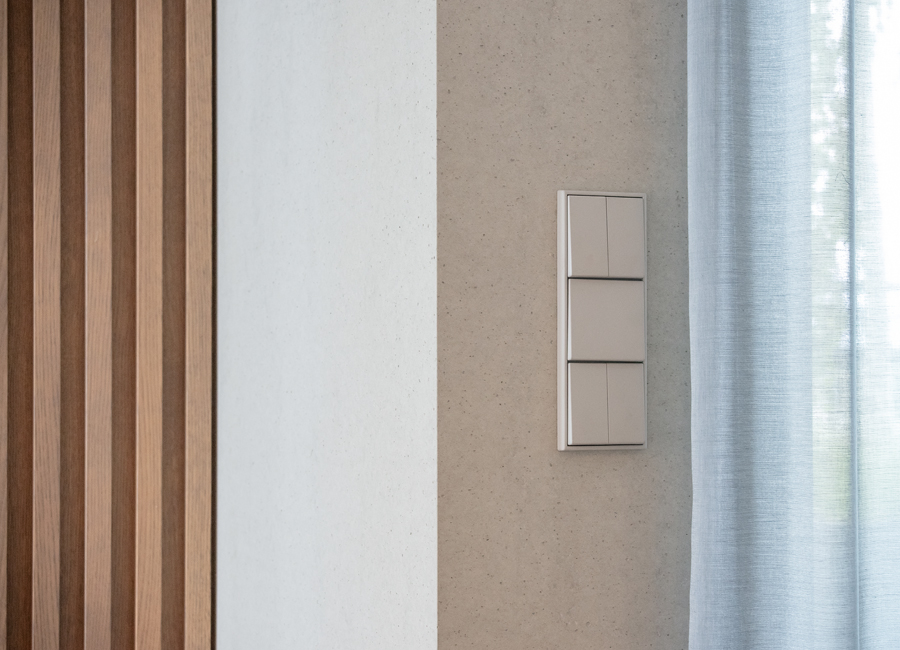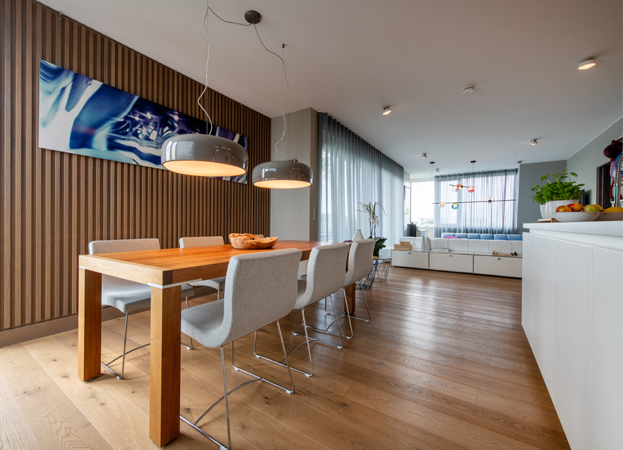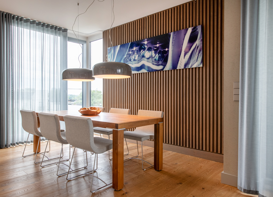 Die bestehende Qualität zu erkennen, respektvoll zu ergänzen und neue, passende Elemente zu finden ist hier die Aufgabe. Der leuchtend farbige Anstrich im kleinen Gäste WC bewirkt ein ganz neues Raumerlebnis. Im großen Bad sorgen nun eine Lamellenwand und natürliche Materialien für gute Akustik und wohnliche Atmosphäre. Das Wohnzimmer mit offenem Koch-/Essbereich wirkt stimmig und gestaltet. Wandpaneele in Betonoptik schaffen einen charaktervollen Hintergrund für die exquisite Einrichtung der Bewohner. Vorhänge sorgen für Wohnlichkeit und zusammen mit der Lamellenwand am Esstisch für entspannte Akustik. Und die vergoldete Treppe mit ausdrucksstarkem Lichtobjekt sorgt nun für Begeisterung.