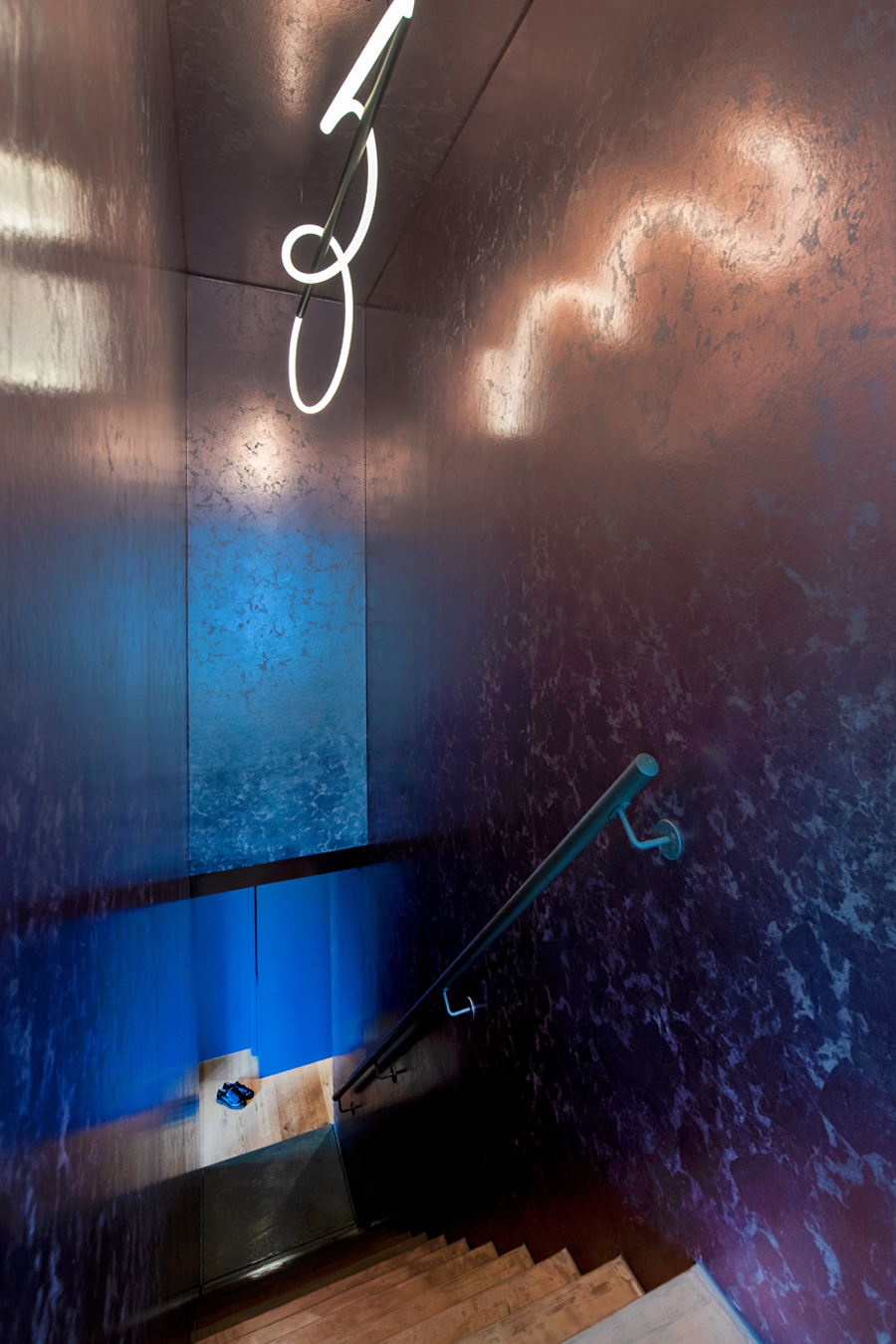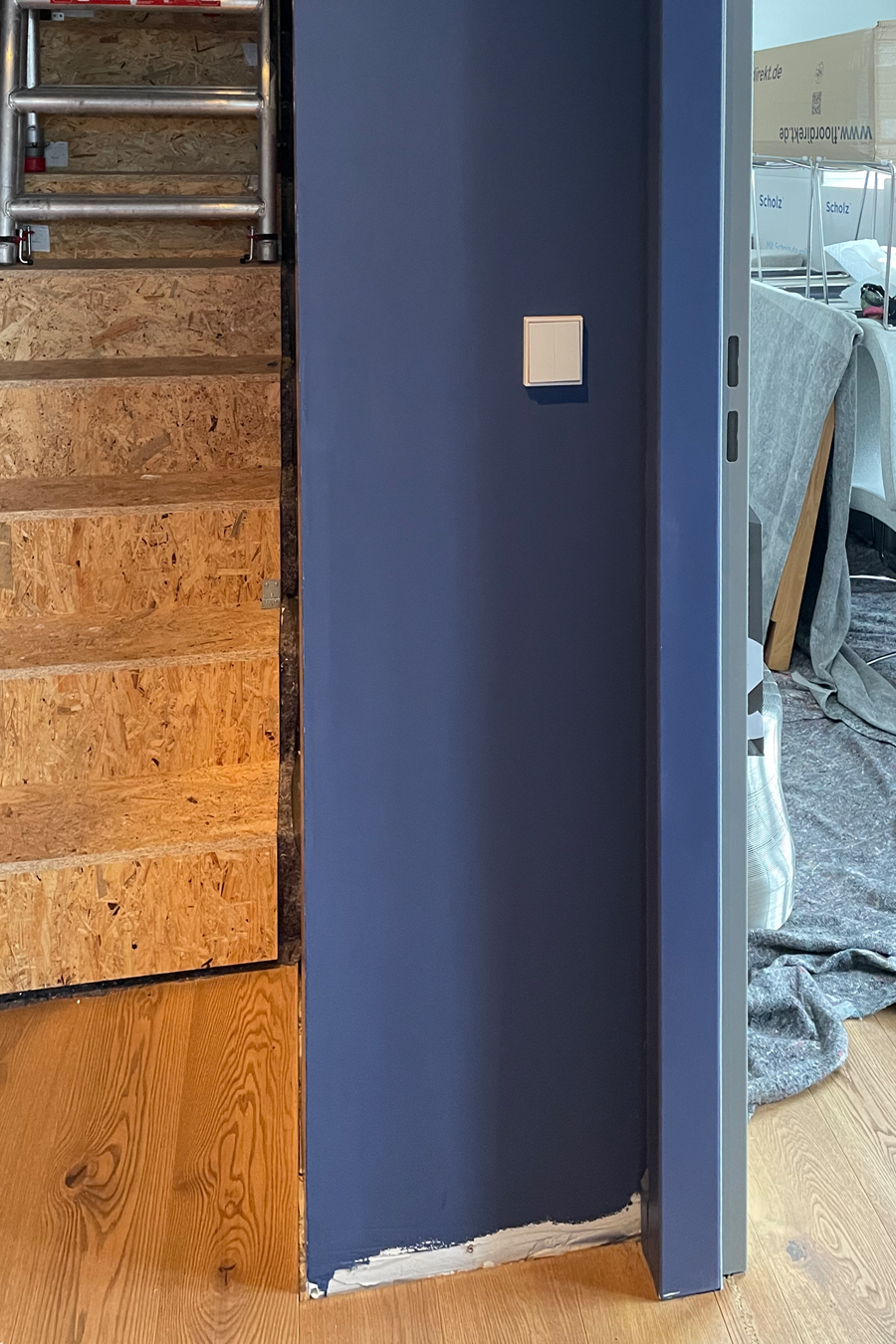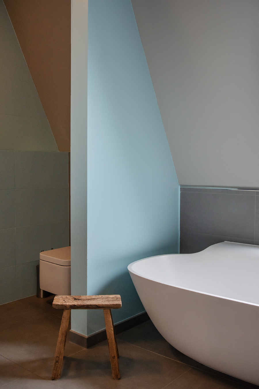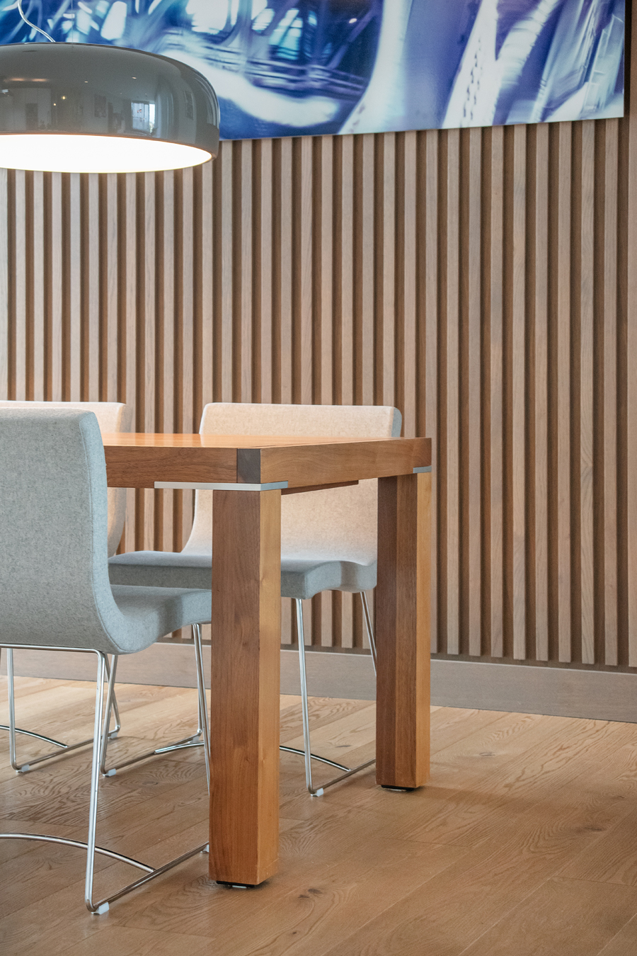 Die bestehende Qualität zu erkennen, respektvoll zu ergänzen und neue, passende Elemente zu finden ist hier die Aufgabe. Der leuchtend farbige Anstrich im kleinen Gäste WC bewirkt ein ganz neues Raumerlebnis. Im großen Bad sorgen nun eine Lamellenwand und natürliche Materialien für gute Akustik und wohnliche Atmosphäre. Das Wohnzimmer mit offenem Koch-/Essbereich wirkt stimmig und gestaltet. Wandpaneele in Betonoptik schaffen einen charaktervollen Hintergrund für die exquisite Einrichtung der Bewohner. Vorhänge sorgen für Wohnlichkeit und zusammen mit der Lamellenwand am Esstisch für entspannte Akustik. Und die vergoldete Treppe mit ausdrucksstarkem Lichtobjekt sorgt nun für Begeisterung.