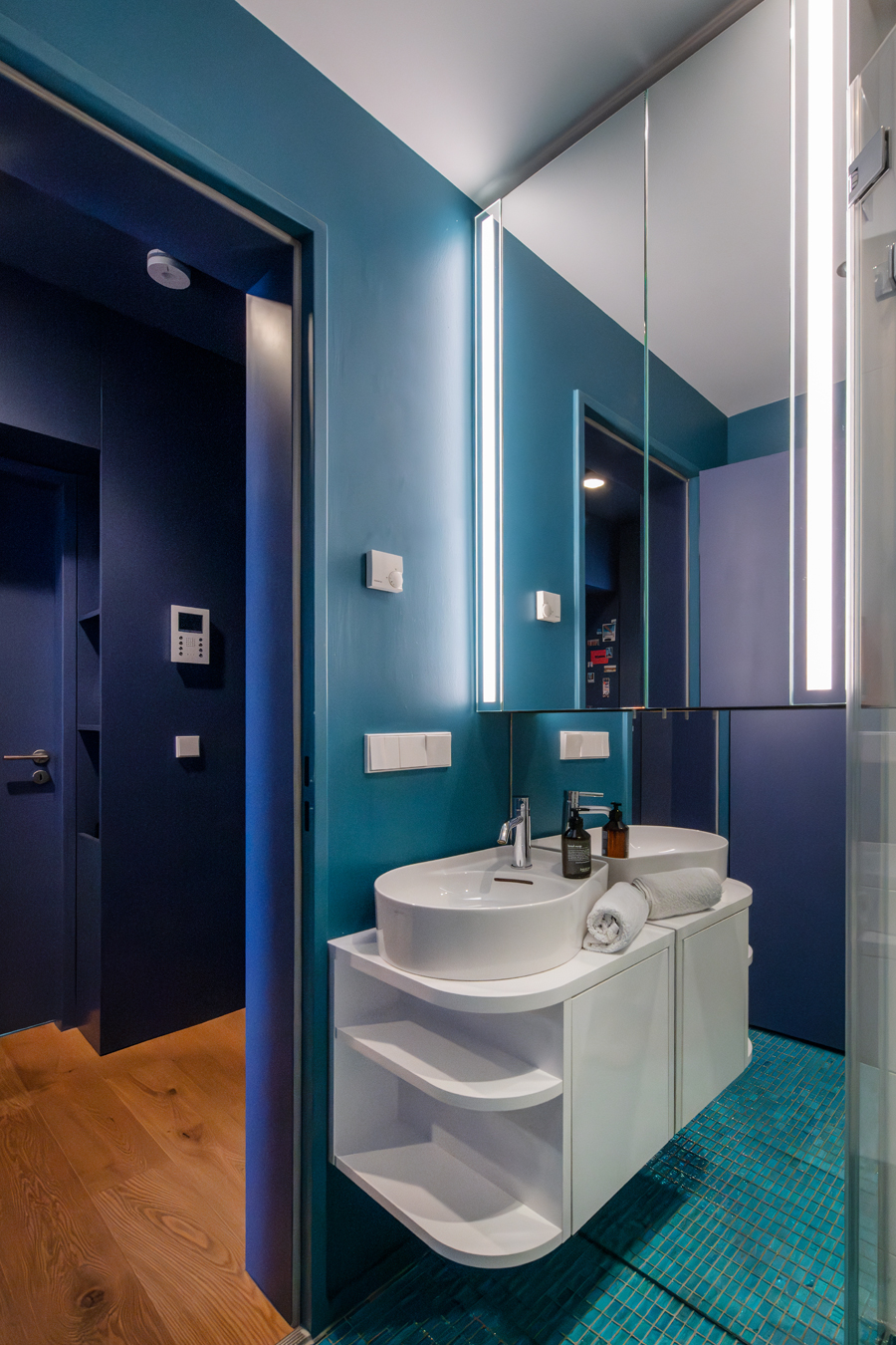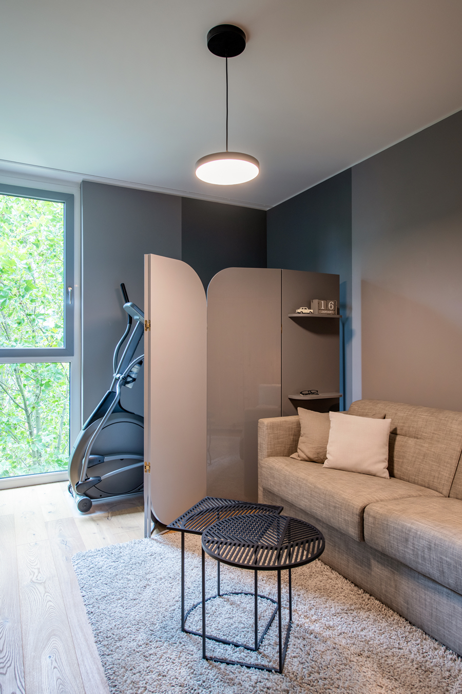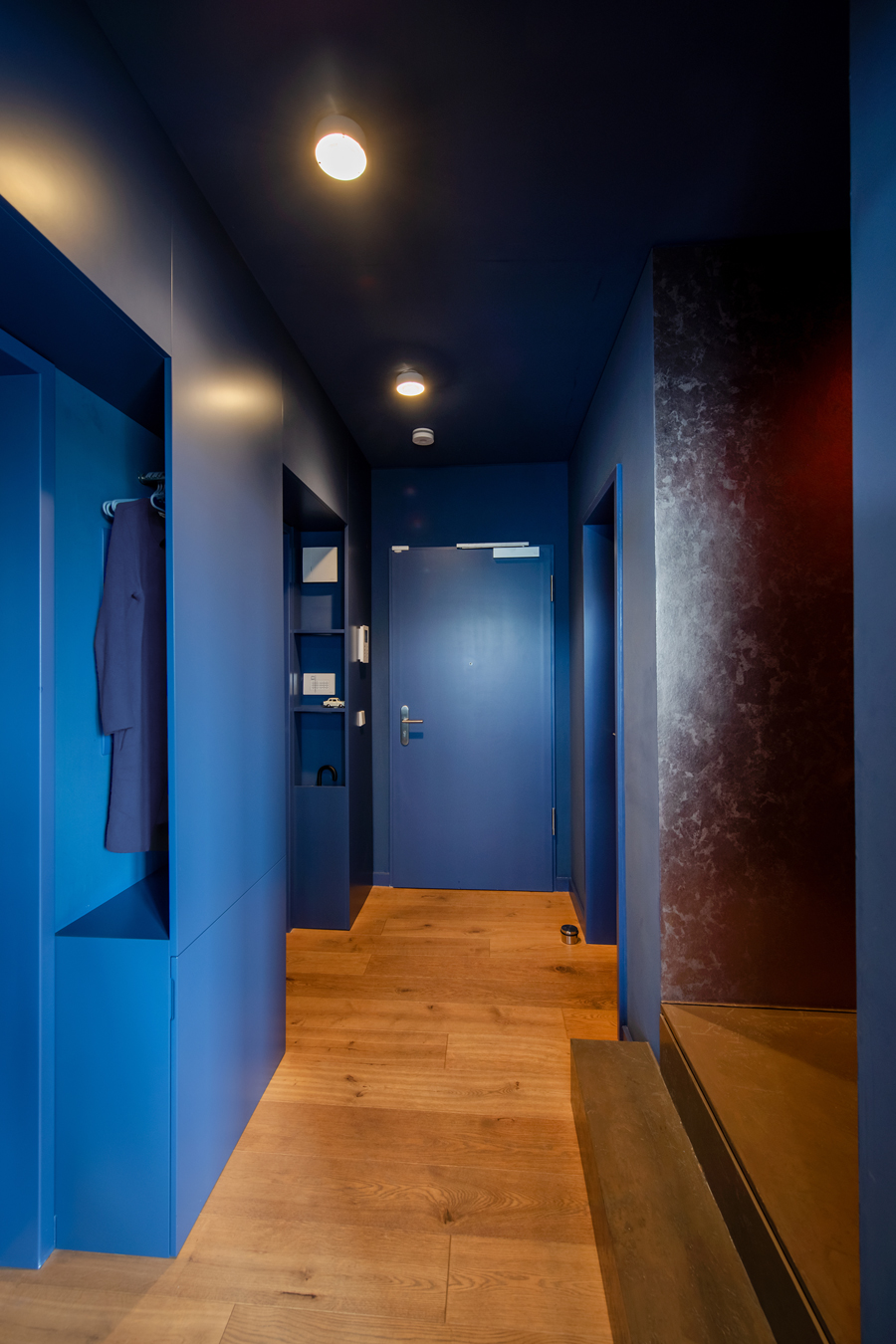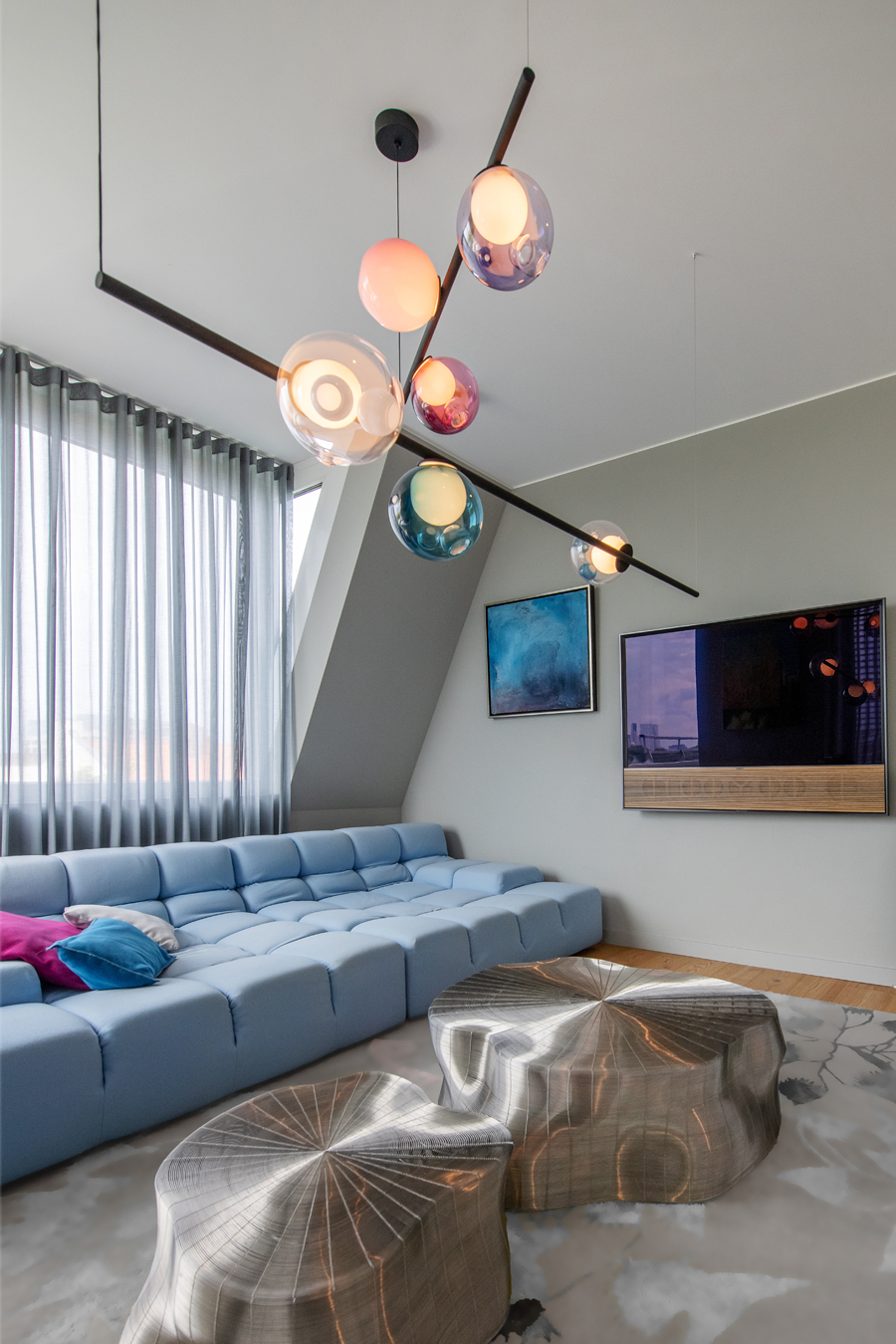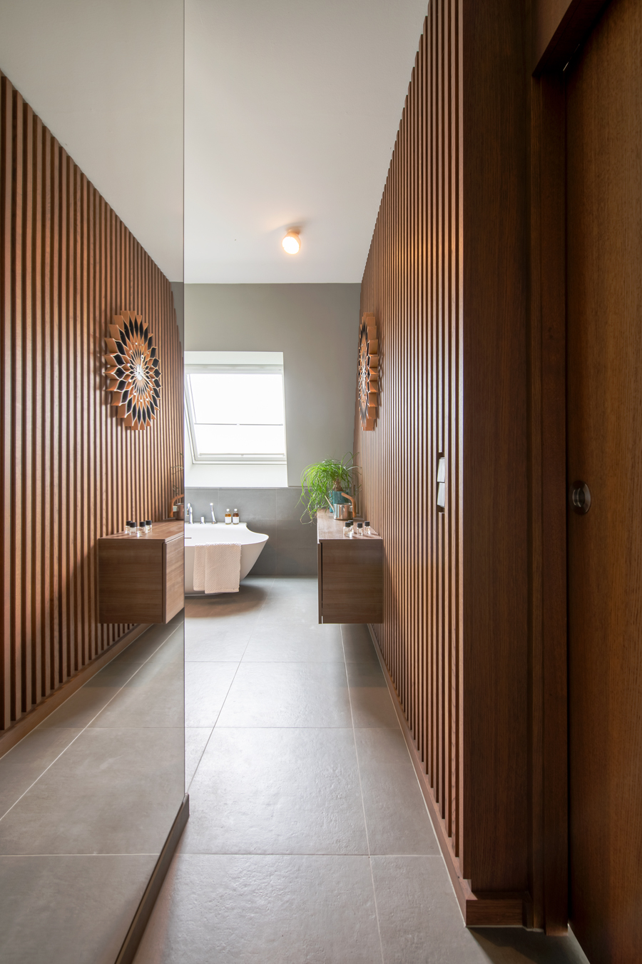 Die bestehende Qualität zu erkennen, respektvoll zu ergänzen und neue, passende Elemente zu finden ist hier die Aufgabe. Der leuchtend farbige Anstrich im kleinen Gäste WC bewirkt ein ganz neues Raumerlebnis. Im großen Bad sorgen nun eine Lamellenwand und natürliche Materialien für gute Akustik und wohnliche Atmosphäre. Das Wohnzimmer mit offenem Koch-/Essbereich wirkt stimmig und gestaltet. Wandpaneele in Betonoptik schaffen einen charaktervollen Hintergrund für die exquisite Einrichtung der Bewohner. Vorhänge sorgen für Wohnlichkeit und zusammen mit der Lamellenwand am Esstisch für entspannte Akustik. Und die vergoldete Treppe mit ausdrucksstarkem Lichtobjekt sorgt nun für Begeisterung.