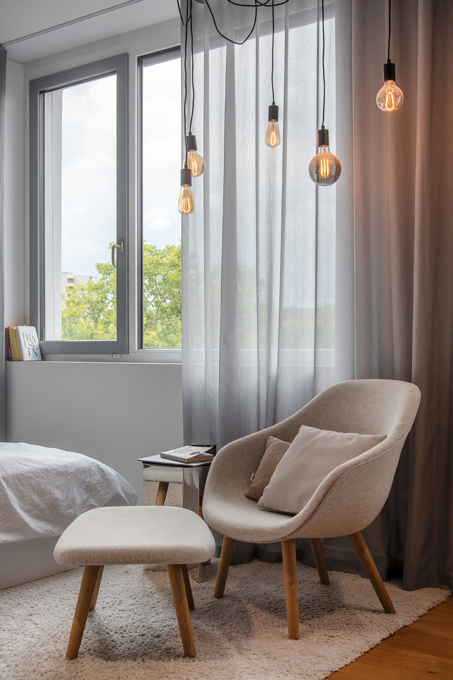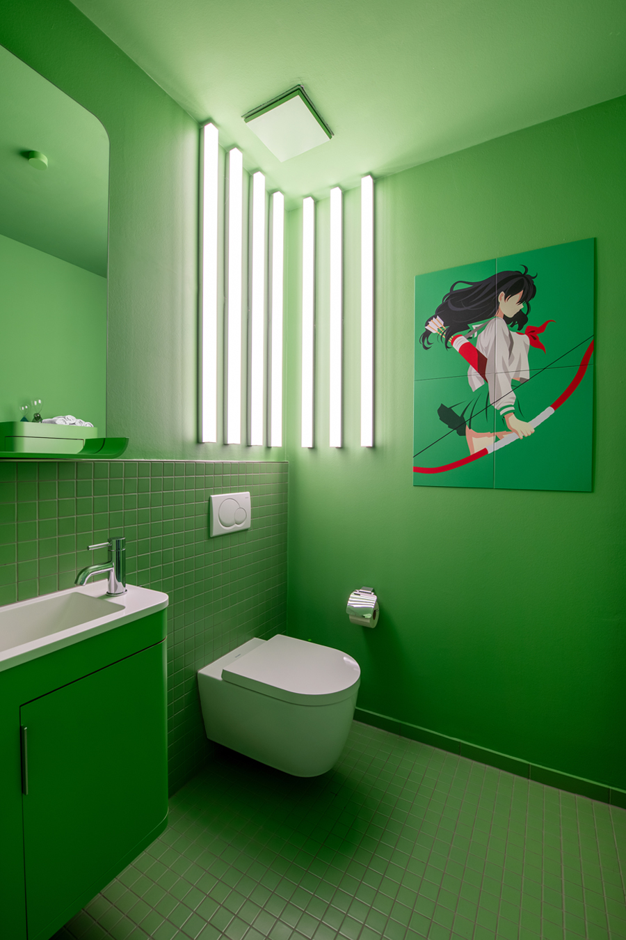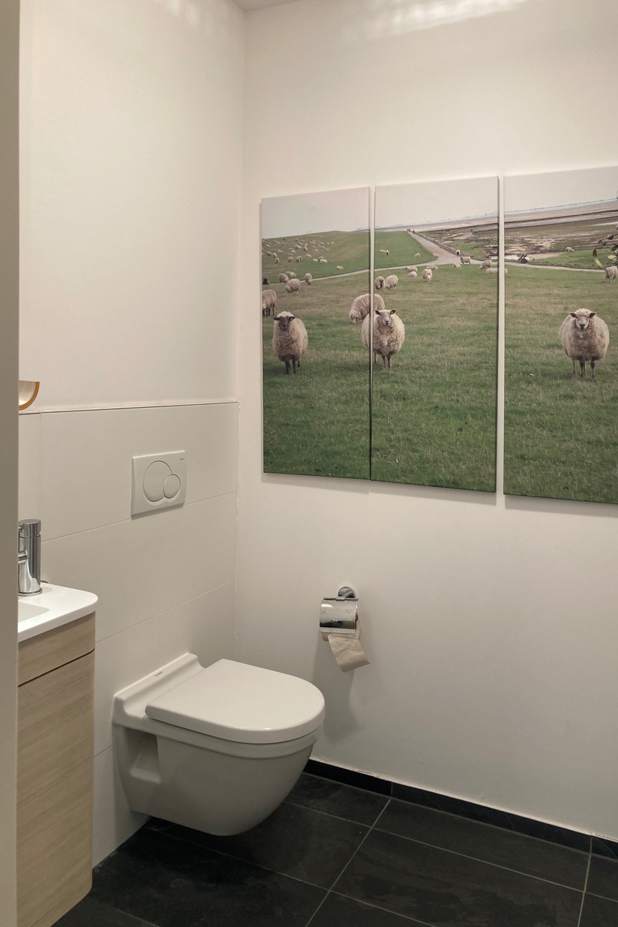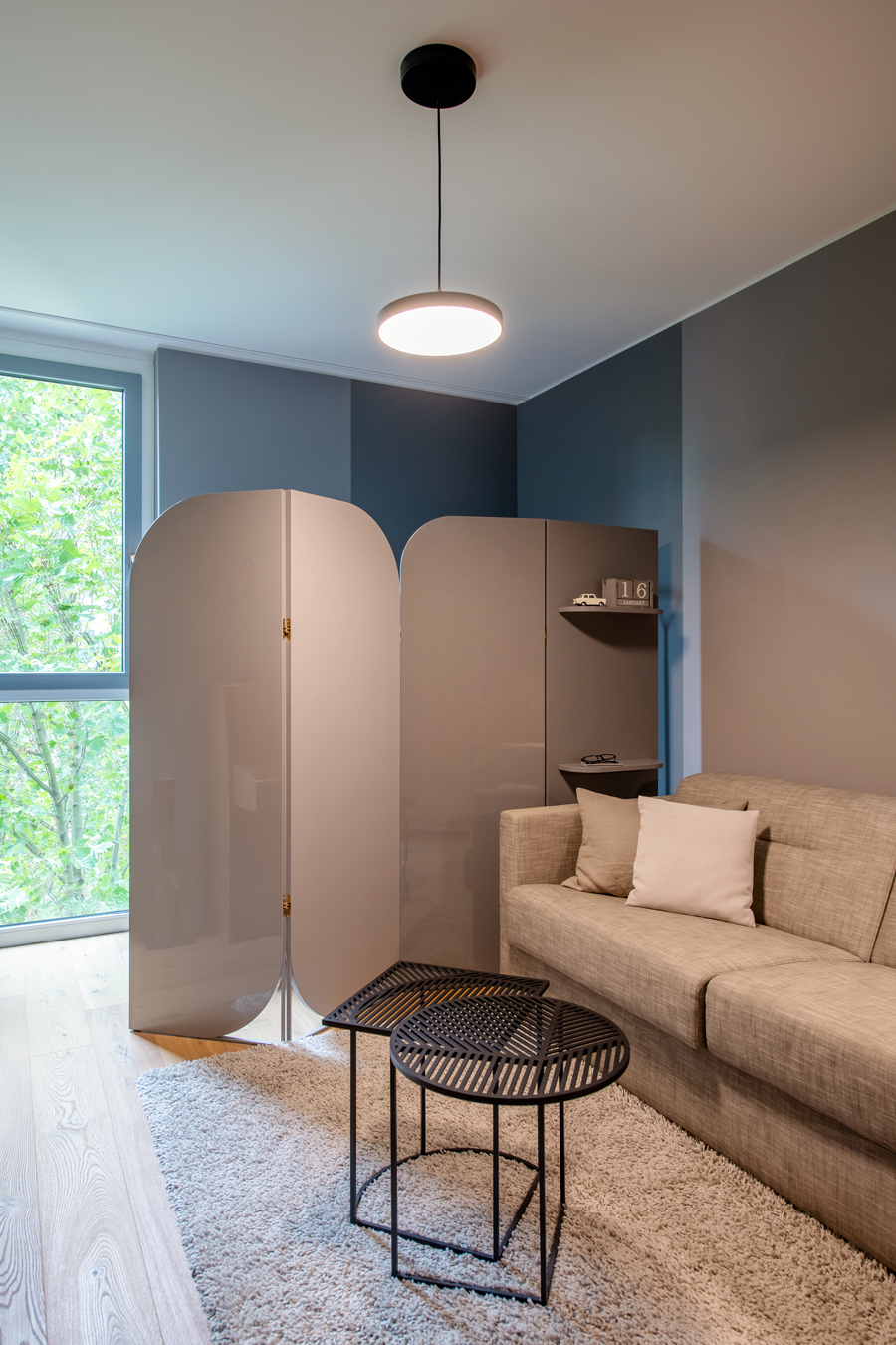 Die bestehende Qualität zu erkennen, respektvoll zu ergänzen und neue, passende Elemente zu finden ist hier die Aufgabe. Der leuchtend farbige Anstrich im kleinen Gäste WC bewirkt ein ganz neues Raumerlebnis. Im großen Bad sorgen nun eine Lamellenwand und natürliche Materialien für gute Akustik und wohnliche Atmosphäre. Das Wohnzimmer mit offenem Koch-/Essbereich wirkt stimmig und gestaltet. Wandpaneele in Betonoptik schaffen einen charaktervollen Hintergrund für die exquisite Einrichtung der Bewohner. Vorhänge sorgen für Wohnlichkeit und zusammen mit der Lamellenwand am Esstisch für entspannte Akustik. Und die vergoldete Treppe mit ausdrucksstarkem Lichtobjekt sorgt nun für Begeisterung.