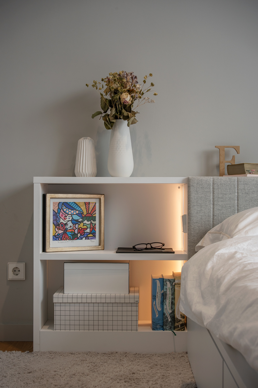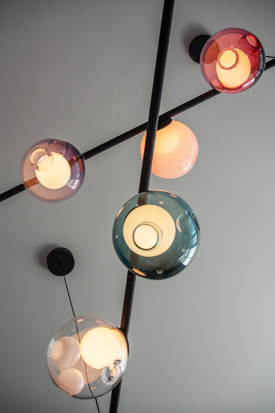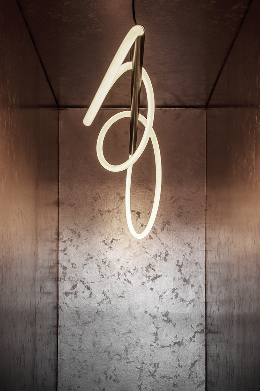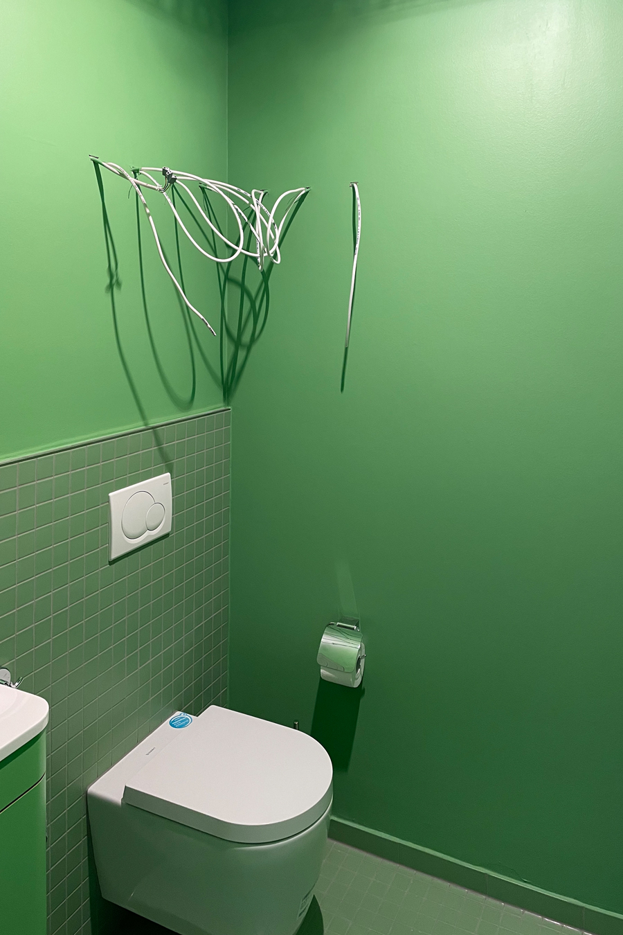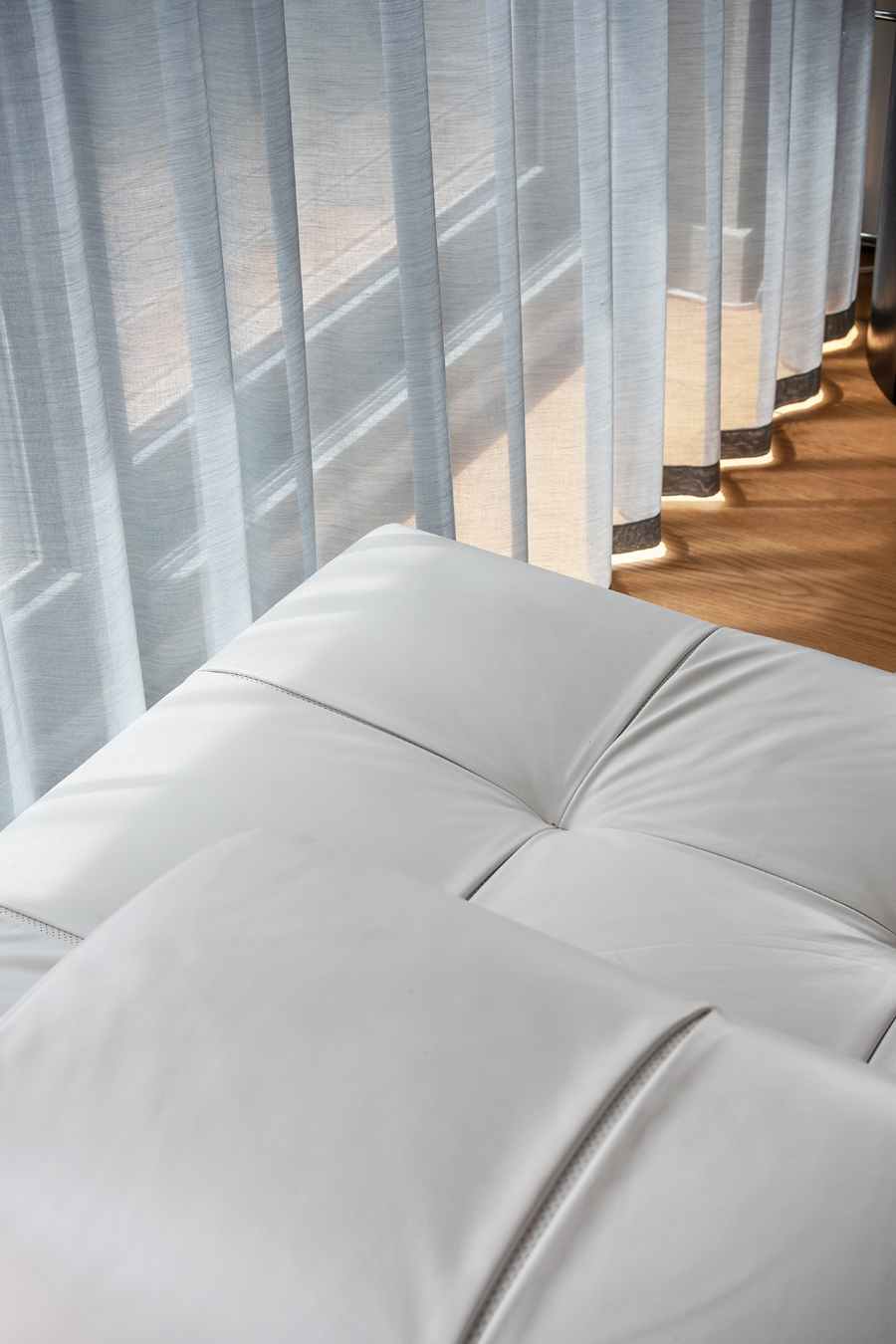 Die bestehende Qualität zu erkennen, respektvoll zu ergänzen und neue, passende Elemente zu finden ist hier die Aufgabe. Der leuchtend farbige Anstrich im kleinen Gäste WC bewirkt ein ganz neues Raumerlebnis. Im großen Bad sorgen nun eine Lamellenwand und natürliche Materialien für gute Akustik und wohnliche Atmosphäre. Das Wohnzimmer mit offenem Koch-/Essbereich wirkt stimmig und gestaltet. Wandpaneele in Betonoptik schaffen einen charaktervollen Hintergrund für die exquisite Einrichtung der Bewohner. Vorhänge sorgen für Wohnlichkeit und zusammen mit der Lamellenwand am Esstisch für entspannte Akustik. Und die vergoldete Treppe mit ausdrucksstarkem Lichtobjekt sorgt nun für Begeisterung.
