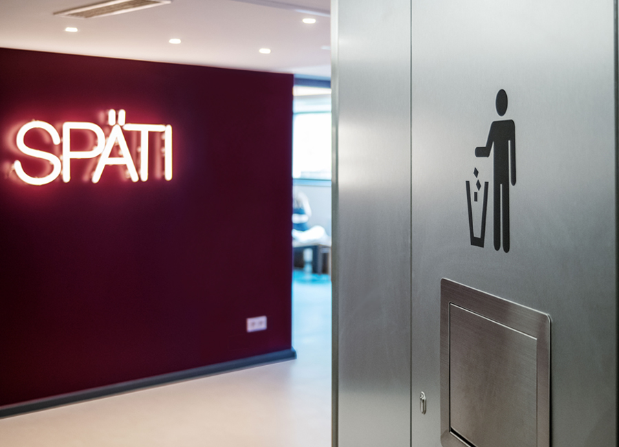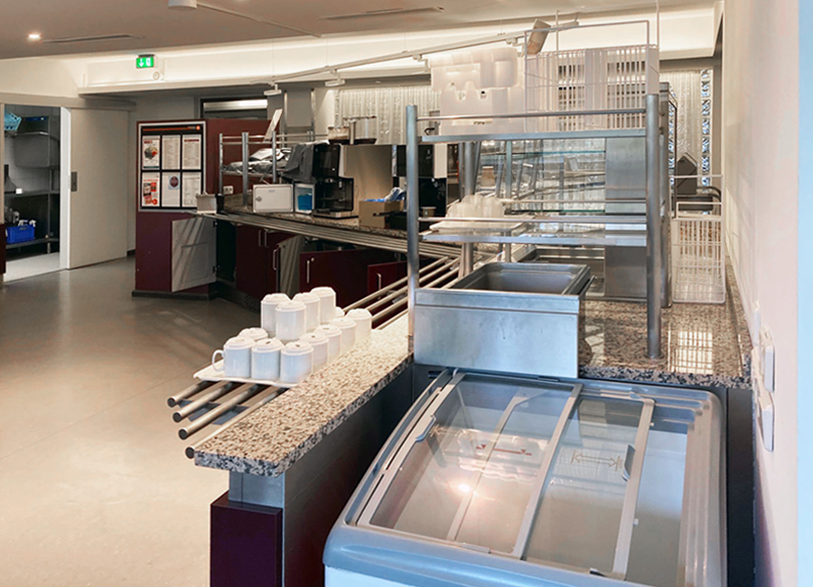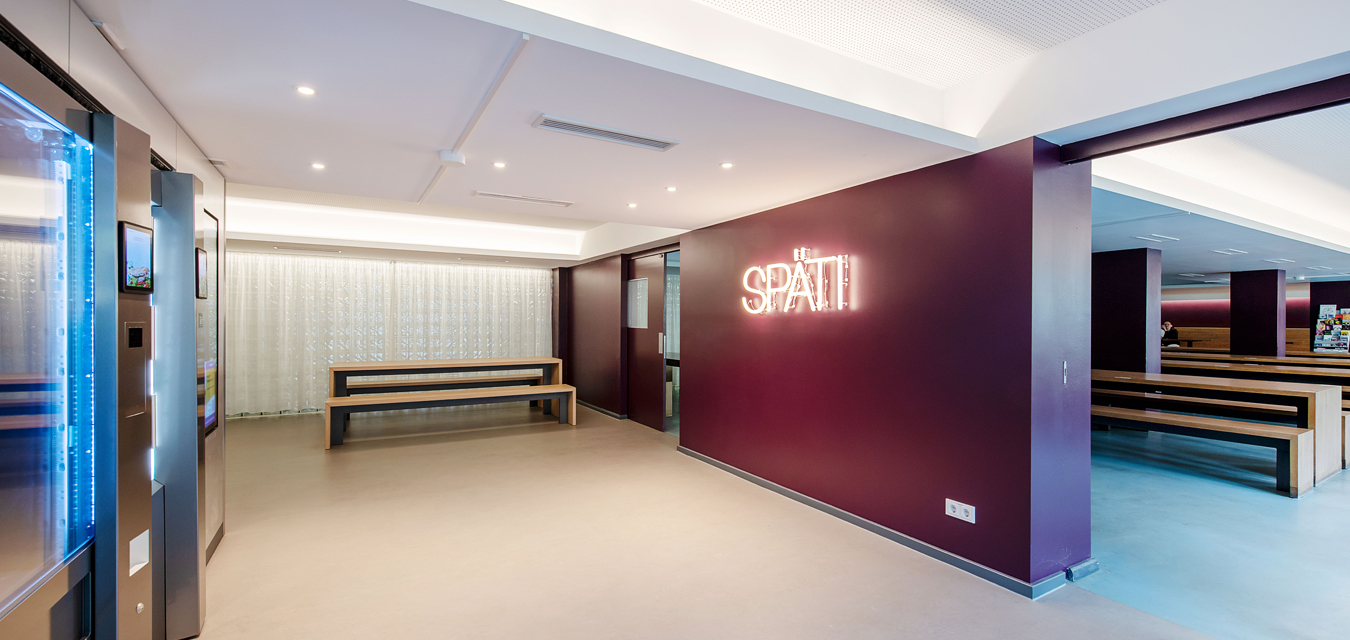 ...Vorhänge für entspannte Akustik und großzügige Bänke laden zum Verweilen ein. Die Gestaltung lehnt sich an den angrenzenden Aufenthaltsraum an, indem man sich trifft, lernt oder auch stärkt und ausruht. Die gekühlten warmen Speisen werden täglich frisch von der naheliegenden Mensa bestückt und können dann hier in der Mikrowelle aufgewärmt werden, alles natürlich auch über App als reservierte Vorbestellung möglich. Also natürlich ein bisschen mehr als beim Späti ums Eck ;-)