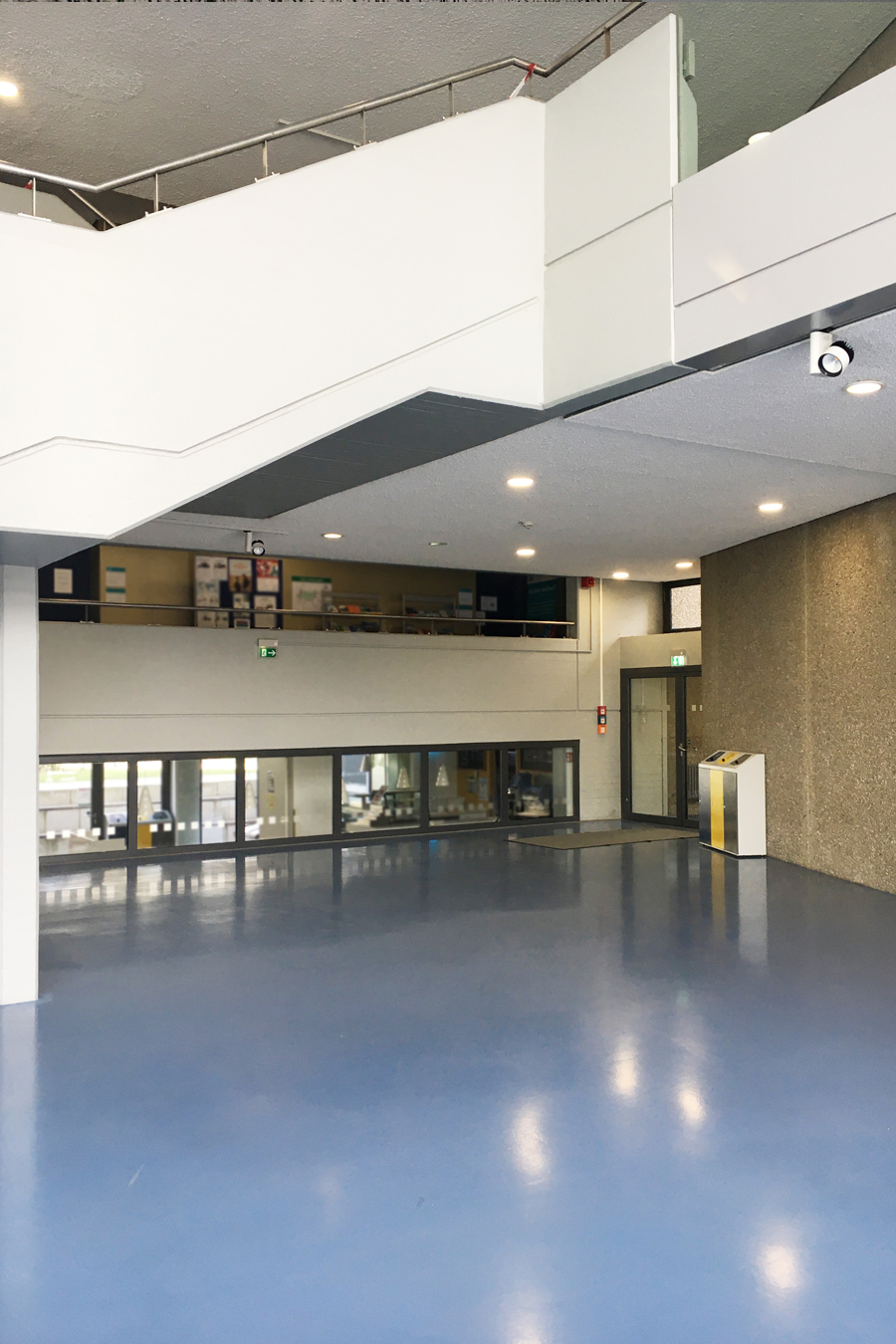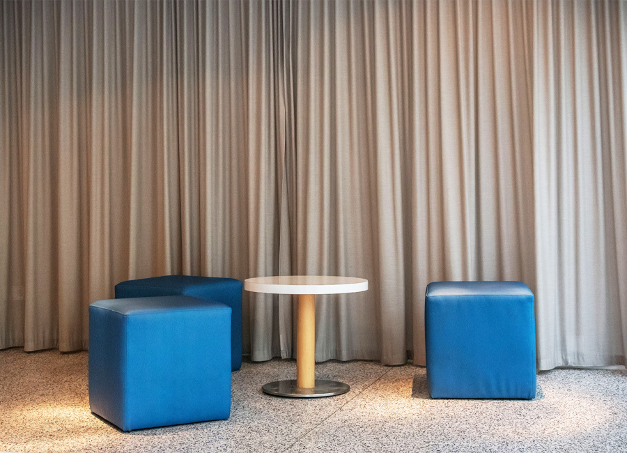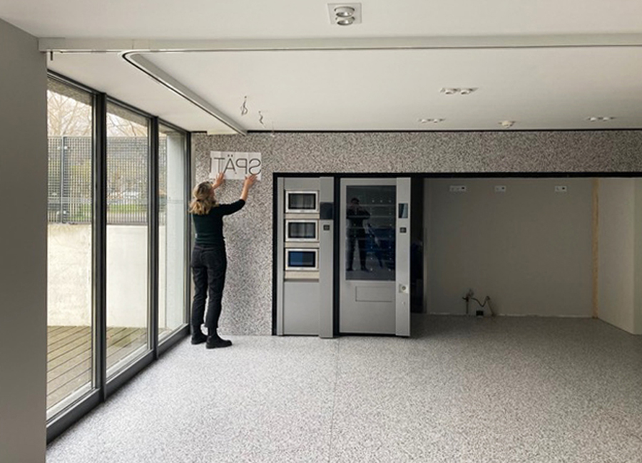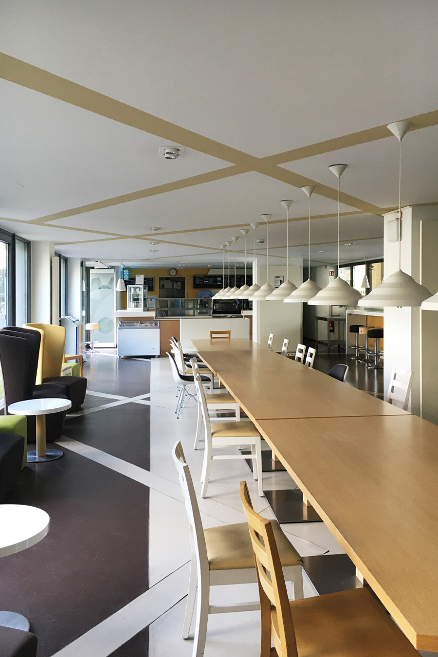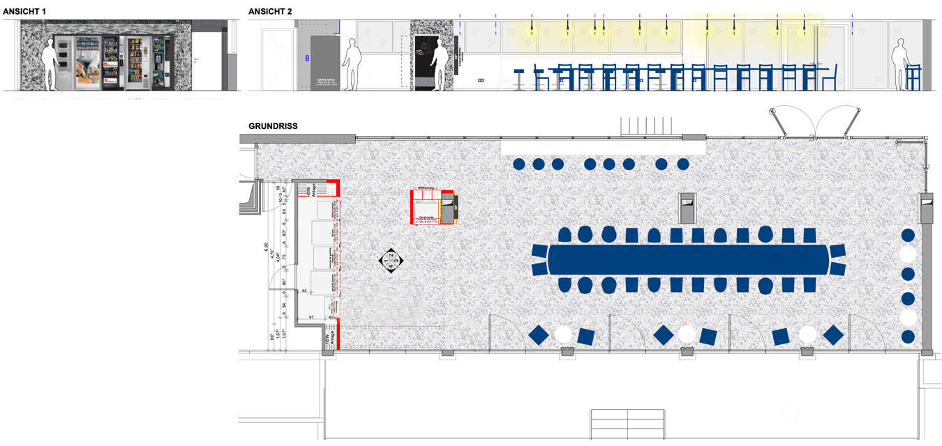 Der Bodenbelag muss erneuert werden und findet nun auch seine Fortsetzung in der Front der Automatenwand. Hier gibt es kalte und warme Getränke, Snacks und warme Speisen. Diese warmen Gerichte, täglich frisch in der Mensa zubereitet, werden gekühlt vorgehalten und können dann in den Mikrowellen aufgewärmt werden, Buchung, Reservierung und Bezahlung per App. Alles natürlich in Mehrwegverpackung mit Geschirr- und Pfandrücknehmern in der Automatenwand. Üppige Vorhänge an allen Wandflächen und vor den bodentiefen Fenstern zum begrünten Hof sorgen für entspannte Akustik. Eine lange Tafel aus recycelten Bestandsmöbeln und stimmungsvolle Beleuchtung sorgt für gemütliche Gastlichkeit.