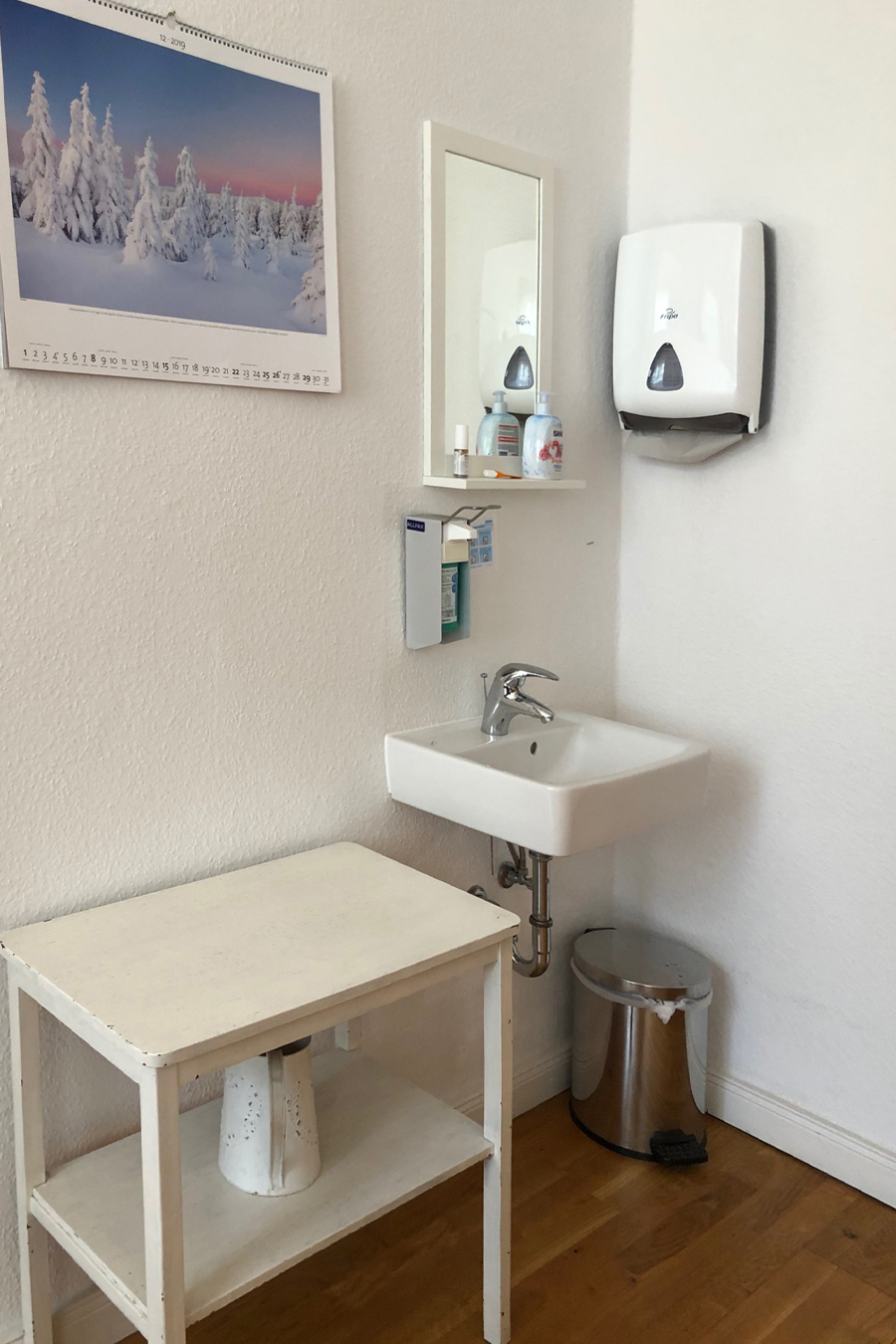 ...spiegeln die Qualität und die Frische der neuen Frau im Team wieder. Der Behandlungsbereich wird optimal den Arbeitsabläufen der Behandlung angepasst. Ein seitlicher Paravent schafft Intimität beim Umziehen oder bei der Untersuchung. Am Arbeitsplatz kann in angenehmer Atmosphäre gesprochen und beraten werden, ein leichter Pouf bietet Platz auch für größere Familien. Die frischen Blau- und Grüntöne korrespondieren mit dem kleinen Park vorm Haus und lassen den frischen Wind förmlich spüren.