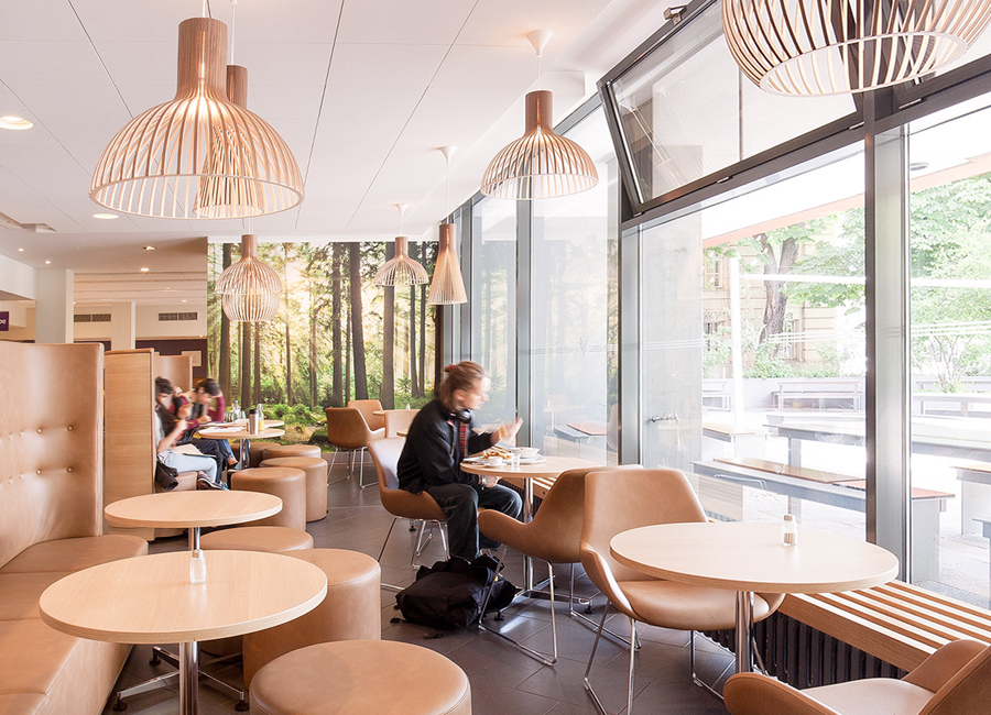 Die erste, rein vegane Mensa in Deutschland! Veganes Essen, dazu frisch gepresste Smoothis an der Bar am Eingang. Natürliche Farben, viel Holz, gemütliche Bänke mit Kunstlederbezug und ein wandfüllendes Waldmotiv schaffen eine harmonische Atmosphäre und verbinden den Gastbereich mit dem grünen Außenraum hinter großen Panoramafenstern...