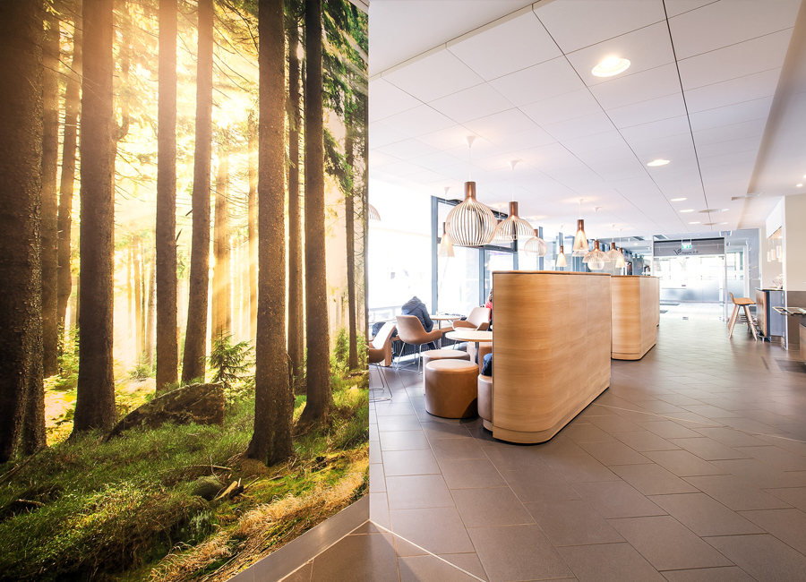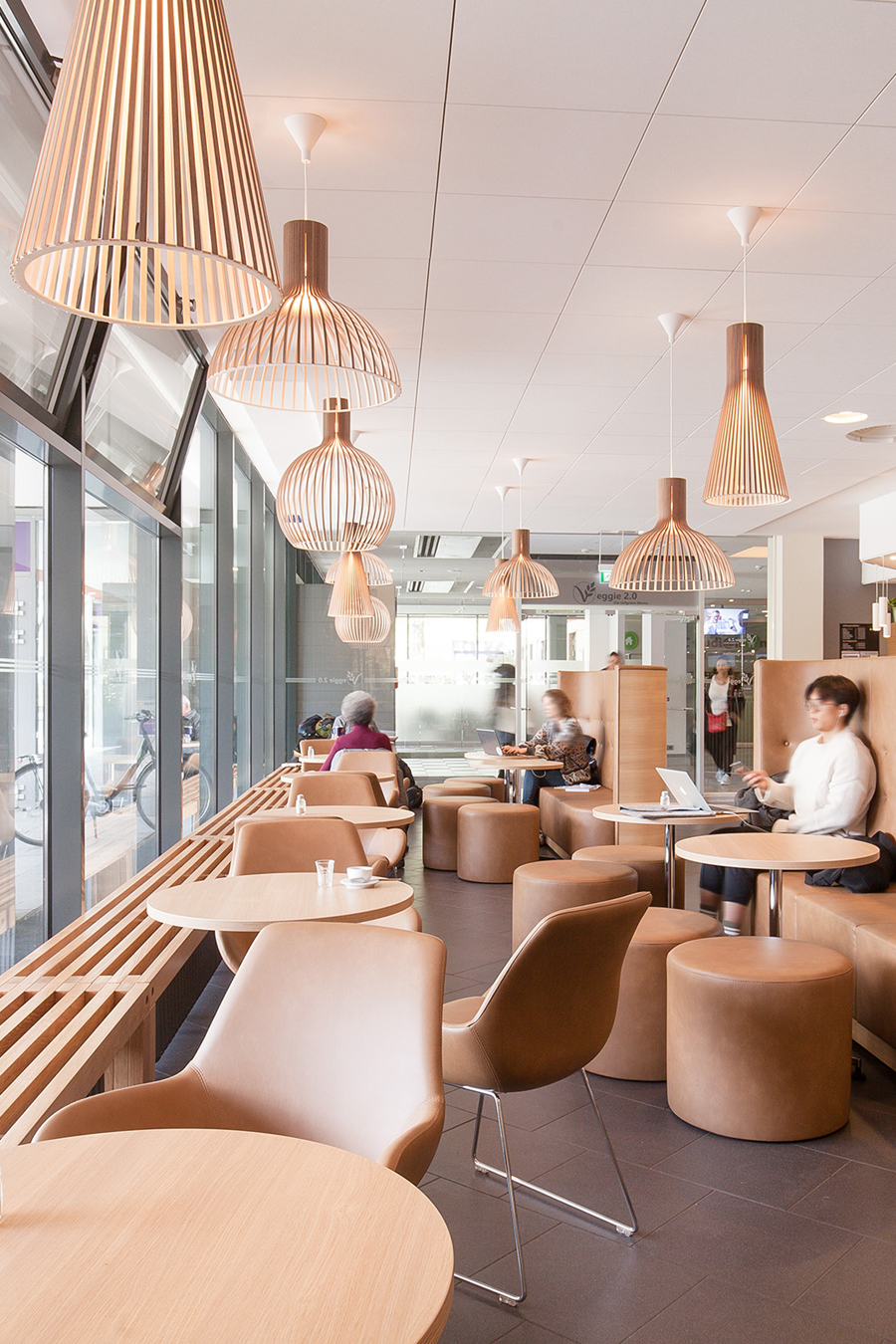 Die bereits bestehende Speisenausgabe wird nachhaltig „aufgefrischt“. Nur die Fronten der Ausgabetresen werden ausgetauscht, die in die Jahre gekommenen Fliesen im Hintergrund durch einen Anstrich dem neuen Konzept angepasst. Neue Deckenpaneele im Gastraum sorgen für Ruhe und damit Wohnlichkeit. Die Pendelleuchten mit dekorativen Holzschirmen über den flachen Tischen am Fenster verstärken die entspannte Atmosphäre. Ein ganzheitliches Konzept, vom veganen Speisenangebot über nachhaltig revitalisierte Ausgabetresen bis zur harmonischen, natürlichen Gastraumgestaltung.