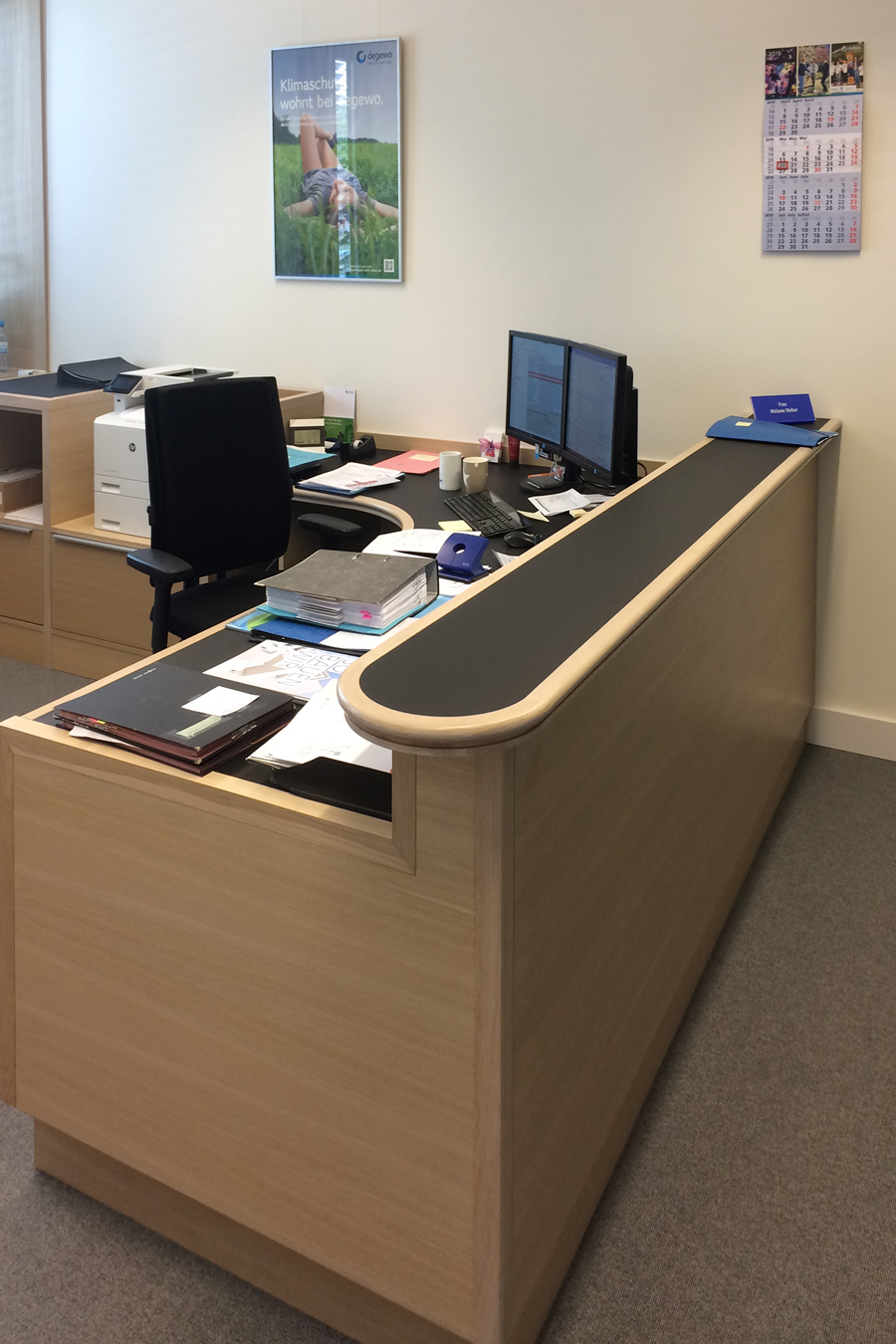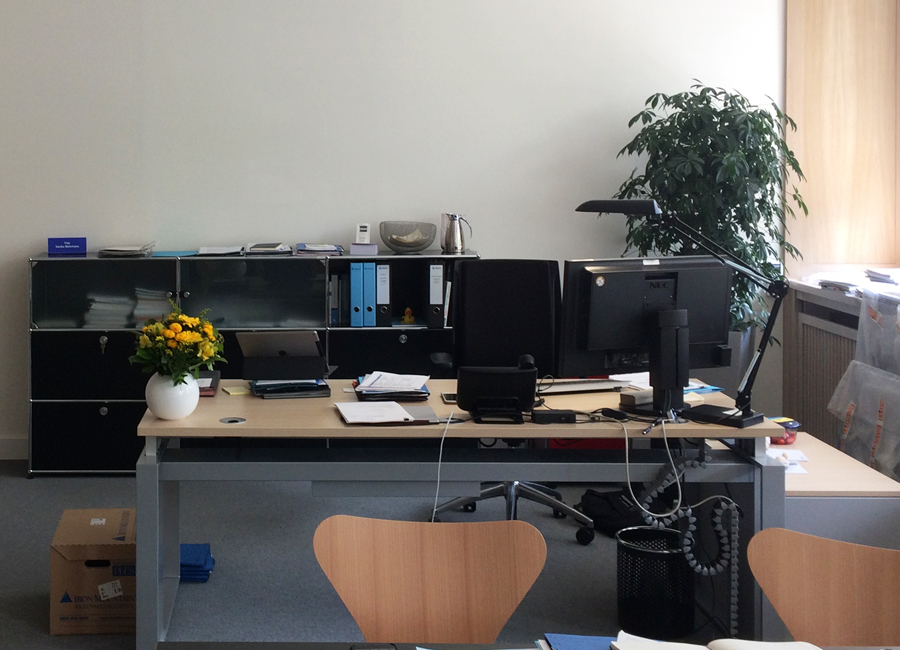 Schon das Sekretariat ist nun strukturiert, funktional und vermittelt am vorgelagerten Tresen Ansprechbarkeit und Kompetenz. Das Büro erscheint einladend und nahbar, weiche Oberflächen sorgen für entspannte Akustik. Im seitlichen Einbaumöbel verbergen sich Arbeitsmaterialien, kleine Bewirtungsmöglichkeiten und ein Kleiderschrank mit Schminkplatz. Auch ein Platz für Sicherheitskleidung oder verdreckte Schuhe nach dem Einsatz an der Basis ist vorhanden. Ein ausklappbarer Stehtisch lädt zum schnellen, konstruktiven Gespräch ein. Die helle, aufgeräumte und einladende Gesamtatmosphäre spiegelt die gewünschten Prioritäten des Vorstands wieder.