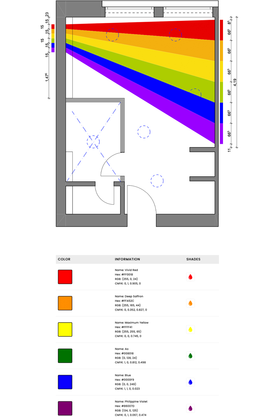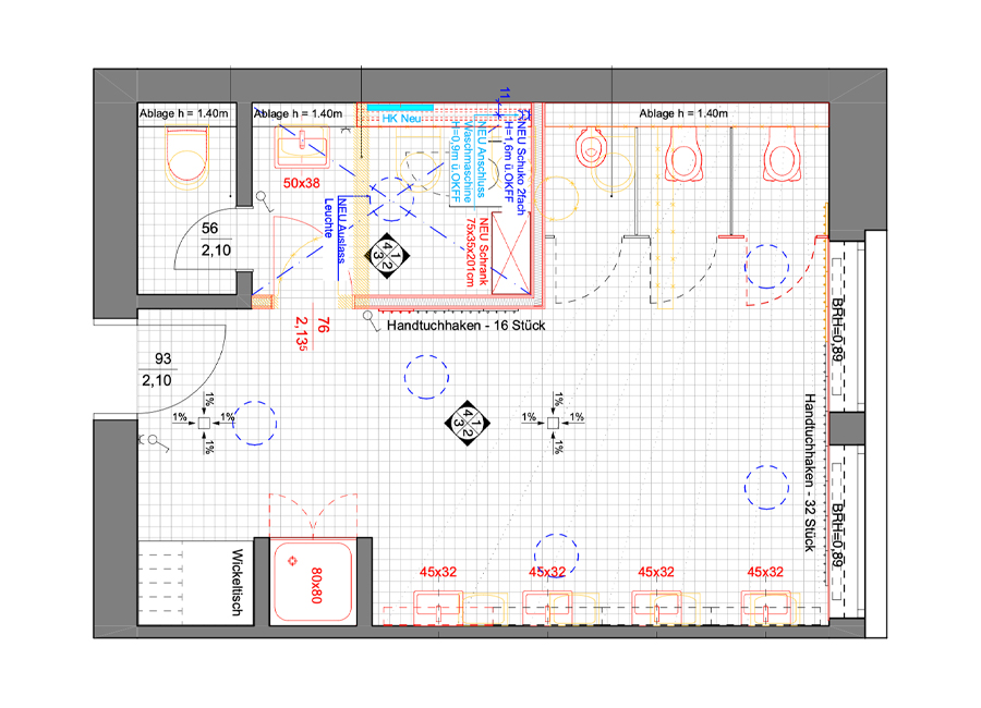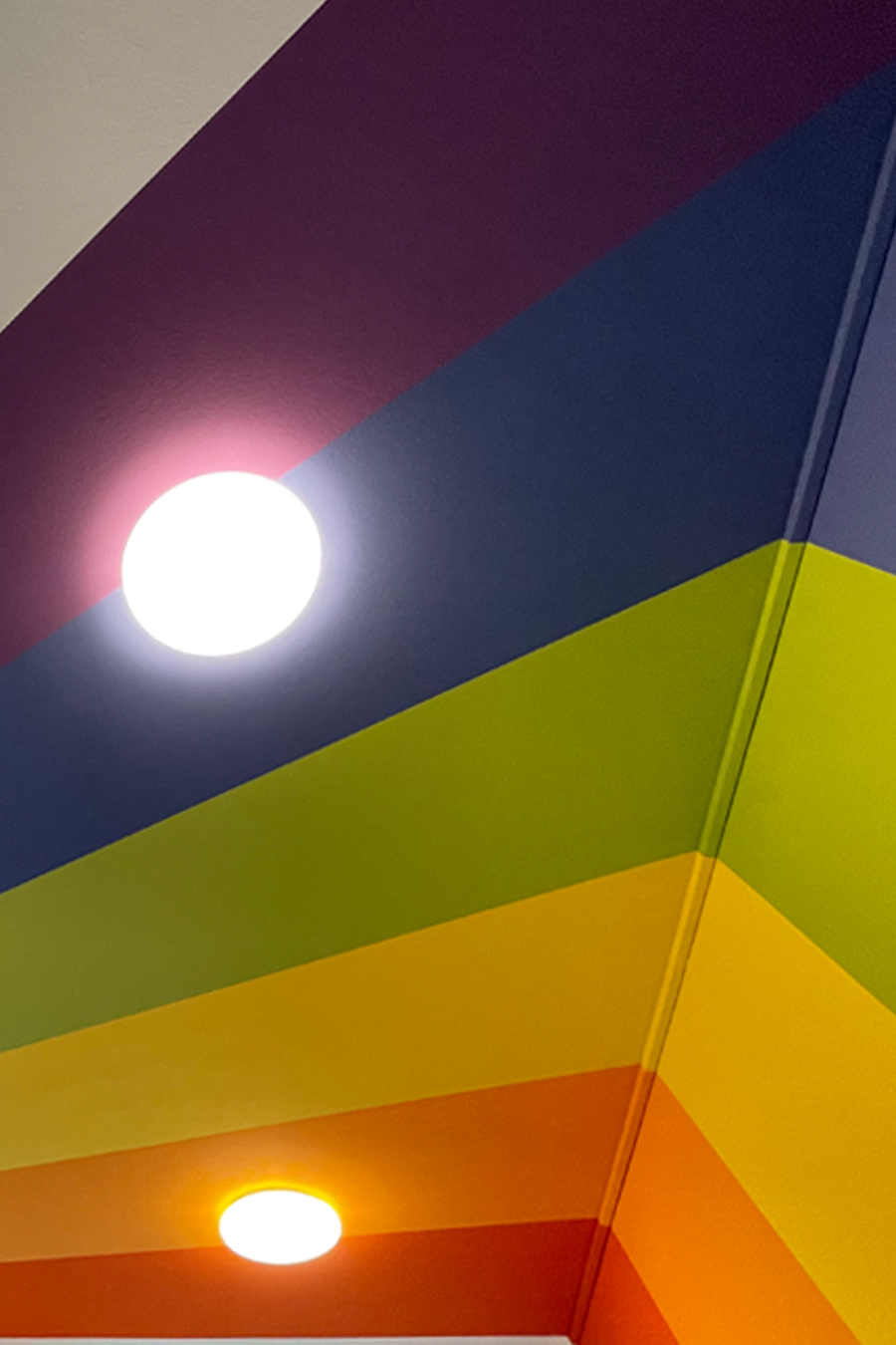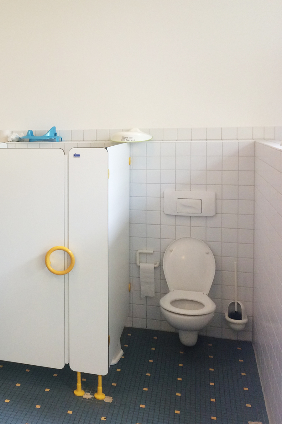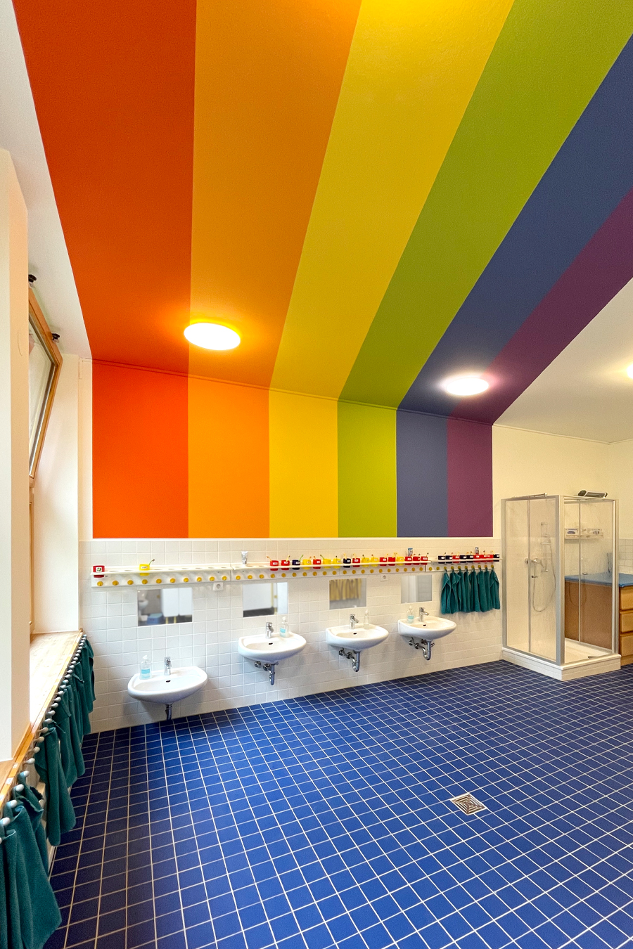 Zuerst muss die Funktion angepasst werden. Die Wäscheaufbereitung erhält einen eigenen Raum, der mit dem Personalbereich verknüpft wird. Dadurch werden die kleinen WC und ihre Kabinen ein wenig verschoben. Die Fliesen hinter den Waschtischen erhalten einen frischen Anstrich, die Bodenfliesen werden erneuert. Eine neue Dusche wird installiert. Soweit die Pflicht, die Kür ist die kindgerechte Gestaltung. Ein überdimensionaler, aufgemalter Regenbogen, der sich von der einen Wand über die gesamte Decke bis zur gegenüberliegenden Wand erstreckt erzählt die Geschichte von Wassertropfen, die sich im Sonnenlicht in leuchtend bunte Streifen verwandeln.