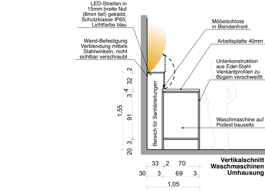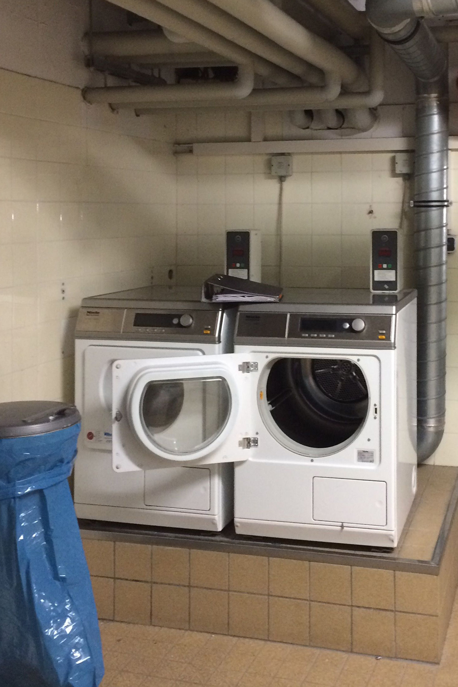 Schon der Weg in den Keller ist deutlich und international lesbar ab dem Hauseingang ausgeschildert. Das schafft Sicherheit und Wohlbefinden. Der kleine Raum selbst ist gut strukturiert und übersichtlich. 11 Waschmaschinen und 4 Trockner können per App ausgewählt und überwacht werden. Die reversible Umbauung sichert die technischen Anschlüsse und verhindert Müll und Wäschestücke zwischen und hinter den Maschinen. Ein Dosiergerät im Nebenraum sorgt für saubere Maschinen und immer das richtige Waschmittel. Und weil es so schön ist, lädt eine farbenfrohe Sitzgruppe im Raum zum Verweilen oder Warten ein.